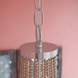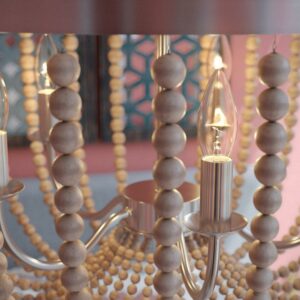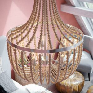 From the free flow of wooden beads to the sleek brushed steel inner frame, this 5-light chandelier is full of natural, organic beauty and will help shine a light on your chill and carefree design philosophy. This charmingly casual chandelier defies convention by featuring lightly distressed white wood beads artfully strung and suspended from a contemporary brushed steel frame. Five candelabra lights create a warm, atmospheric glow perfect for welcoming your guests to your boho coastal home in your grand entryway. The soft, organic look is also expertly suited for bedrooms, dining rooms, entryways and reading nooks, complements a wide variety of styles including bohemian, natural modern, contemporary, rustic, and coastal design.