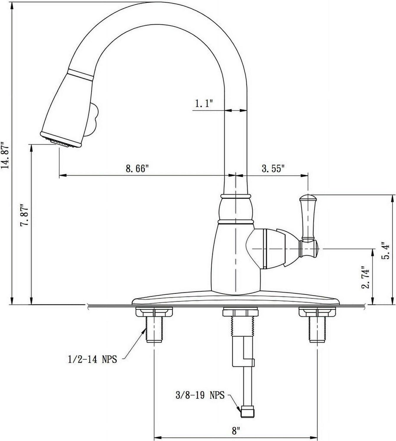 SPECIFICATIONS | This faucet is 14.8 tall, but this height can be extended with the sprayer in use so you can easily fill pots or clean dishes. Flow rate is 2 GPM. Lead-free, UPC and CUPC-Certified.