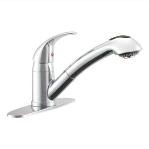 – Design: This faucet has a streamlined look, pull-out sprayer for complete sink access, heavy duty metal construction, solid zinc lever handle, and a sturdy ceramic disc valve.