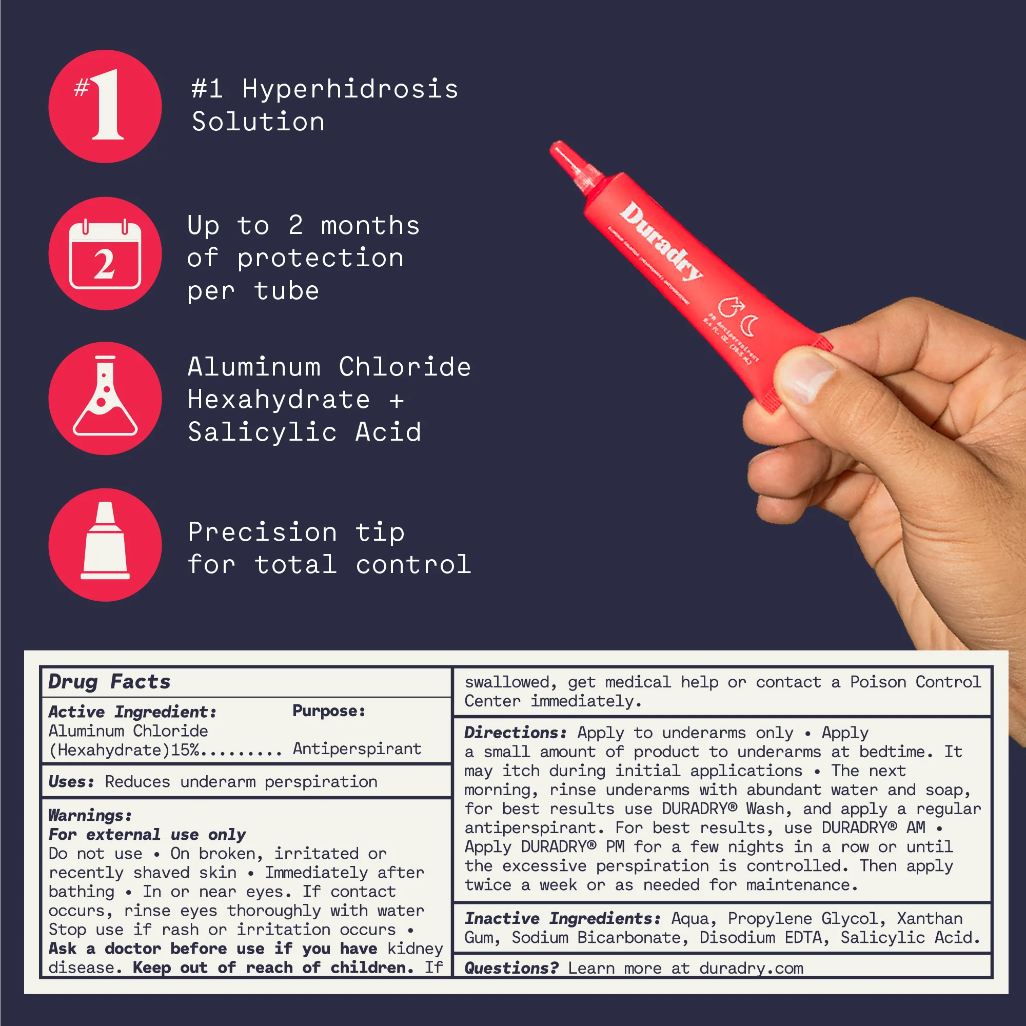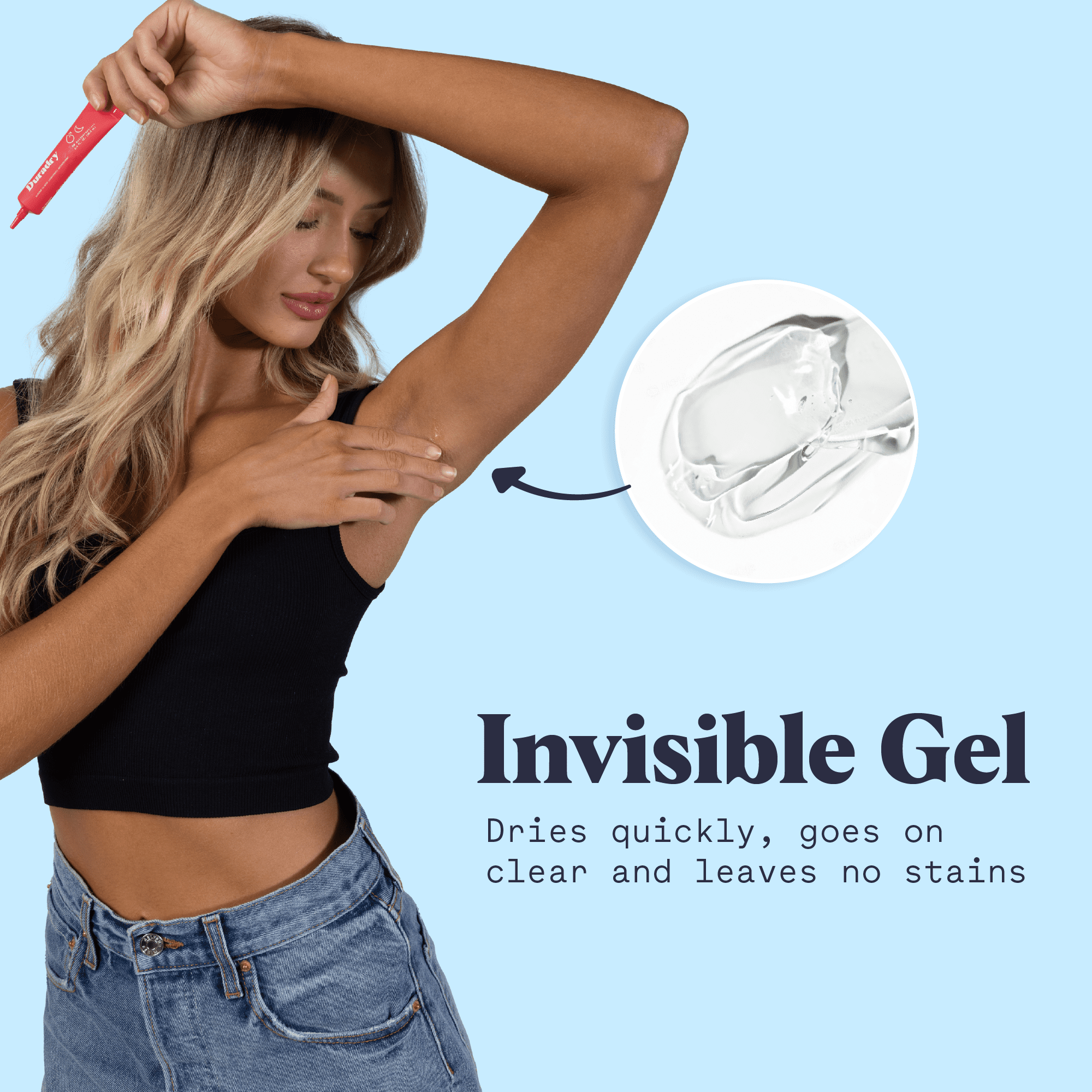 Conquer armpit sweat with Duradry PM, a clinical strength antiperspirant gel formulated with 15% Aluminum Chloride Hexahydrate and Salicylic Acid. Achieve stain-free confidence with a seamless application at bedtime. Stay odor-free on the go with the no-leak tube. Each tube provides up to 8 weeks of uninterrupted protection. Dermatologist recommended and optimized when paired with Duradry AM stick deodorant, it’s the tried-and-true solution for underarm sweat control.
