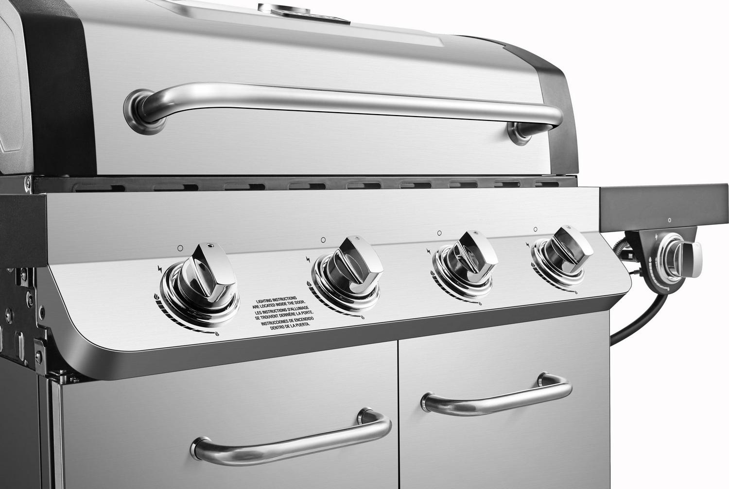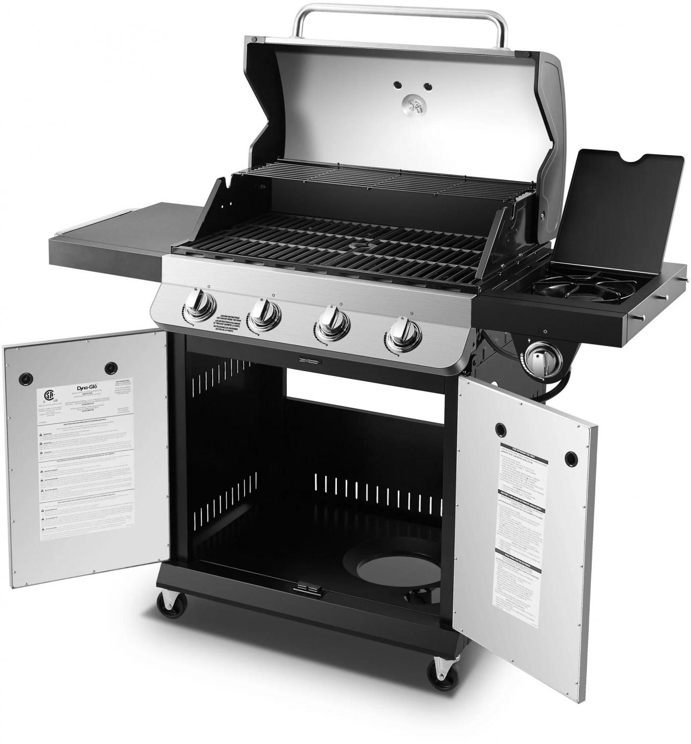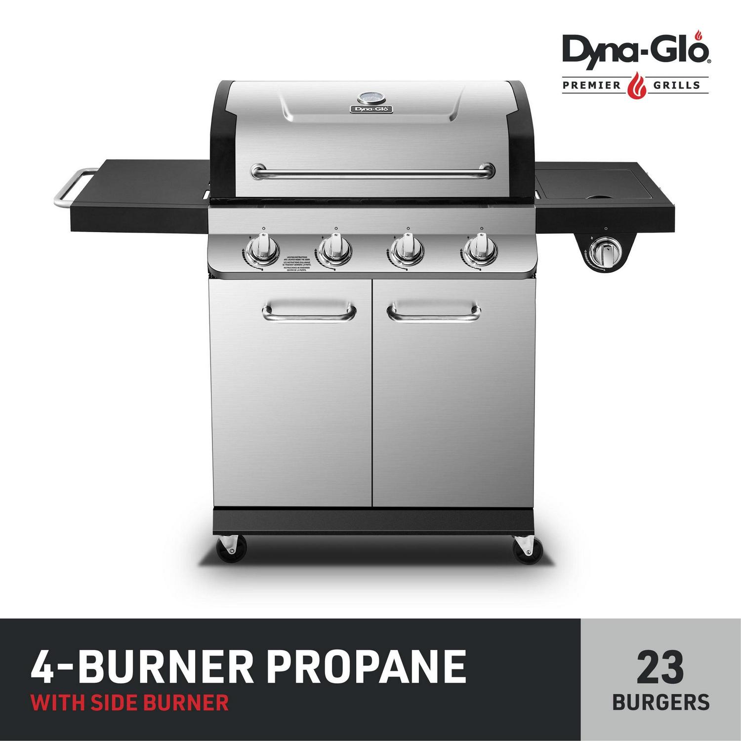 Install the ultimate barbecue station in your backyard with the 4 Burner Premier Propane Stainless Steel Gas Grill from Dyna-Glo. The options are limitless with this grill s combination of cooking power, quality construction, and features that simplify your grilling experience. With optimal cooking space and heating power, you can deliver a multi-course meal for your family and friends at your next backyard cookout. The easy-to-use integrated ignition system makes start-ups a breeze. Achieve restaurant-quality sear marks when you cook on this grill s cast iron cooking grates. Move your grill hassle-free to the ideal cooking spot or into storage with its four caster wheels. Upgrade your backyard or patio today with this sleek and powerful grill from Dyna-Glo, and become the BBQ boss you were always meant to be.