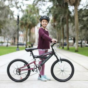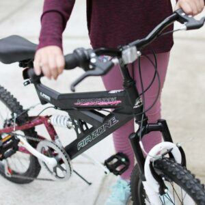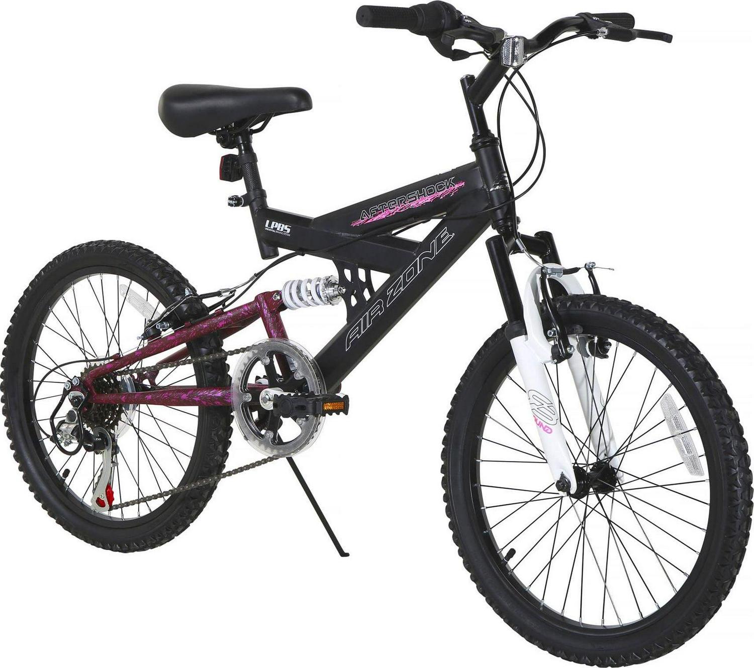Designed with adventurous young riders in mind, the 20-inch Air Zone Aftershock Dual-Suspension Youth Mountain Bike by Dynacraft features both front and rear suspension, making it perfect for tackling rough terrain. The six-speed grip shift lets riders easily switch gears, while the linear-pull brakes and front cog guard provide peace of mind and excellent control. Plus, with a quick-release seat post and solid steel kickstand, setup is a breeze. The black and pink paint finish adds a stylish touch to this already impressive bike. Get ready for some serious off-road fun with the Air Zone Aftershock!