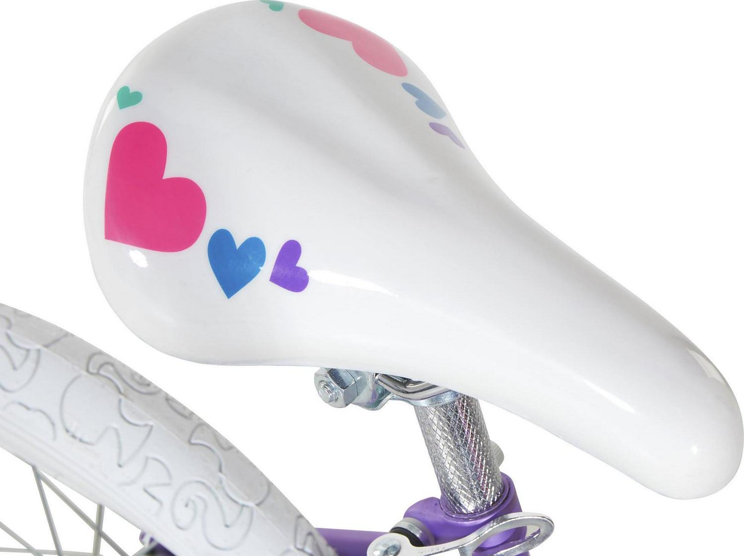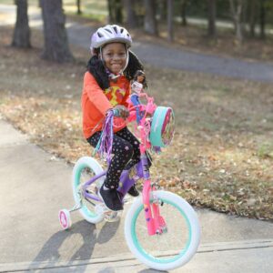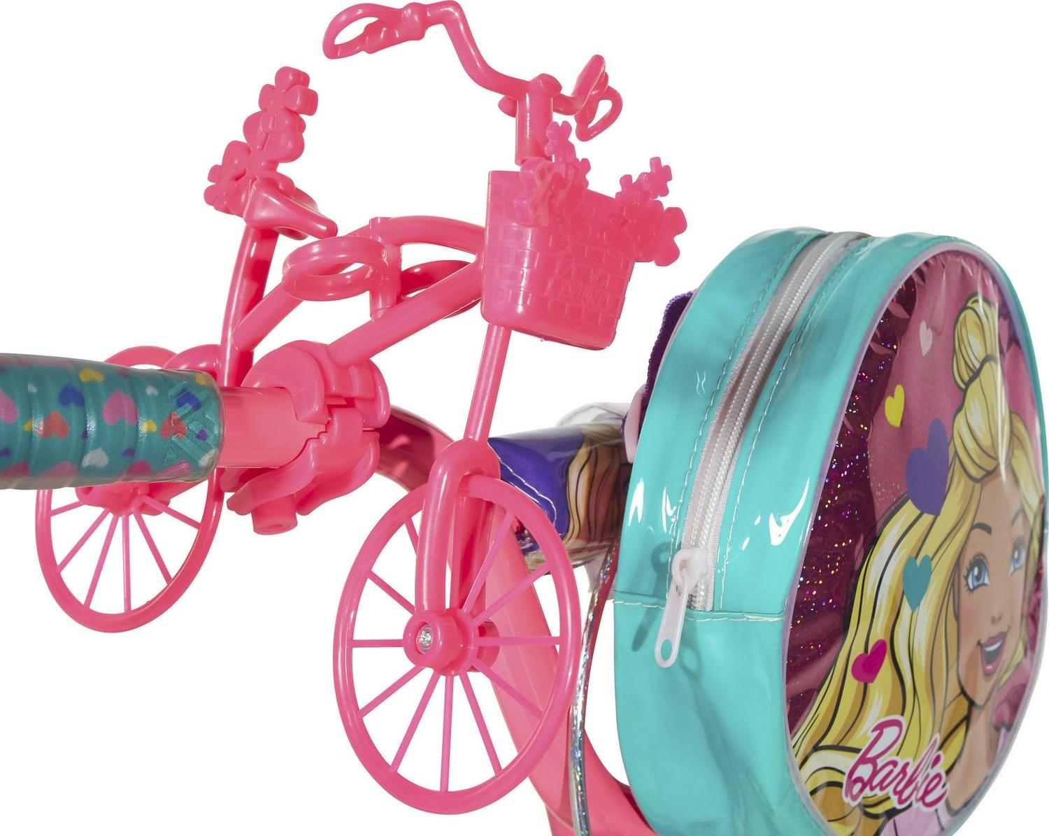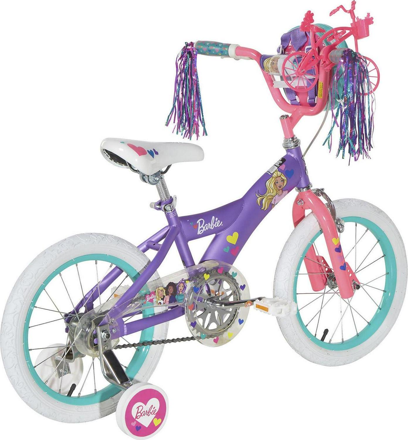 This Barbie 16-inch Girl’s Bike by Dynacraft is dressed to impress! With its sturdy steel frame and beautiful purple, pink, and teal deluxe paint finish, this bike is designed to draw a crowd. Safety is a top priority with this bike, which features a front-hand brake and a rear coaster brake for easy stopping, as well as removable, fully adjustable training wheels and a full chain guard. But what truly sets this bike apart is the unique Barbie design, complete with custom Barbie decals, Barbie tire treads, a removable Barbie handlebar bag, and colorful streamers. And with the addition of our Ride with Me Barbie minibike, your little one can take Barbie along on every outdoor adventure!