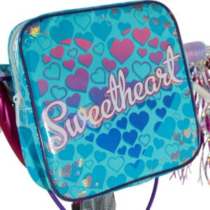 Your little girl will love riding around on the charming 18-inch Dynacraft Sweetheart Bike! This extremely colorful bike features our brand new dipped paint technique and is adorned with beautiful purples, pinks, and blues. She will think the adorable handlebar bag, shimmery streamers, and comfortable padded seat on this 18-inch bike are super cute! The training wheels are adjustable and removable allowing your child to ride on her terms. The front and rear caliper brakes and sturdy steel frame make this a safe ride for your little girl. Your little sweetheart will have the time of her life riding the lovely 18-inch Dynacraft Sweetheart Bike!