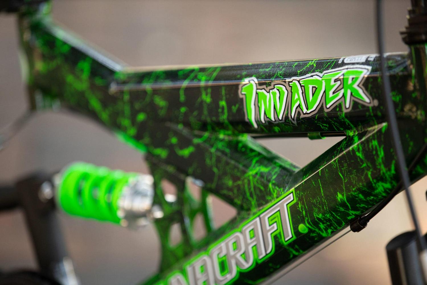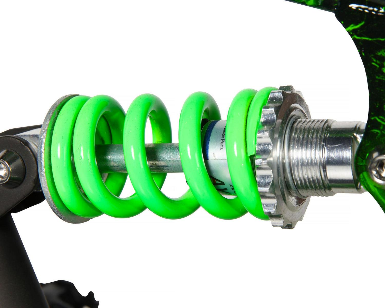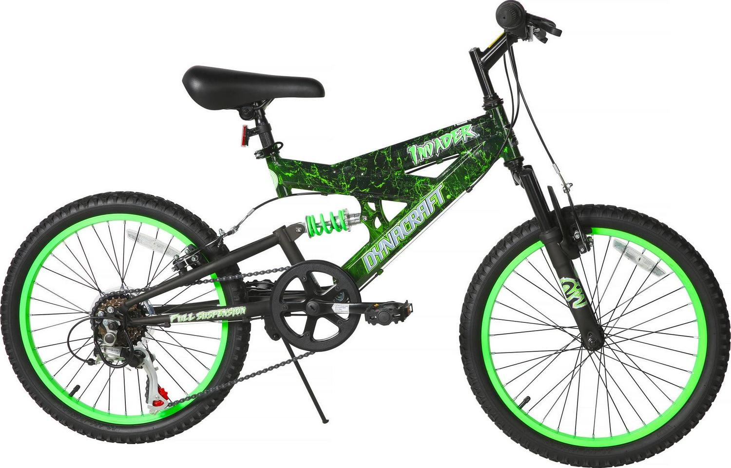 Conquer the sidewalk with the Dynacraft Invader 20-inch Boys Bike. This bike is the ultimate cool with its bold patterned, black-and-green Digi camo paint finish! The full-suspension mountain bike frame offers unparalleled comfort and stability as your young ones conquer all sorts of terrains. Your child will enjoy the control that comes with a 6-speed Shimano derailleur, which lets them pick the perfect speed for their ride. The Invader is also equipped with an adjustable seat post for easy adjustments for children of all sizes. A front and rear V brake provide maximum stopping power and control. The 20-inch tires and cool design make this bike a great option for boys ages 6-10. Make a statement today with the Dynacraft Invader 20-inch Boys Bike.