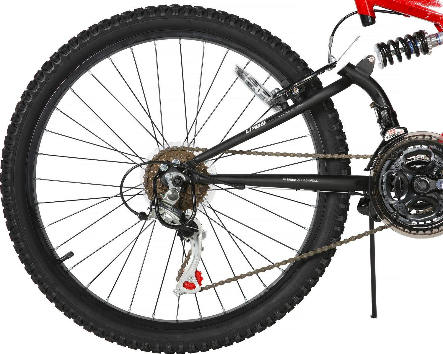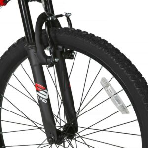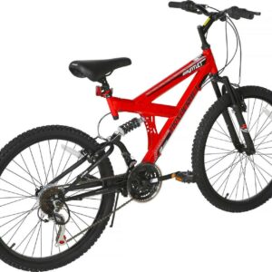 The Dynacraft NEXT 24-inch Boys Gauntlet Bike is an exciting and enjoyable ride for your child. This robust mountain bike boasts 18 speeds, a rear Shimano Derailleur, Shimano handlebar grip shifters, front and rear alloy pull brakes, and deluxe grips for a thrilling biking experience for the male riders. With its sturdy dual-suspension steel frame, young riders can count on a stable and comfortable journey. What makes this 24-inch bike even more appealing is its striking appearance, featuring a bold red paint finish and eye-catching black and white graphics. Encourage him to embark on his next adventure with confidence on the Dynacraft NEXT boy’s bike!