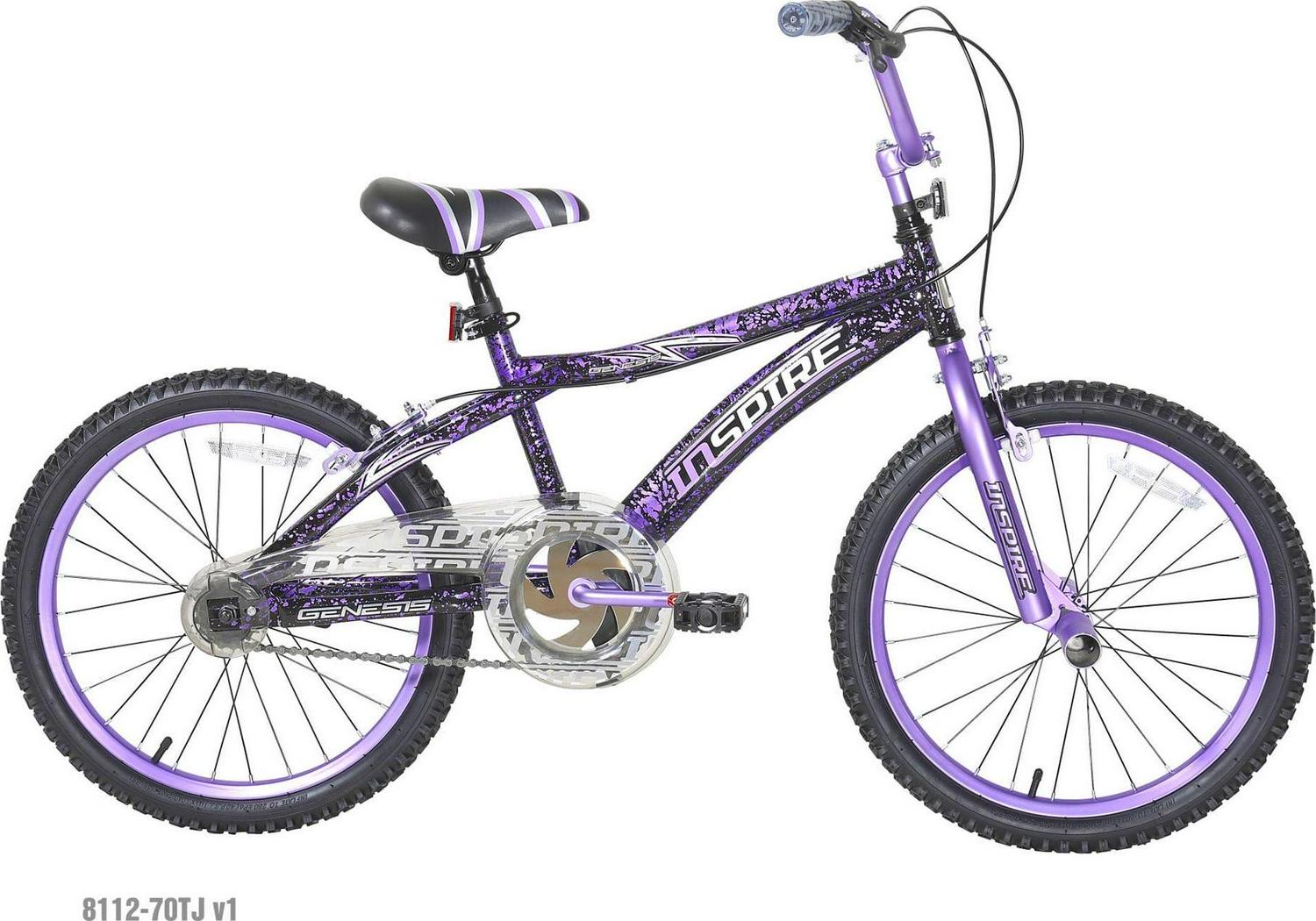 Introducing the brand new Dynacraft Inspire 20-inch Girl’s bike, designed to ignite her sense of adventure! This stylish bike features a stunning purple and matte black frame with vibrant purple, silver, and white accents for a trendy look. With a comfy padded saddle and easy-to-hold handlebar grips, she can enjoy her rides in total comfort. Built to last with a sturdy steel frame and equipped with both rear coaster and front and rear caliper brakes, this beautiful 20-inch bike ensures a safe and fun ride for the female riders. Get ready for hours of excitement and fun with the Dynacraft Inspire 20-inch bike, perfect for your adventurous young rider!