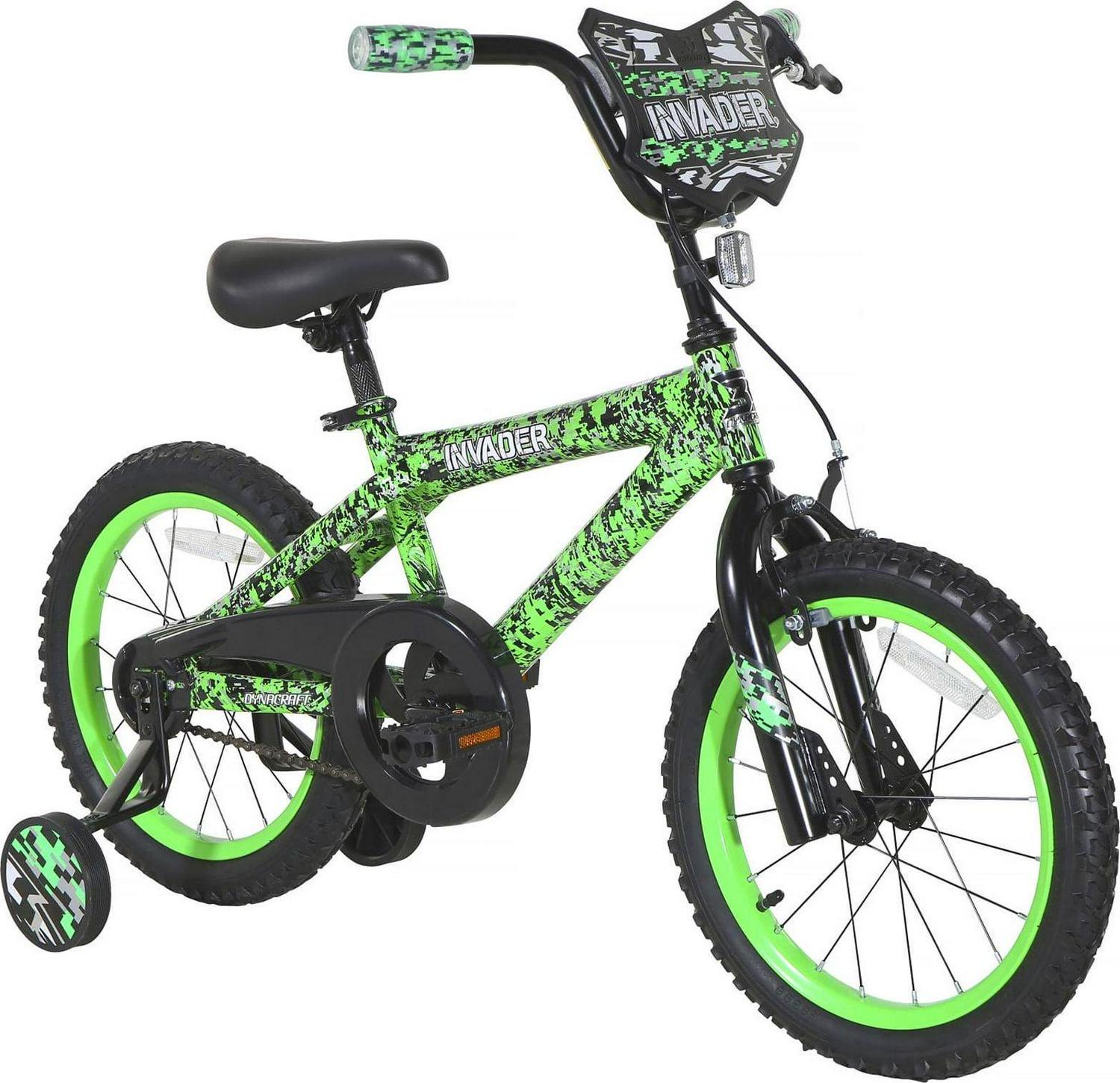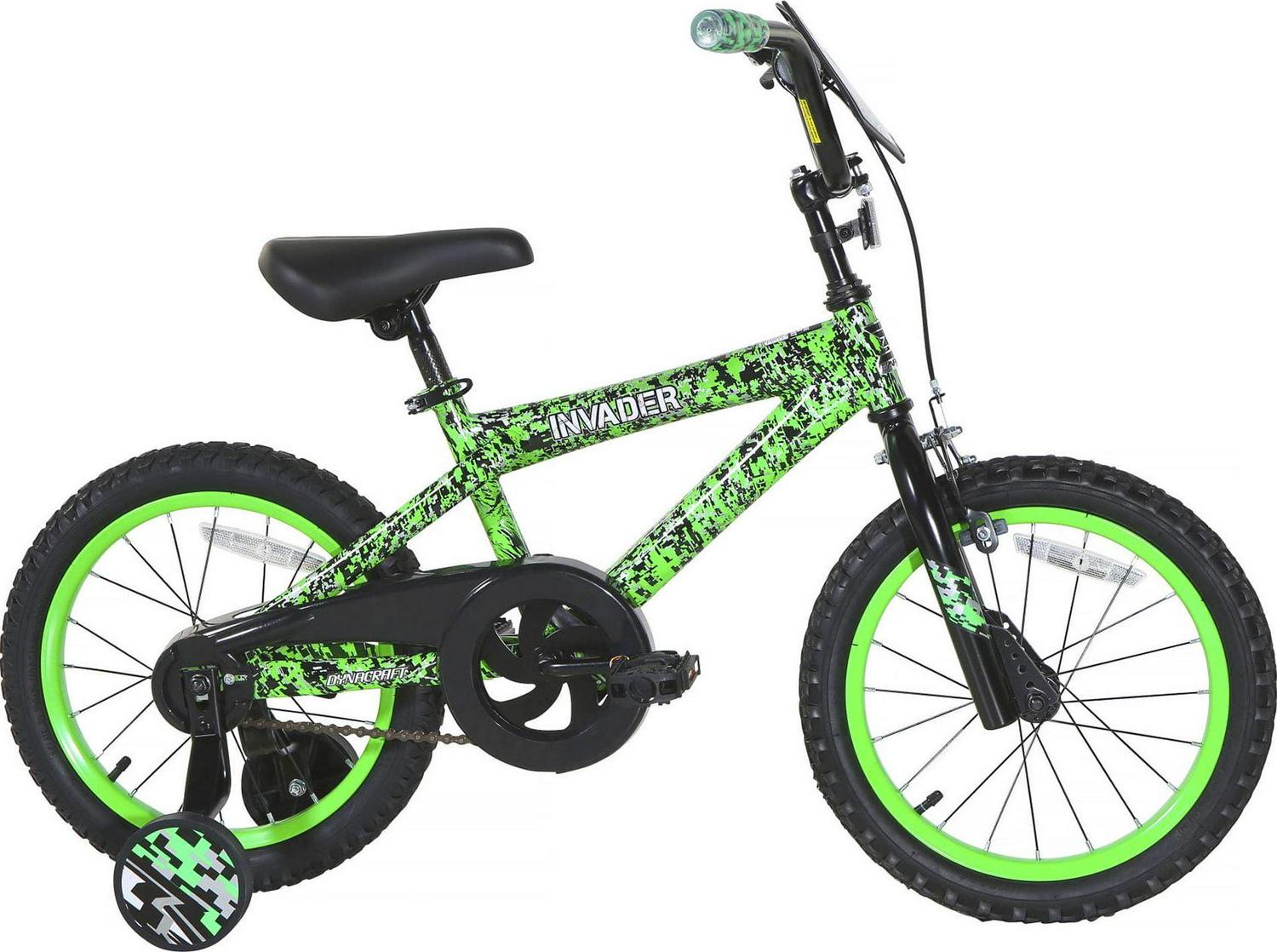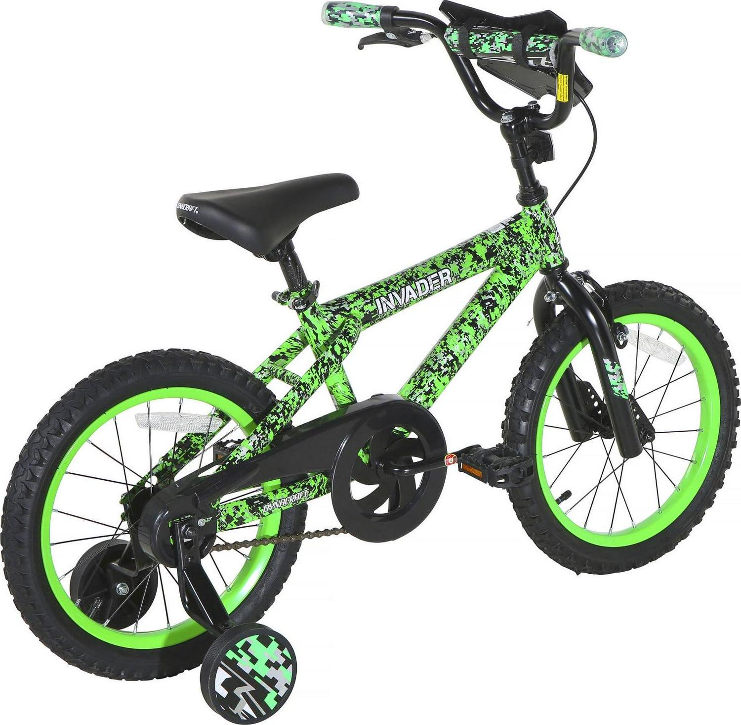 Gear up for an exciting adventure with the Dynacraft 16-inch Invader bike, tailor-made to thrill young boys and provide the ultimate riding experience for your little male rider. With its distinctive deluxe green and black paint finish, Invader handlebar shield, and eye-catching Invader decals, this bike is sure to capture attention as your young guy speeds through the neighborhood. Safety takes the lead with a rear coaster brake, front hand brake, full chain guard, and fully adjustable training wheels, ensuring a secure and enjoyable ride for your child.The Dynacraft Invader is the ideal choice for any young male adventurer seeking maximum outdoor excitement on two wheels!
