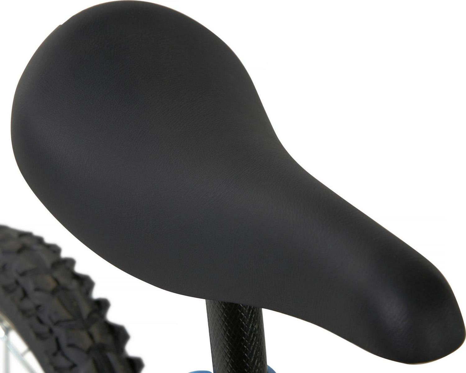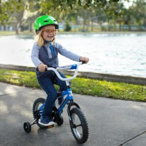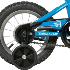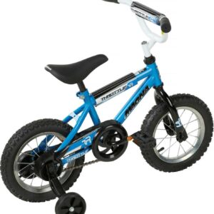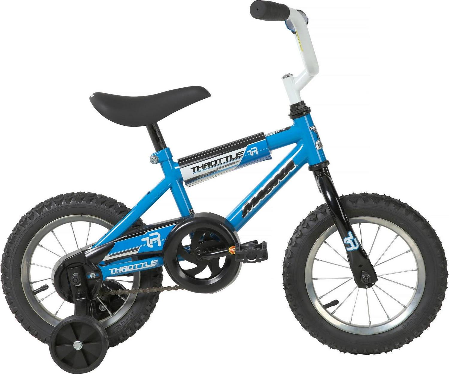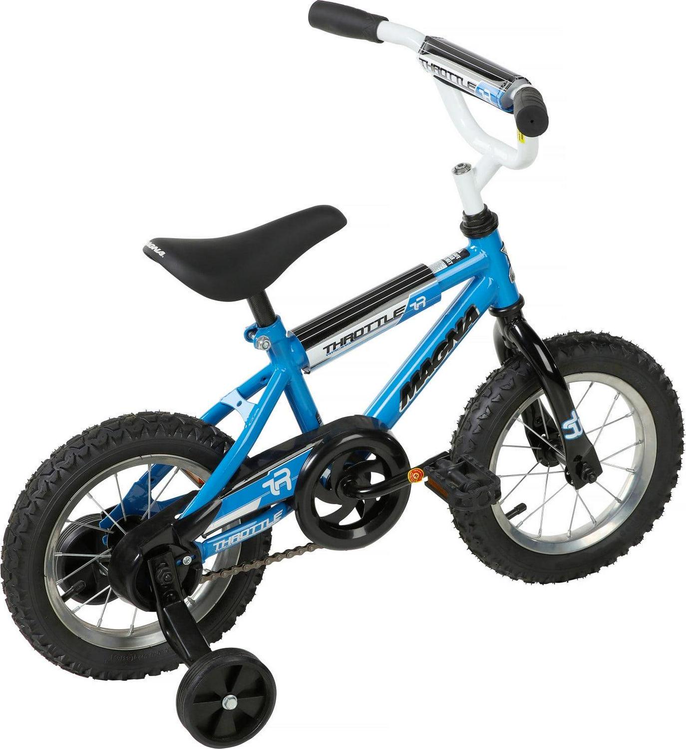 Boys can ride fast and furious on the Magna Throttle 12-inch BMX Boys Bike by Dynacraft. This durable BMX-style frame and handlebars rock a bright blue and white paint finish sure to catch the eye. The stylish bike features custom graphics and black and silver details on the handlebar pad, top tube pad, and chain guard. Coaster brakes make stopping easy and the removable/adjustable training wheels help ensure a fun and steady ride for young riders. An adjustable seat allows the bike to grow with your little one. This bike is a great option for boys ages 3-5 years. They will love every ride on the Magna Throttle 12-inch BMX Boys Bike.