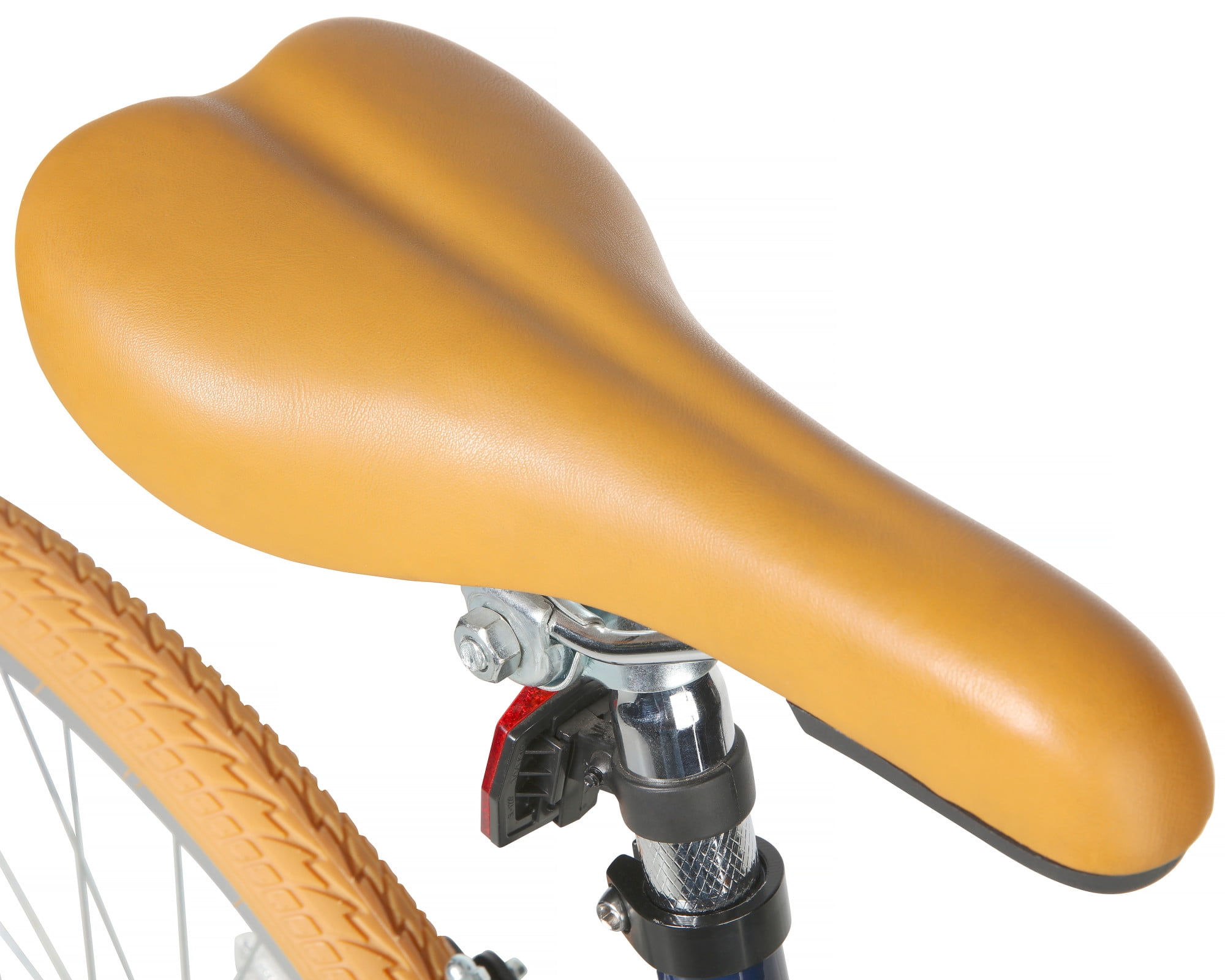Show off the stylish and smooth Dynacraft Sonoma 700C Men’s City Bike as you ride through the heart of the city. This sleek city bike with a dark blue high gloss paint finish is perfect for riding to work or casually cursing around your neighborhood. Custom gum tires in tan, and matching tan handlebar grips and saddle, add to the unique and stylish design of the bike. The lightweight alloy rims make maneuvering smooth and easy. A threadless four-bolt stem and Kraton rubber grips give the bike a more elegant look while also enhancing functionality. The Dynacraft Sonoma 700C Men’s City Bike is meant for great rides in great places.