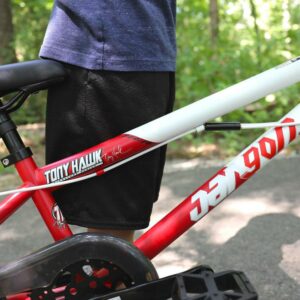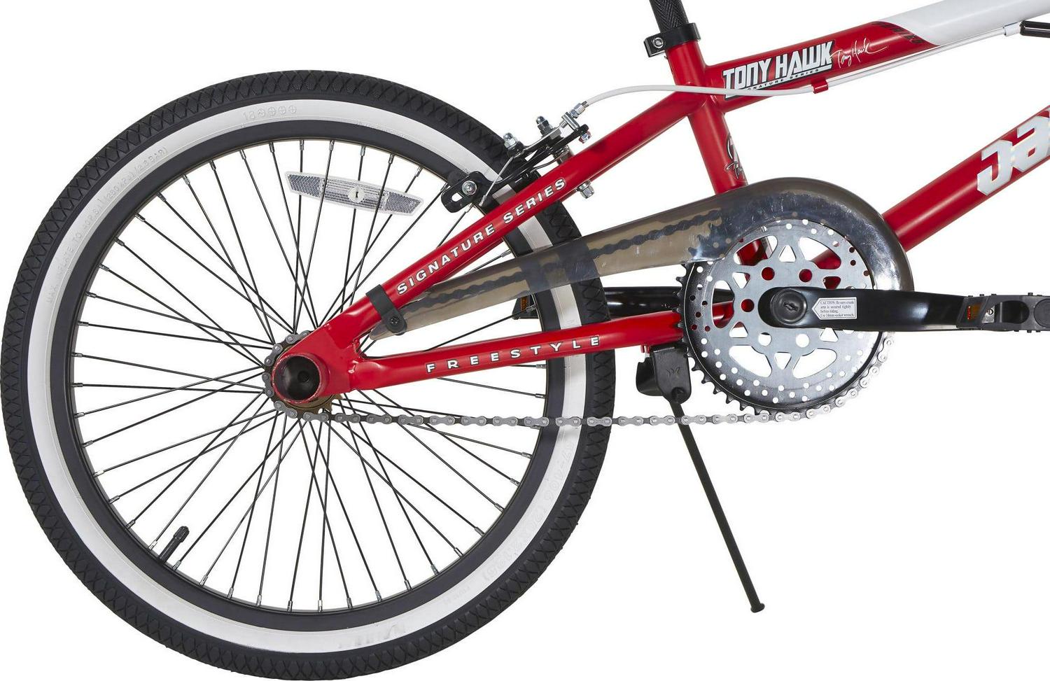 Looking to ride like a pro The Tony Hawk Jargon 20-inch bike by Dynacraft is the perfect choice for your BMX enthusiast! With its sturdy frame and deluxe matte paint finish, this bike is built to last. Sitting on sturdy 48-spoke wheels with front and rear pegs, you ll be able to get with the jargon quickly and leave the competition in a spin with your freestyle handlebar rotor. A full cover chain guard, custom grips, front and rear caliper brakes, and handy kickstand add to the solid design, ensuring safety first. The Tony Hawk Jargon 20-inch bike is the only bike you ll need to learn the language of BMX while having fun.