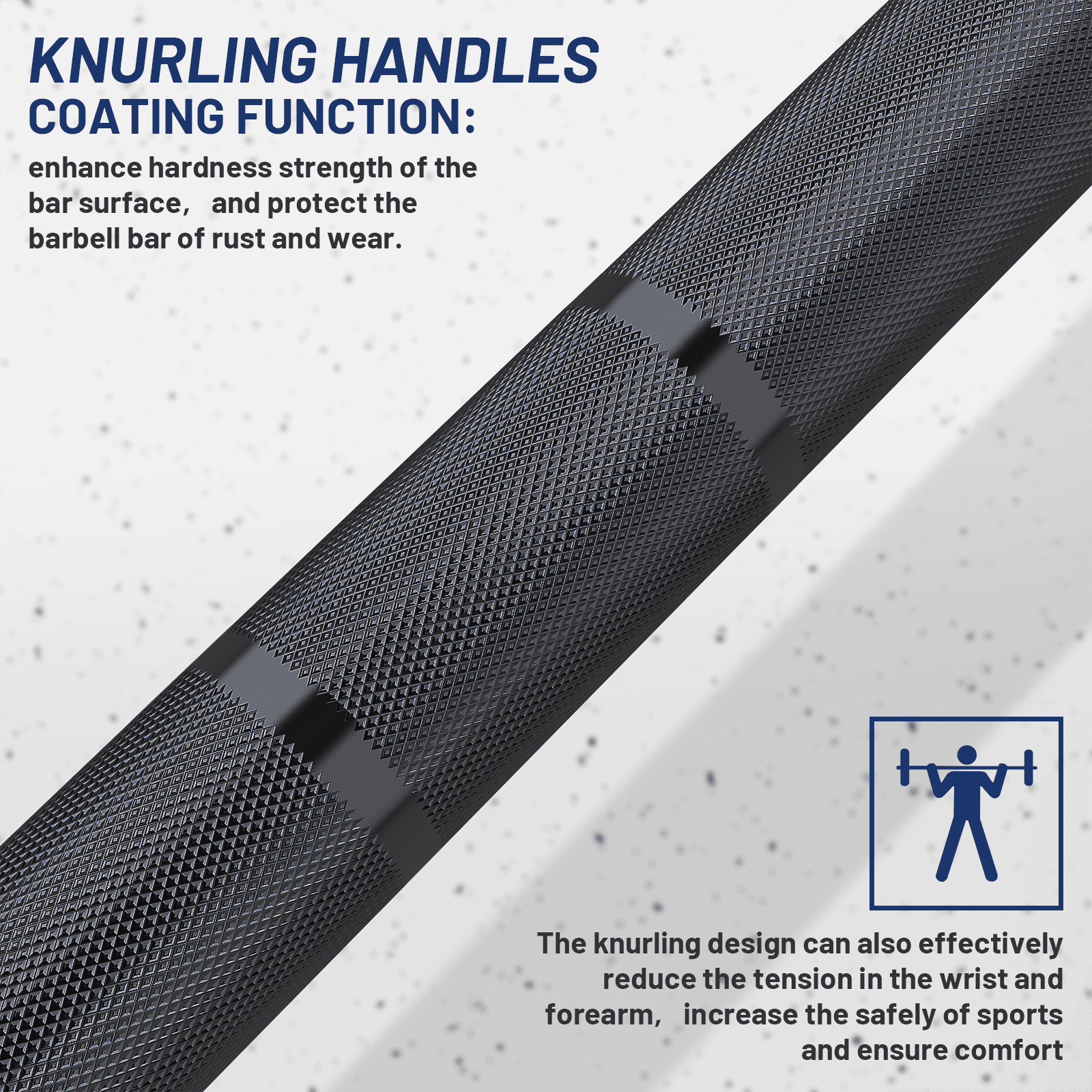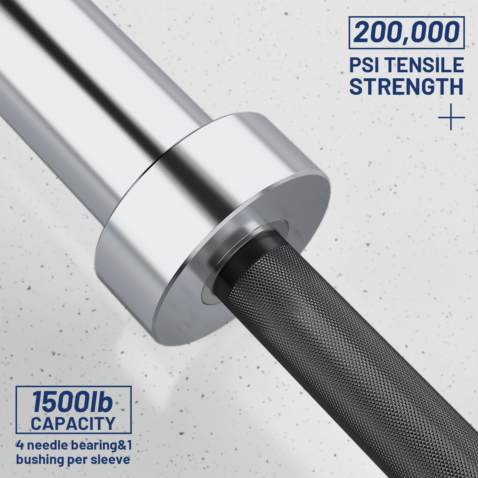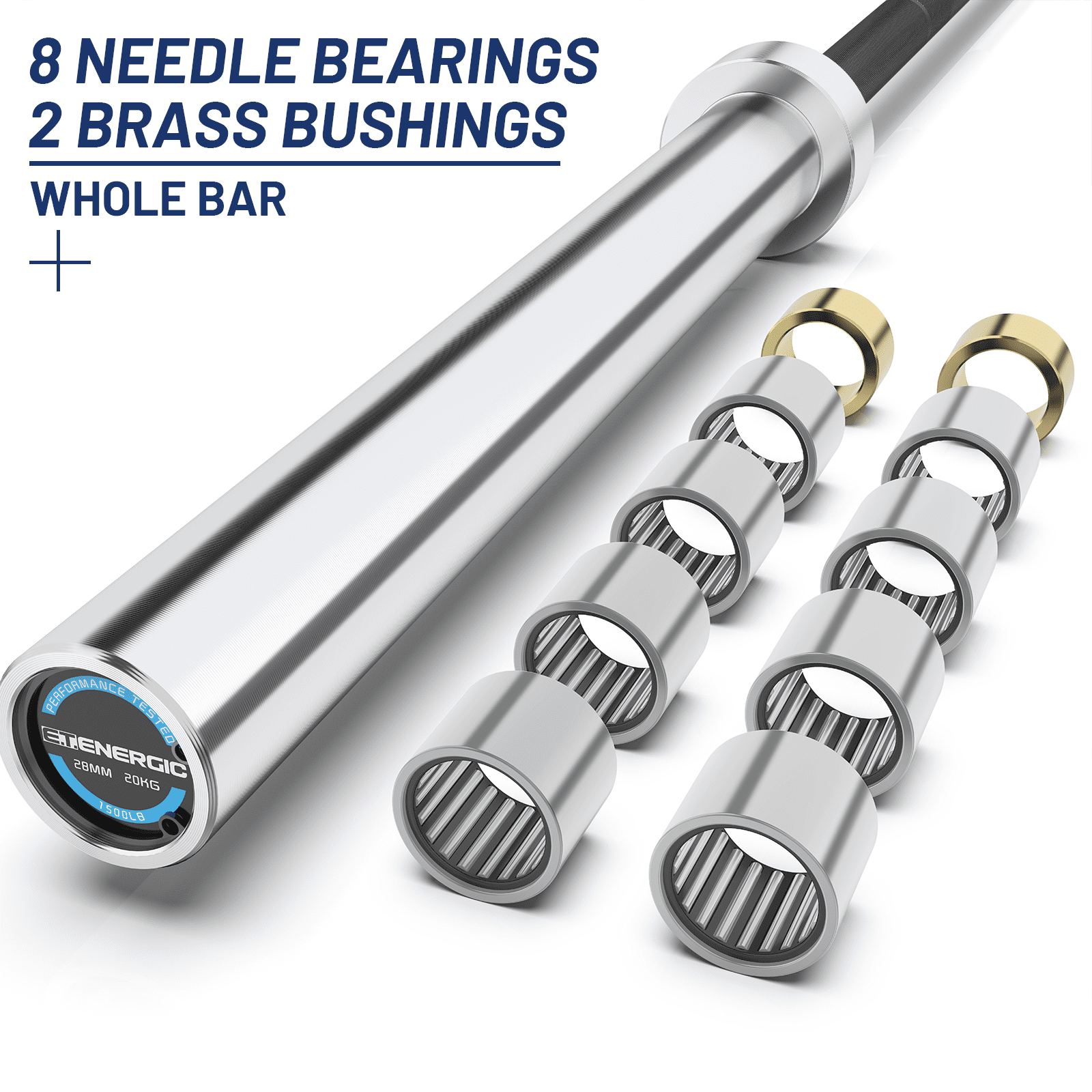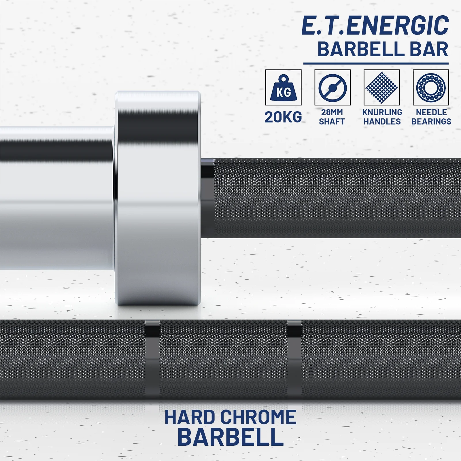 PREMIUM QUALITY MATERIAL: E.T. ENERGIC Olympic standard barbell bars are made of heat-treated alloy steel for high load capacity and flexibility, with a black hard chrome coating that enhances the surface hardness of the barbell bar and protects the bar from rust and wear. 200,000 PSI tensile strength, strong enough to withstand loads up to 1,500LBS/680KG, suitable for your most demanding lifting requirements! (Fits standard 2-inch weight plates). MEDIUM BARBELL KNURLING: The 28mm grip shaft features 1.2mm of medium knurling with moderate whip marks to increase friction and improve the grip experience. The knurled design also effectively reduces tension on the wrist and forearms, increasing the safety of the movement and ensuring comfort. NEEDLE ROLLER BEARINGS AND SLEEVES: Sleeves for barbells are typically constructed with bushings or bearings. Our Olympic barbell sleeves are friction-welded, making them stronger than regular welded sleeves. Each swivel sleeve has 4 needle bearings and 1 bushing for a total of 8 needle bearings on the barbell. The bushings provide moderate rotation while the bearings rotate quickly for snatch and jerk grip needs. PRODUCT SPECIFICATIONS: Our barbell bars are designed to meet your strength training needs. The barbell bar weighs 44 lbs (20 kg) and is 86.61 inches (7 feet) long. The loadable sleeve is 16.4 inches long and fits 2-inch barbells. 28mm of medium knurling is designed to meet your exacting attention to detail, making it a quality choice for your training. MULTIPURPOSE: The barbell bar can be used for all your training needs. Especially for legs, hips and back. It can not only perform muscle endurance training, burn fat into fit lines and enhance muscle strength; it can also slow down muscle aging and improve body coordination. You can use it at home or in the gym to strengthen your core.