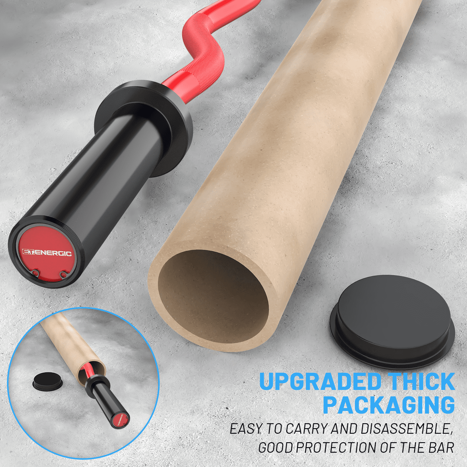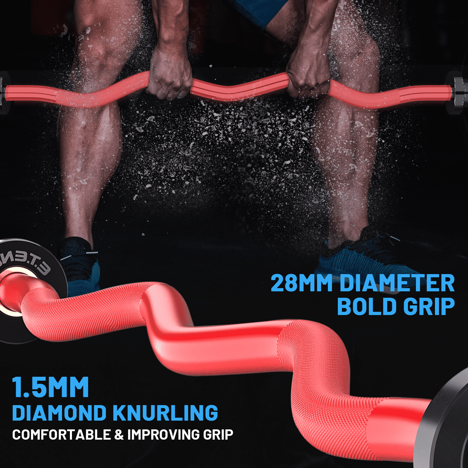 MATERIAL PREMIUM QUALITY: E.T.ETENERGIC curl bar is made of high-quality solid steel. The maximum load capacity can reach up to 500 lbs. Pure red electroplating matte coating to enhance the texture. PRODUCT MATCH: This barbell bar fits standard 2-inch weight plates. EXCELLENT WORKMANSHIP: Olympic bar bushings are friction welded, which is stronger than ordinary welded bushings. The barbell usually consists of bushings and bearings to provide moderate rotation and high-strength support, on the other hand, the bearings are designed to rotate fast, in line with the need for gripping and cleaning. SAFETY PERFORMANCE: The grip shaft uses diamond knurling to increase friction and improve the grip experience. The increased knurling design also effectively reduces wrist and forearm tension, increasing the safety of movement and ensuring comfort. PERFECT TRAINING: The barbell bar can meet all your training needs. This allows you to train your muscles for endurance, burn fat into toned lines, and enhance muscle strength; it also slows muscle aging and improves body coordination.