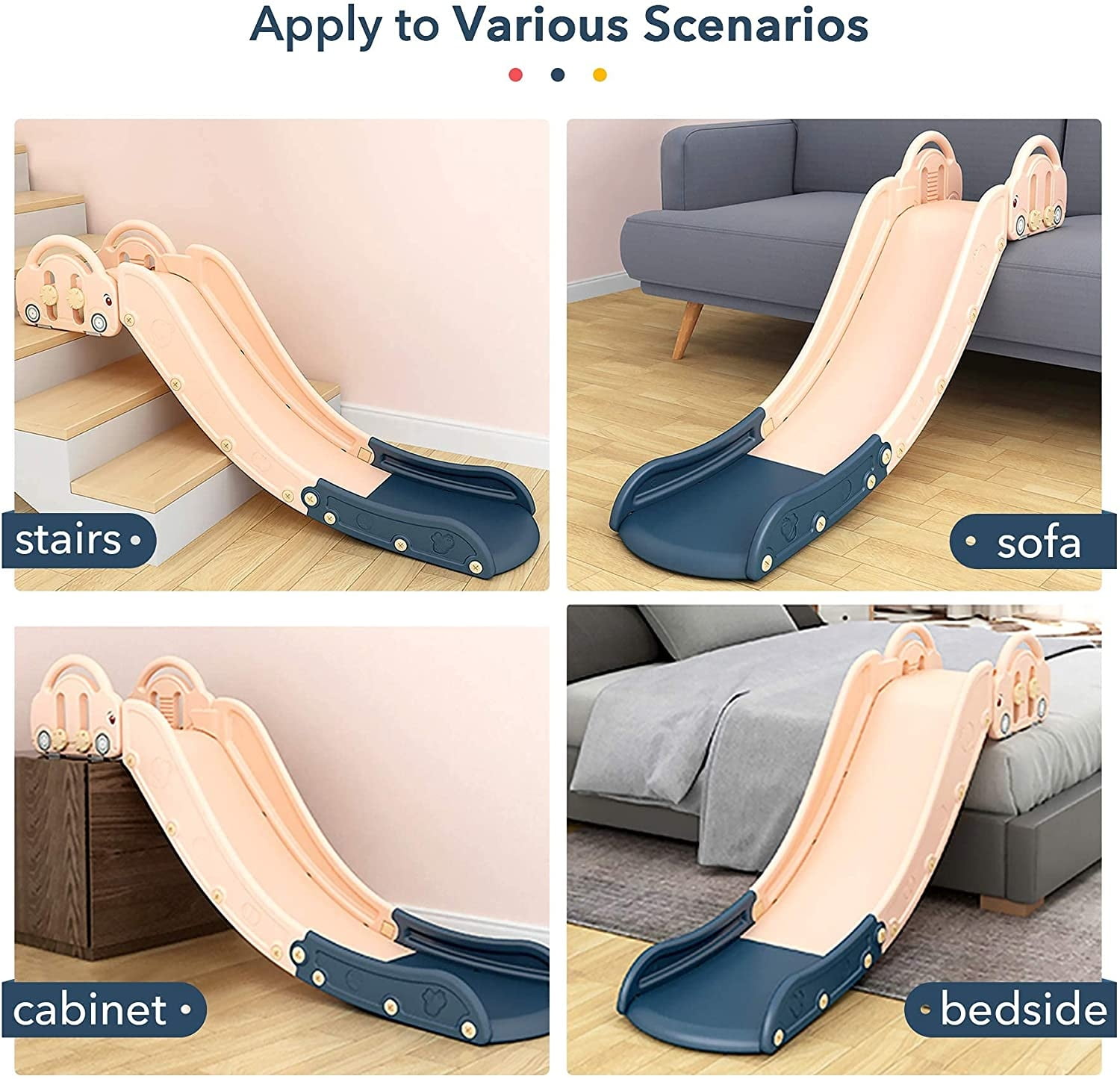 MODERN DESIGN FOR MULTIPLE PLAY SCENARIO — The EALING BABY bedside/couch slide is specially designed for multi-scene play with adjustable height. Cloud-shape handrails and natural color are suitable for both boys and girls, fitting in all kinds of rooms interior style. Perfect attachment and accessories for toddler beds, nugget couches, and kids’ playroom to add more fun! PERFECT AS THE FIRST SLIDE FOR YOUNGER KIDS — The anti-skid pads of EALING BABY sofa slide are suitable for various surfaces, such as sofas, beds, stairs, and other furniture. It is designed with reasonable slope angel that gives younger kids a gentle acceleration and smooth landing. HDPE MATERIAL SAFE AND DURABLE — The EALING BABY sofa slide is made of durable and non-toxic HDPE materials. It has a long slide board with the safe and sturdy side rails with smooth edges. And the slide can bear a weight of 220 lbs, happily accompanying your children’s growth. ASTM CERTIFIED GIFTS FOR TODDLERS — The EALING BABY sofa slide is ASTM certificated, can exercise toddler’s coordination skills, sense of balance, and cultivate little kids’ adventurous spirit. It is a toy that grows with your kids and family. It is perfect for holiday and birthday gifts. SPACE-SAVING STORAGE — The EALING BABY sofa slide can be directly stored under beds, couches, and on the side of cabinets, etc., which does not take up space. It’s easy to carry from space to space. Bring the fun with you to families and friends! EASY TO ASSEMBLE & CLEAN — One person can finish assembly in 20 minutes without any other tools. The EALING BABY toddler slide will be reinforced with serrated nuts to prevent loosening. The smooth surface is dust-proof and easy to wipe clean. SPECIFICATION: • Colors: Pink/Blue • Weight Limit: 220 lbs. • Adult supervision is required. • Ages: Suggested 2-5 • Product dimension: 57’’L x 15.7’’ W x 33.5’’ H