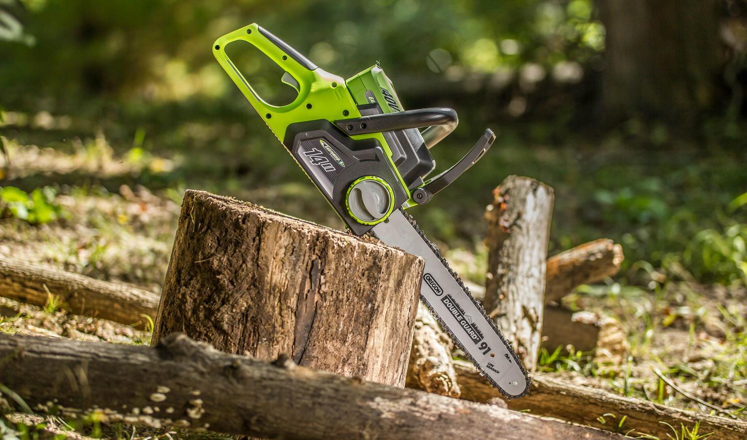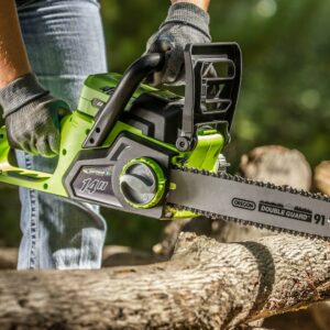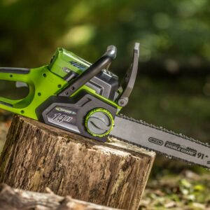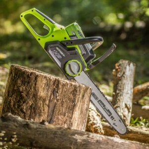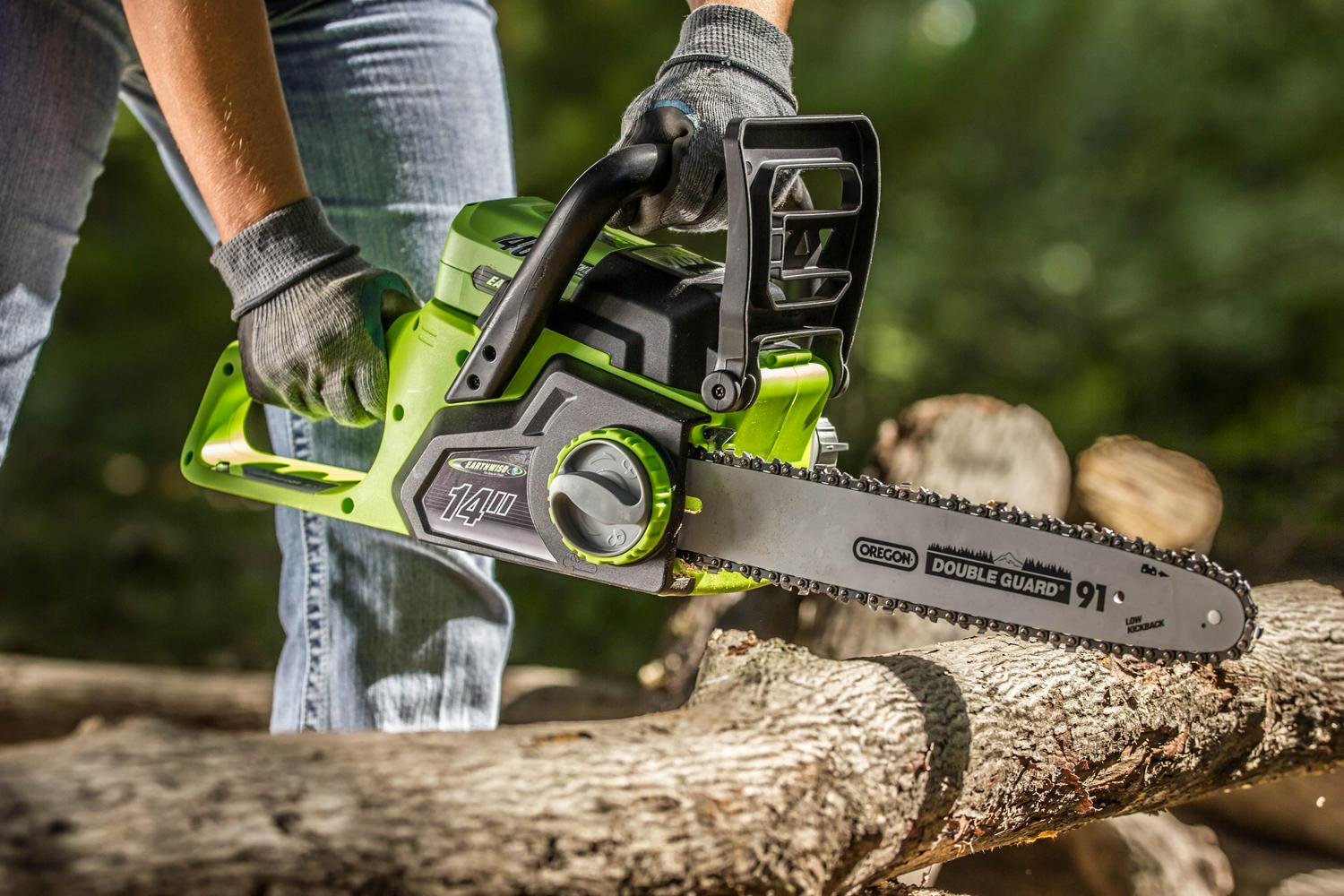 – The cordless Earthwise 40V chainsaw boasts a 14″ Oregon bar and chain, automatic oiling and tool free chain replacement