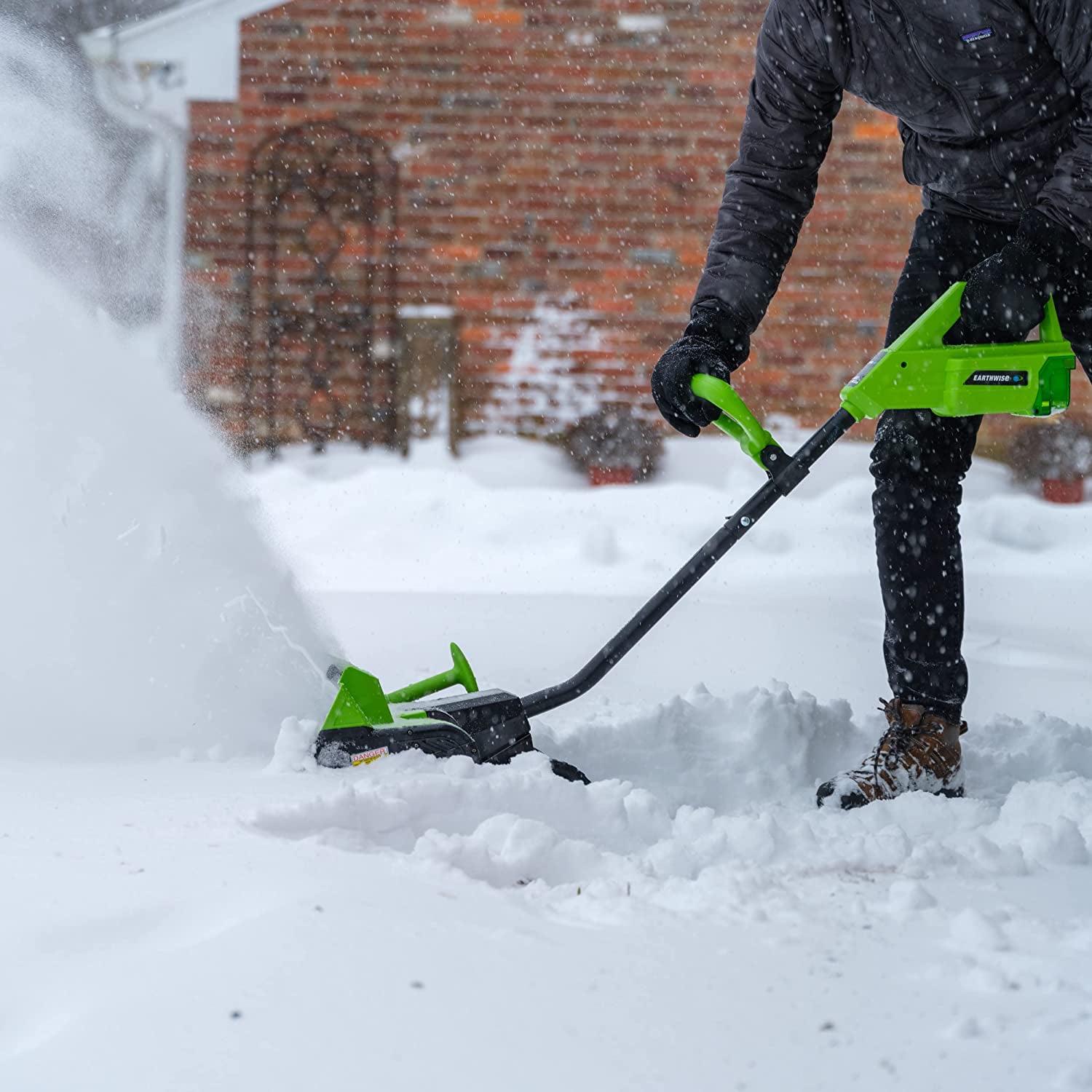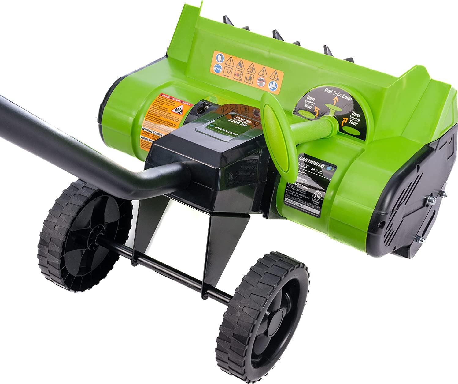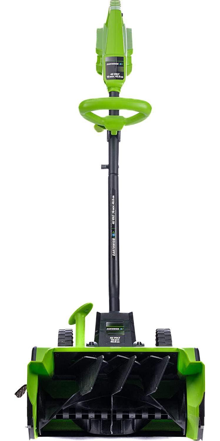 – This Earthwise Cordless 40 Volt snow thrower features a push button start, 16″ clearing width and up to 8″ clearing depth