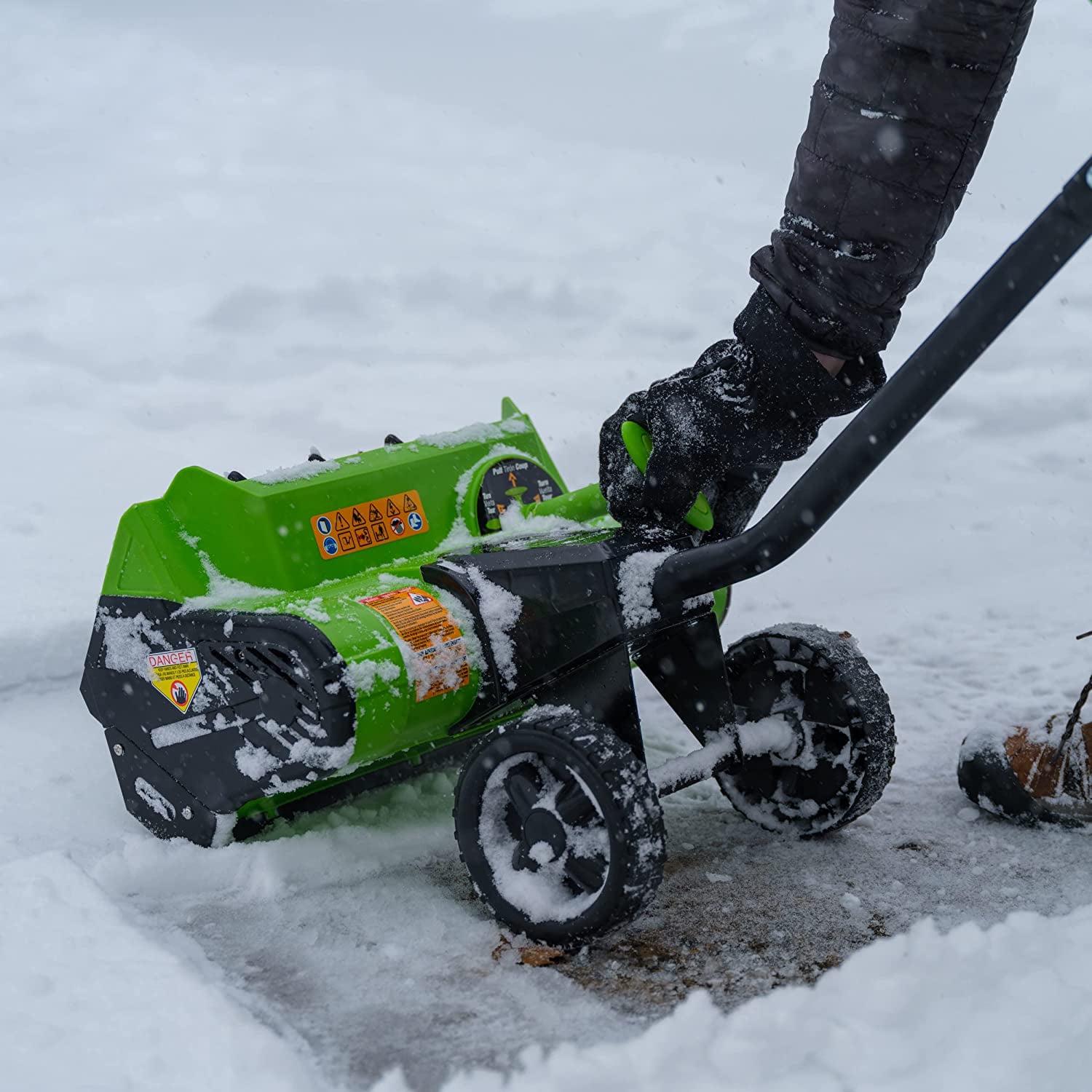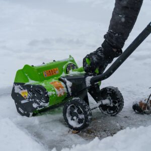 This Earthwise Cordless 40 Volt snow thrower features a push button start, 16-inch clearing width and up to eight-inch clearing depth. A powerful blower that handles up to 300 pounds per minute snow capacity. It also blasts snow up to 30 feet in distance. A durable dual blade curved rotor and an adjustable support handle are why it’s reliable and easy to use. This snow shovel is light weight and small compared to other snow throwers and is powerful enough for all your around the house snow needs. No Fuel, No Fumes. The Clean Air Choice.