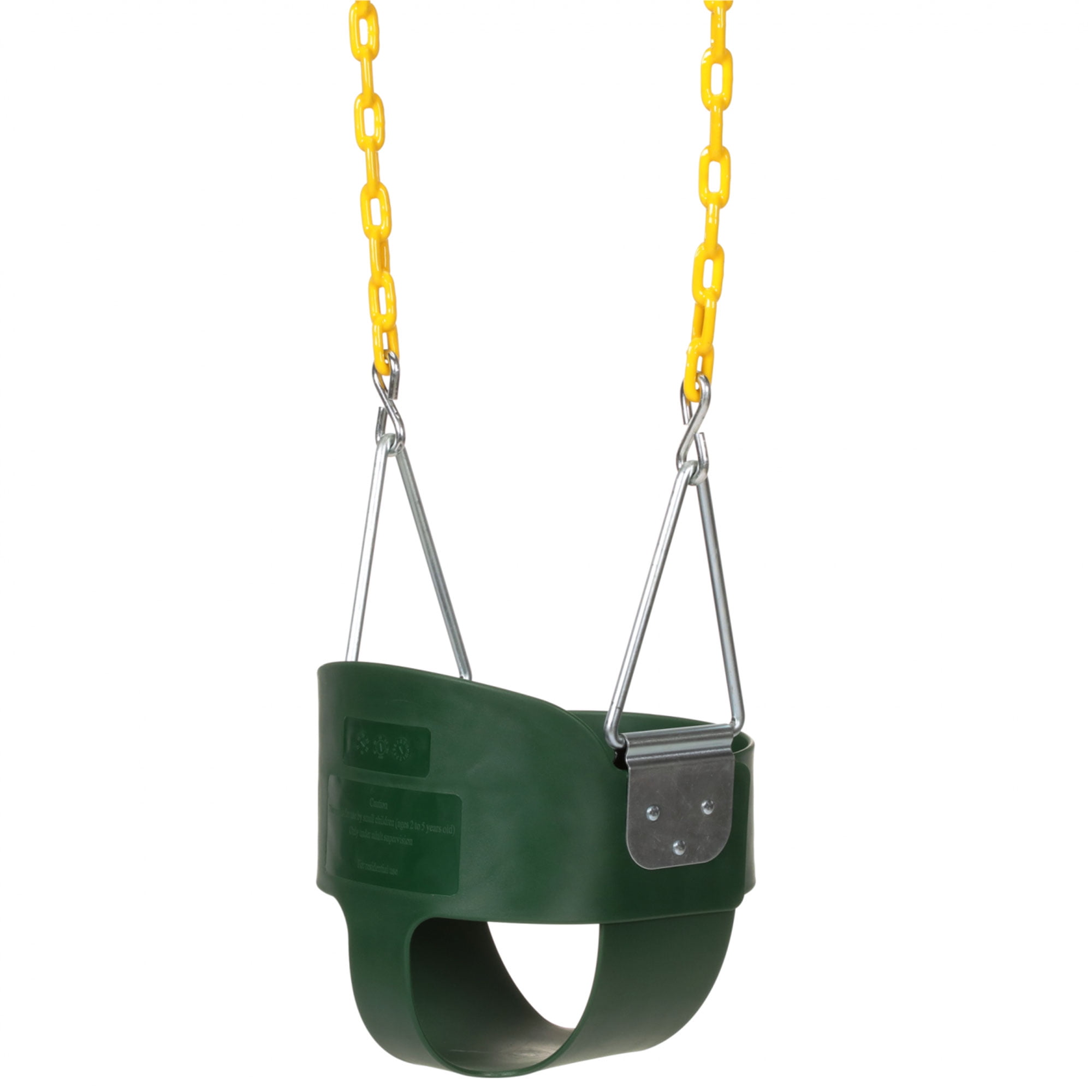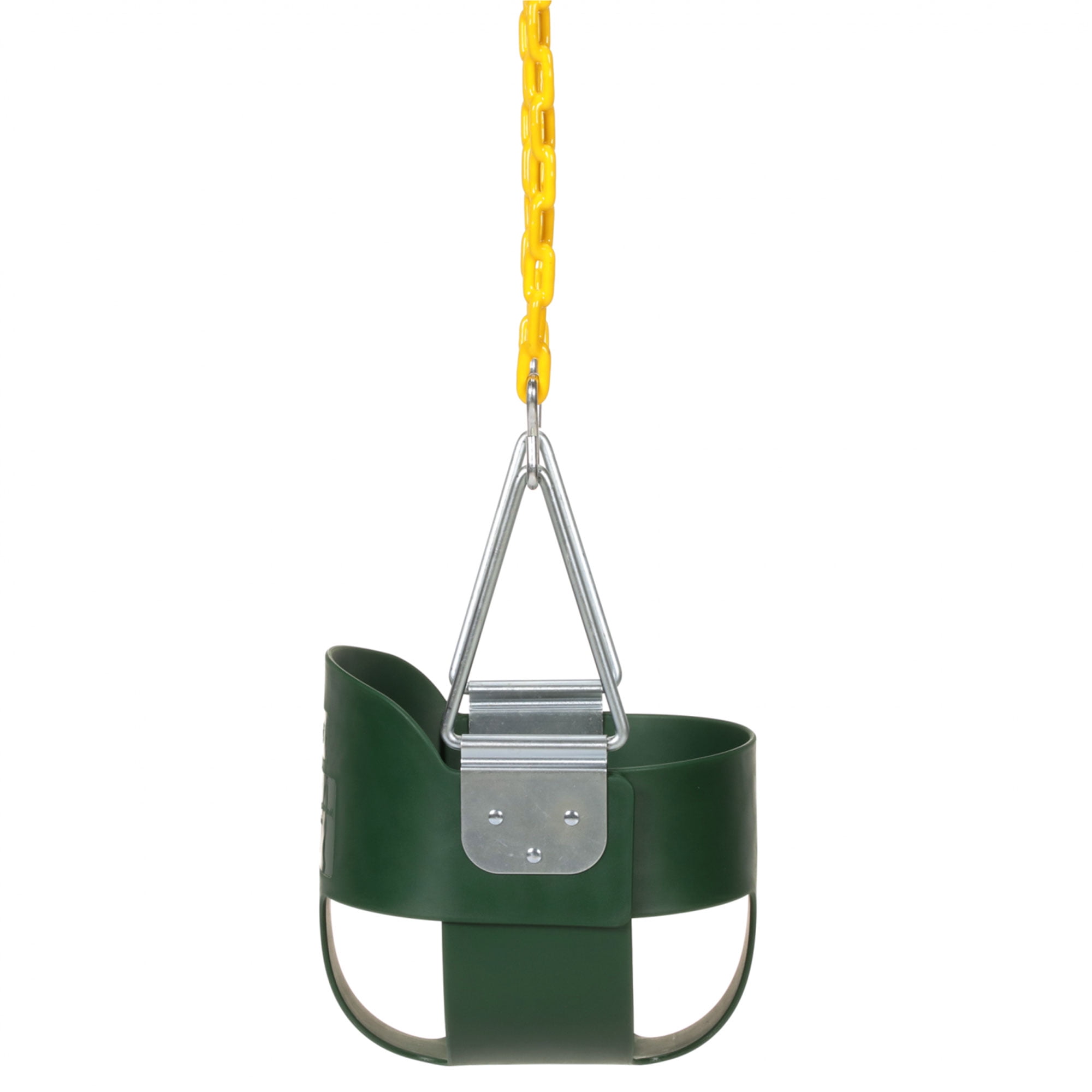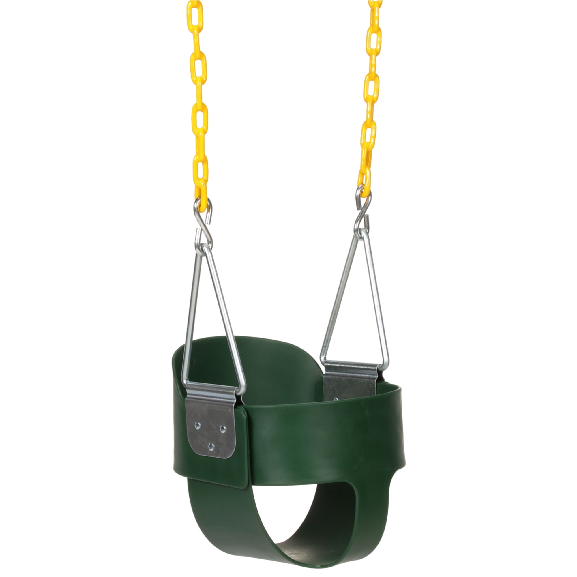 Give your toddler fun outdoor time with the Heavy Duty High Back Toddler Bucket Swing Set Seat from Eastern Jungle Gym. This green toddler swing seat features an extra high back to keep your child secure while they swing up high. Constructed of durable heavy-duty plastic material, this seat is ideal for use on swing sets and playsets in your backyard to keep your child entertained. The seat can be attached to beams 9 feet high and include an adjustable 66-inch long chain to install the swing at your ideal height. The bottom 30 inches of the chain is coated in yellow plastisol for added comfort and to keep your toddler from pinching their fingers while moving. This swing won’t rust when exposed to rain or snow, so your child can swing all year round. Upgrade your backyard swing set with the Heavy Duty High Back Toddler Bucket Swing Set Seat from Eastern Jungle Gym.