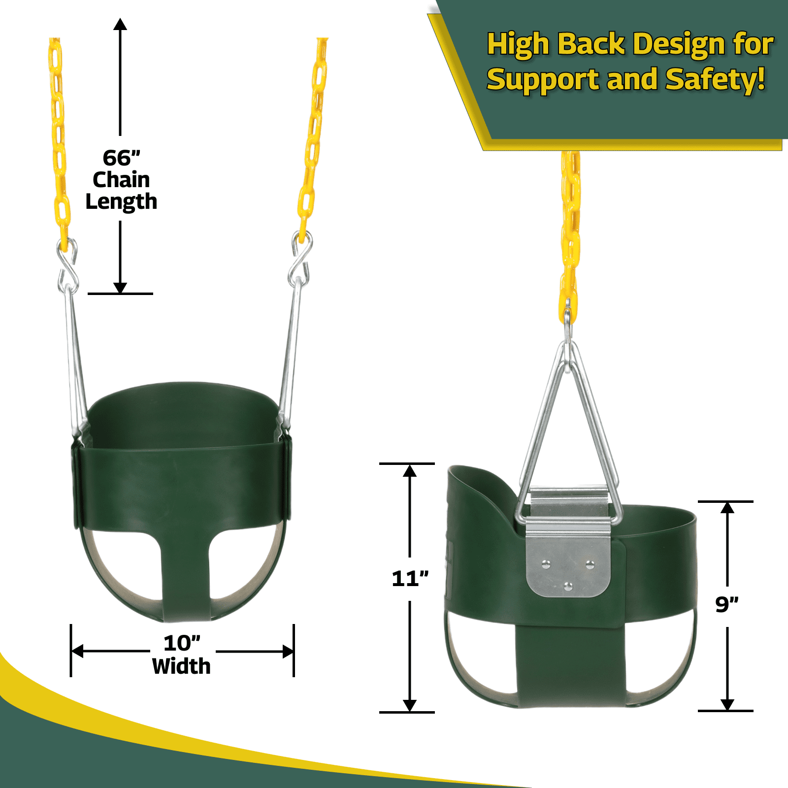 High seat back swing provides extra security to swing your toddler higher for an exciting afternoon Fully assembled swing attaches to beams 9 feet high to give your kids a fun outdoor activity Bottom 30 inches of the adjustable swing chains are coated in yellow plastisol Seat is constructed of high-quality durable plastic, ideal for residential use in your backyard Durable swing seat won’t rust over time can be kept outside all year round in rain and snow Material: Plastic Color: Green Swing chain length: 66 inches Seat dimensions (L x W x H): 11.5 x 10 x 11.5 inches Overall dimensions (L x W x H): 14 x 13 x 12 inches Weight: 8 pounds