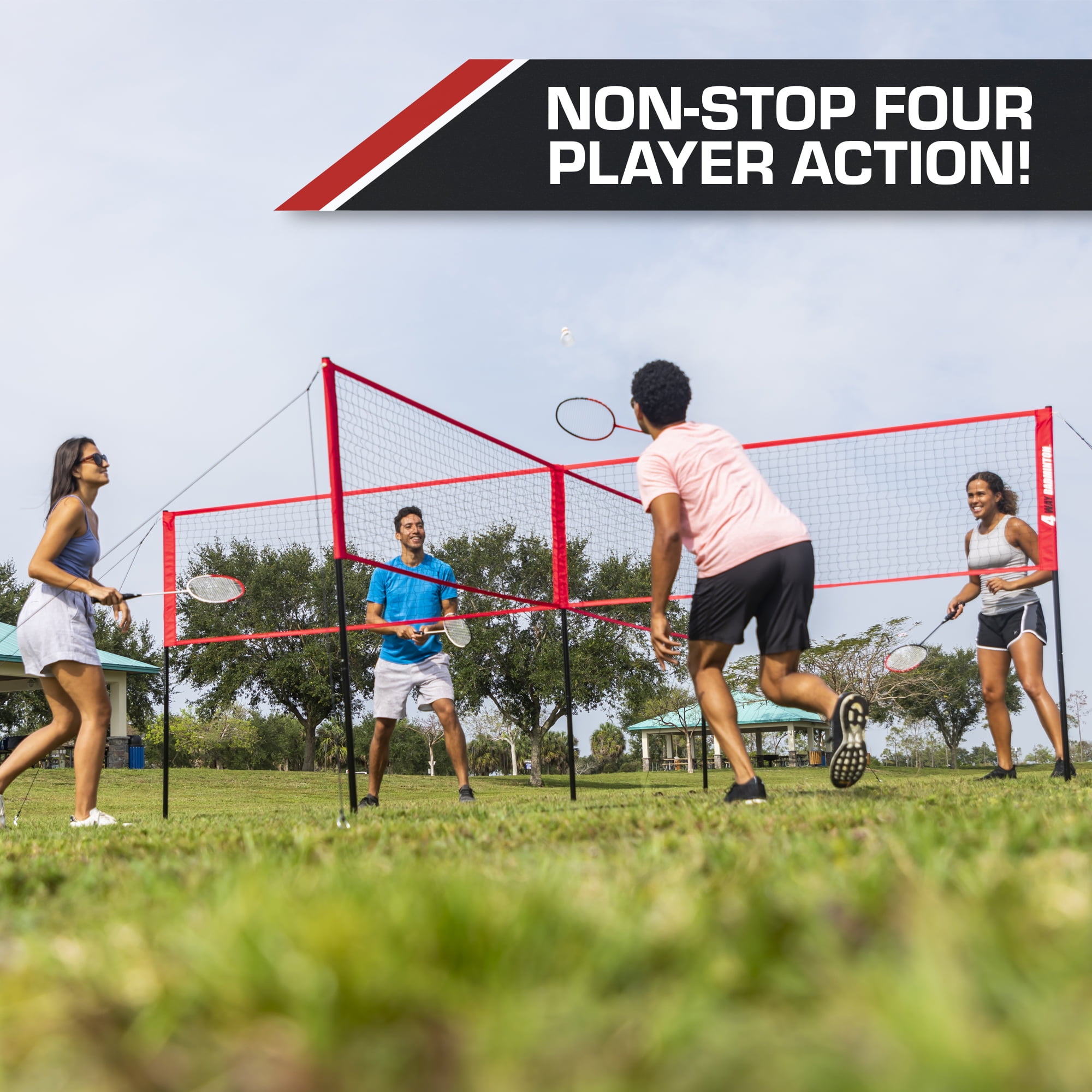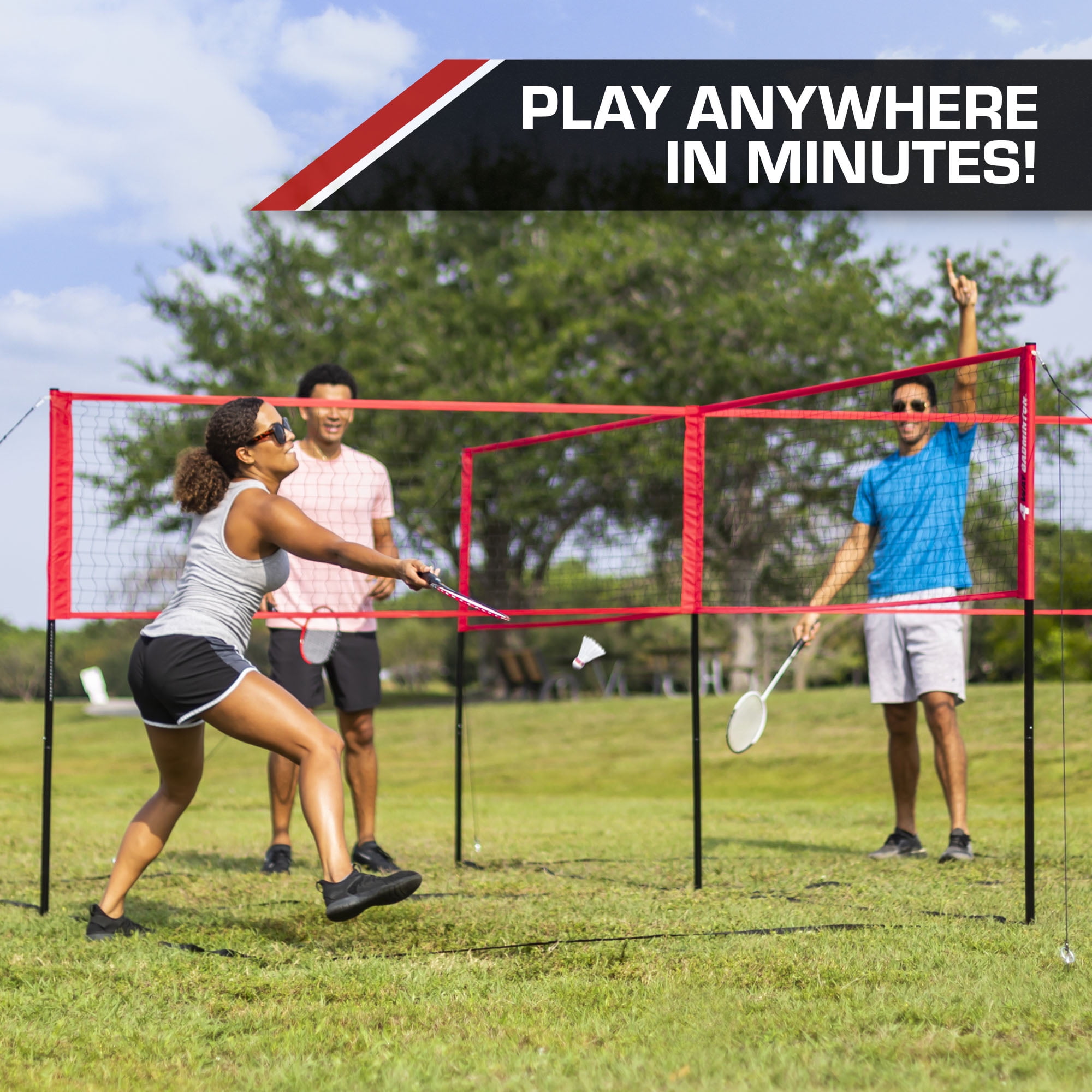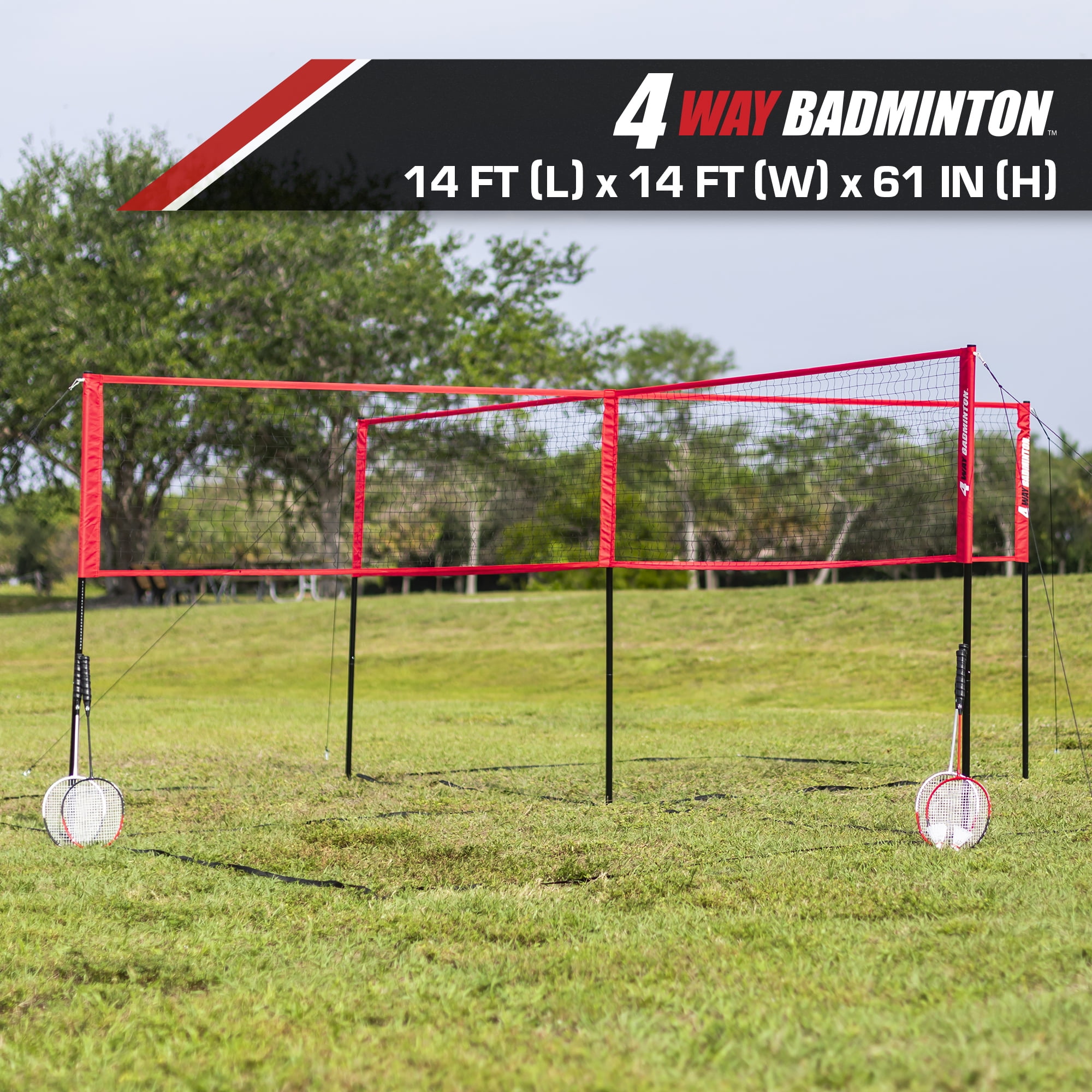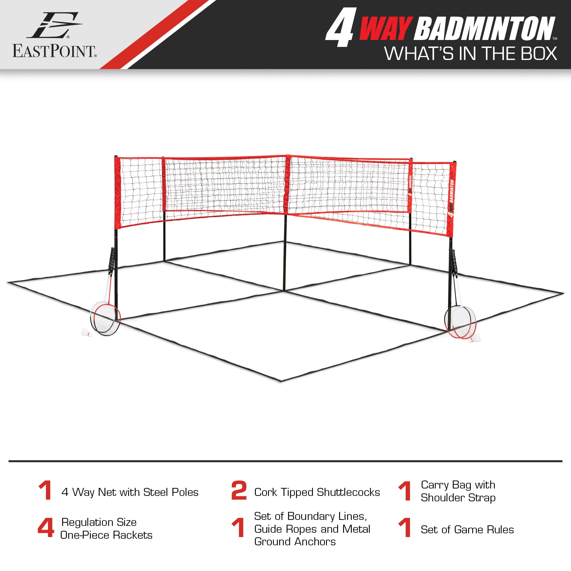 Strategic 4-Square Gameplay, High-Speed Badminton Action Set includes: Complete set includes 14′ x 14′ 4 Square net Easy set-up: The 4-Way Net sets up in minutes and includes boundary lines. Set-up this game quickly with easy-to-use net sleeves. Full assembly instructions and game rules included First-ever four-player combo: Take these classic games to the next level of ultimate 4 Square matches Unique gameplay: This 14′ x 14′ 4-Square net is regulation Badminton net height with easy-to-use net sleeves for a quick set-up Give the gift of outdoor play: Get your family outside and moving with this highly active game that provides fun, exercise, and excitement for the entire family EastPoint Sports 4-Way Badminton Set with Net, Boundary Lines, Rackets, Shuttlecocks and Carry Bag: