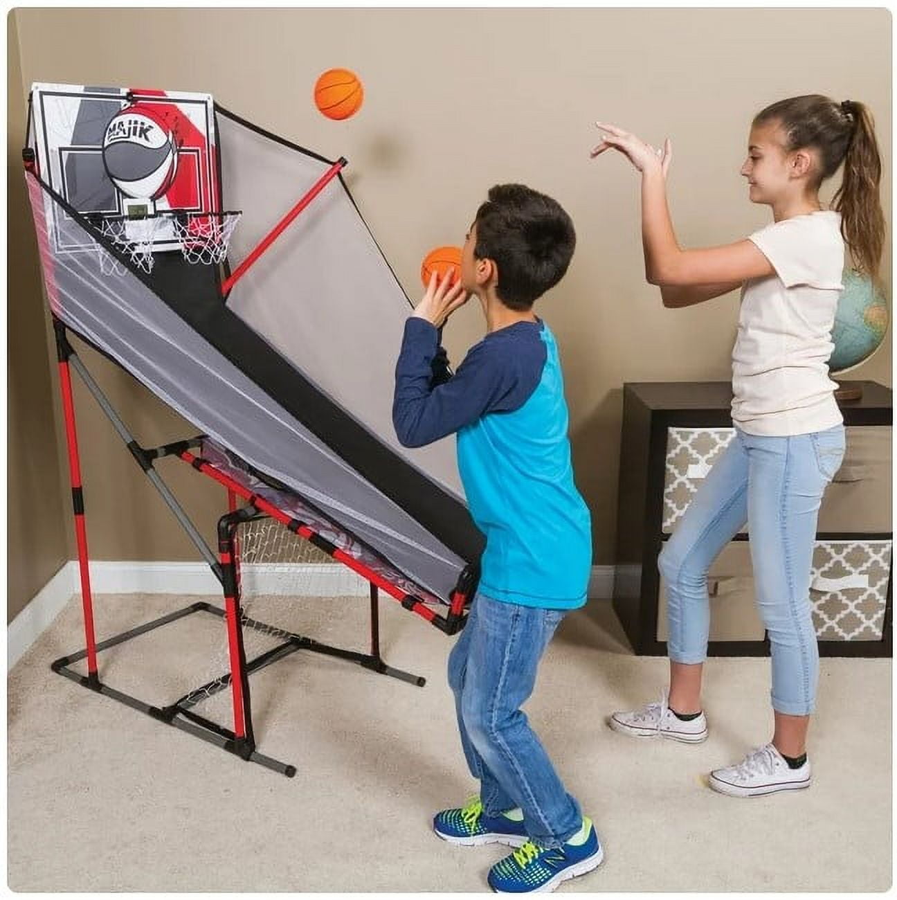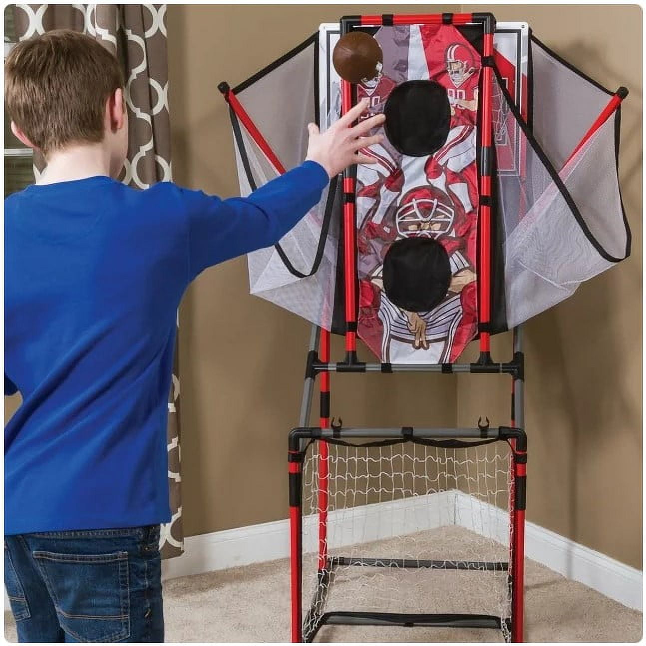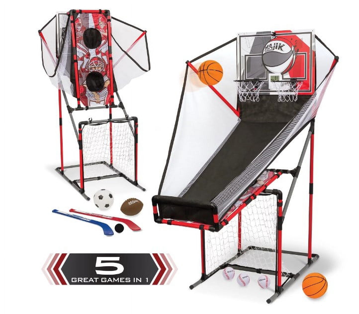 5 great games in 1 – basketball, football, baseball, soccer and hockey 2 arcade double shot basketball hoops with wide angle ball return for 1 or 2 player action Automatic electronic basketball scoring and stadium sounds Complete with all accessories: 2 arcade basketballs with inflating pump, 1 football, 3 soft baseballs, 1 soccer ball, 1 hockey ball and 2 knee hockey sticks 90-day limited warranty