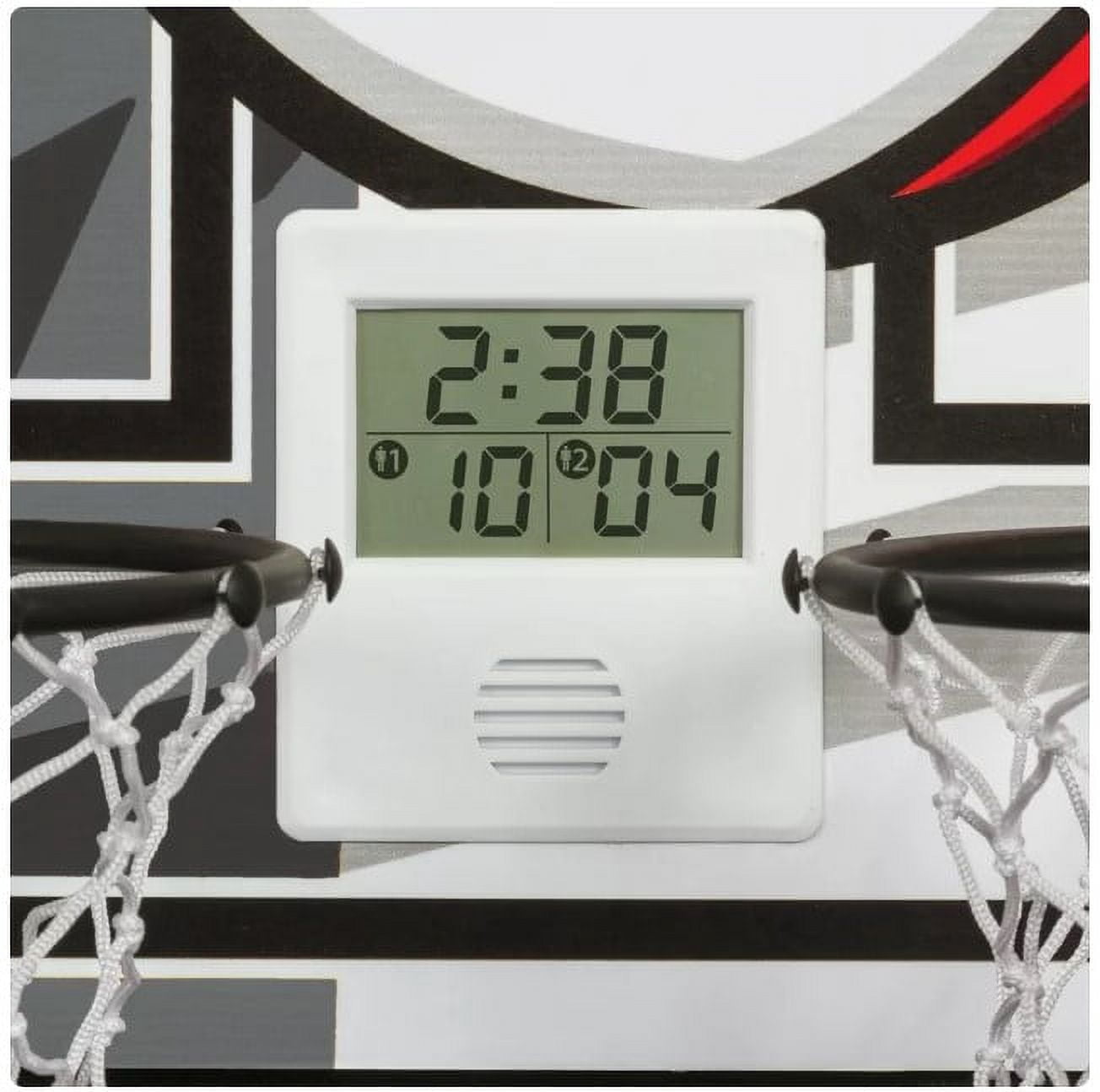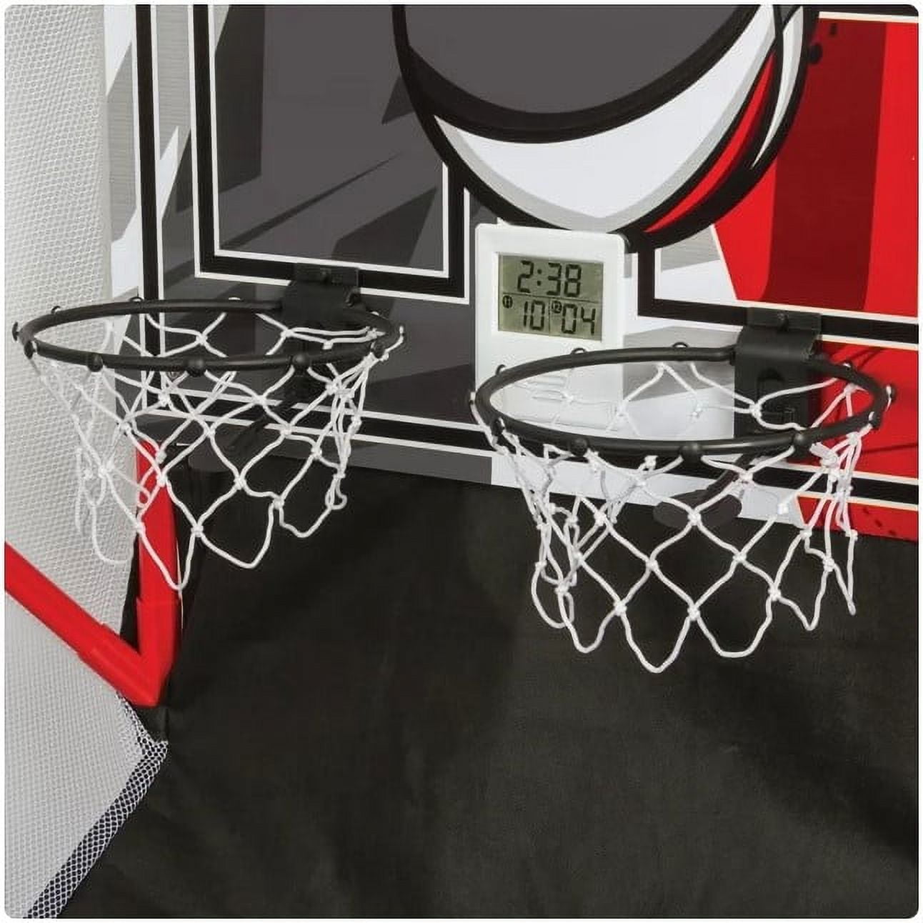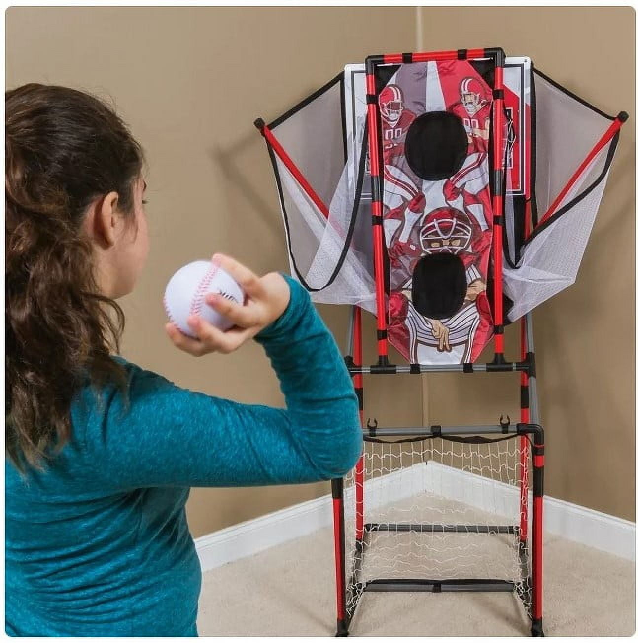 5 great games in 1 – basketball, football, baseball, soccer and hockey 2 arcade double shot basketball hoops with wide angle ball return for 1 or 2 player action Automatic electronic basketball scoring and stadium sounds Complete with all accessories: 2 arcade basketballs with inflating pump, 1 football, 3 soft baseballs, 1 soccer ball, 1 hockey ball and 2 knee hockey sticks 90-day limited warranty
