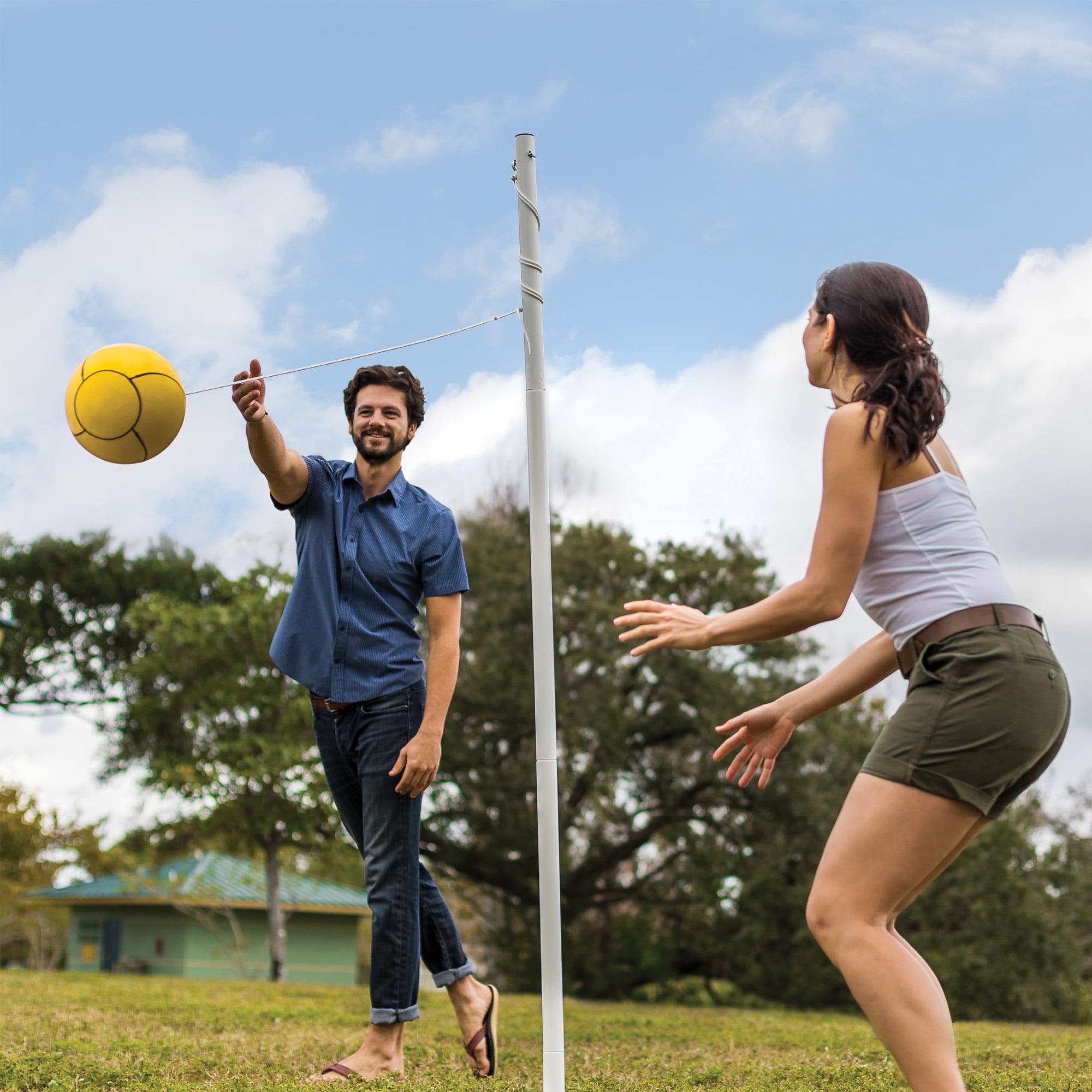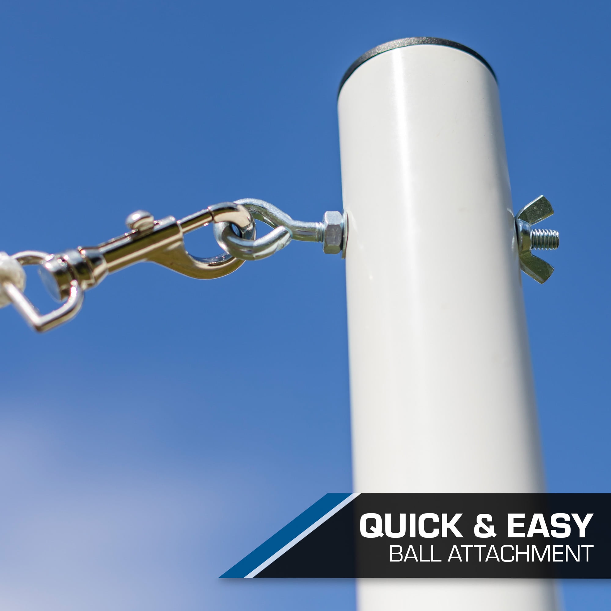 This deluxe 2-player tetherball set with in-ground pole is guaranteed fun for all ages! Insert the 8 ft, 3-piece backyard tetherball pole 2 feet into the ground for optimal stability. Included is an 84-inch strong nylon tetherball rope that can withstand heavy force. This tetherball ball and rope set features an official size and weight yellow rubber tetherball. Enjoy quick and easy setup, takedown, and storage with the 3-piece pole system. This tetherball set has an internal cord connector to keep the ball securely attached. Everything you need to play is included: 3-piece pole, 1 rope, 1 tetherball and 1 pump with needle. The ball, rope and pole are made to last with high-quality construction. Take this portable, lightweight set anywhere with the easy setup and takedown system. Create memories that last a lifetime with this outdoor tetherball court set.