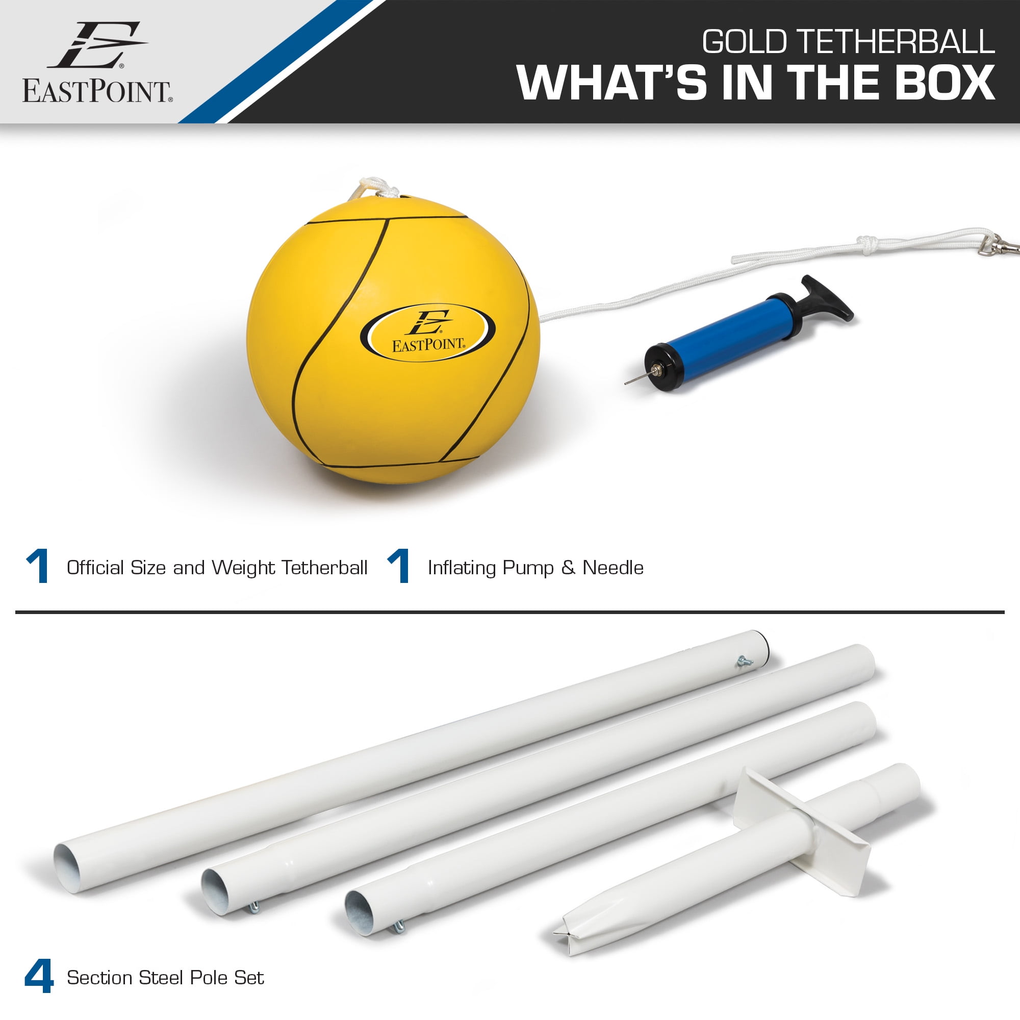 The EastPoint Sports Gold Tetherball Set with an in-ground pole offers great backyard fun for all ages! Easy to play – just hit the ball in opposite directions until the ball and rope wrap all the way around the pole. To set up, simply secure the 3-piece steel pole set in the ground, attach the official size tetherball with rope and you are ready to go! The lightweight set with quick setup and teardown is easily portable so you can play anywhere anytime.