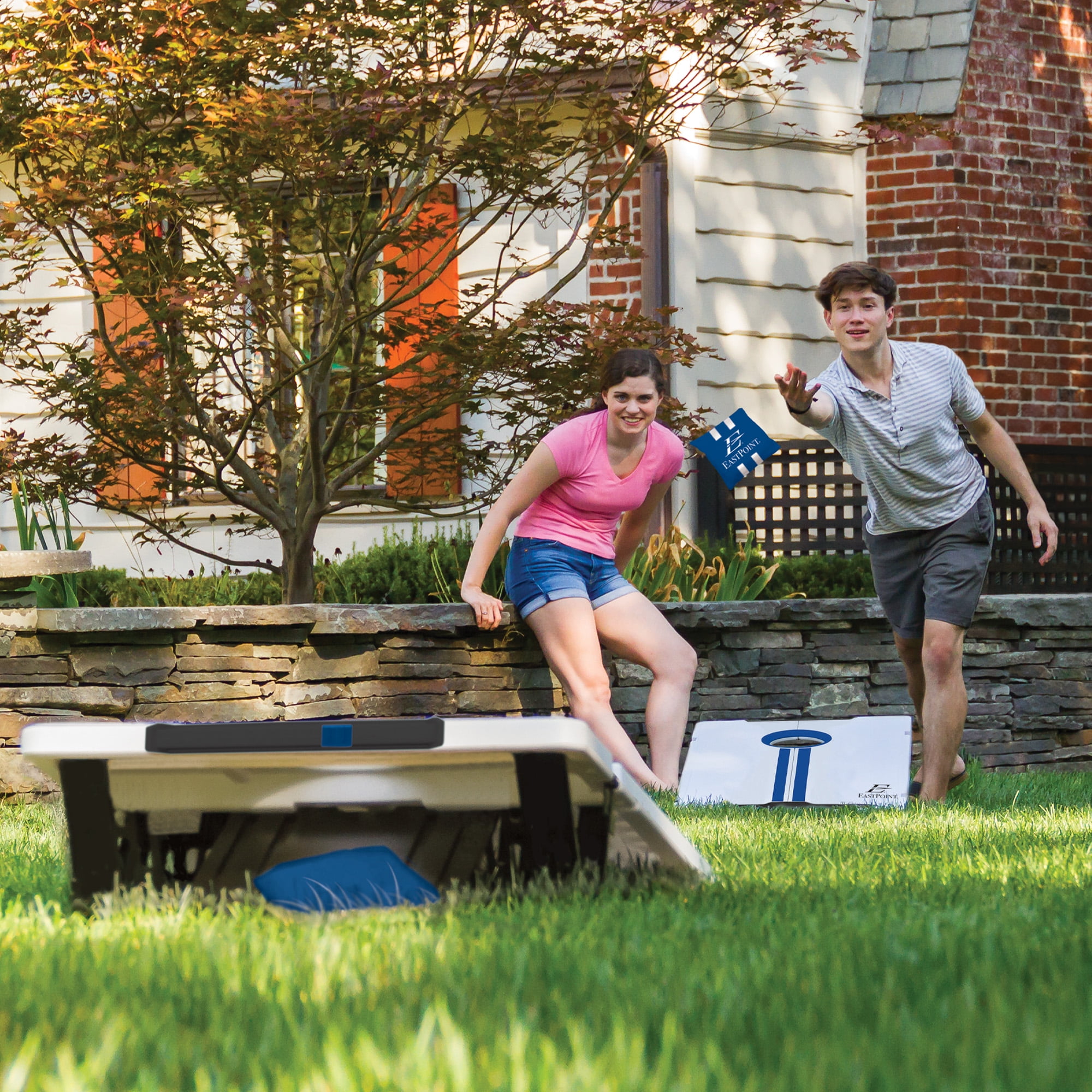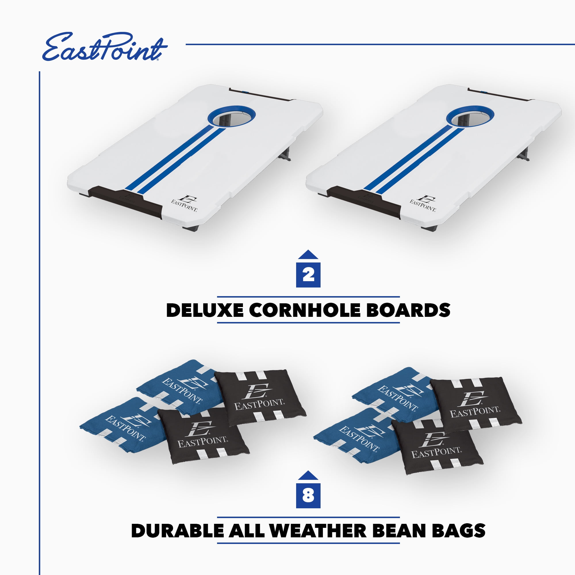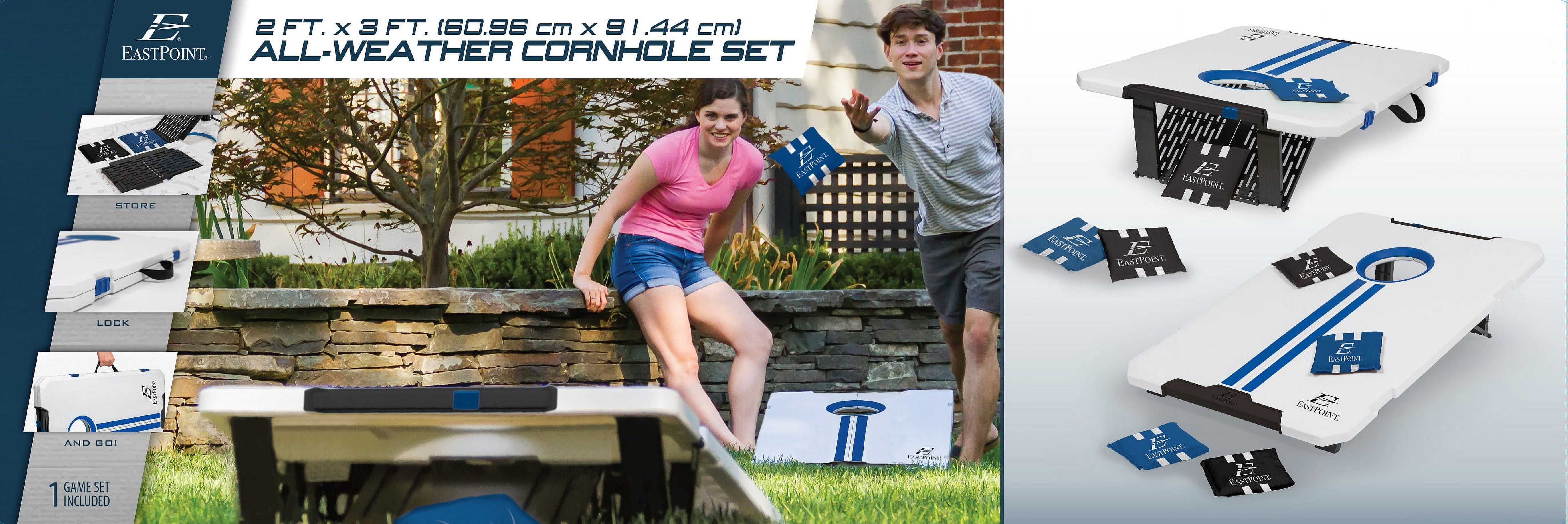 Portable Gaming On-the-Go: Take your gaming adventures anywhere with the EastPoint 2 ft. x 3 ft. (91.44 cm x 60.96 cm) All-Weather Cornhole Set – designed to store, lock, and go, making it the ultimate solution for outdoor entertainment that can accompany you to the beach or any backyard gathering. Quick Setup and Effortless Storage: Experience seamless gaming with quick setup and easy storage, ensuring a hassle-free and convenient experience that lets you dive into the excitement without delay. Competition-Enhancing Scoring System: Keep track of the action with the built-in scoring system, adding a competitive edge to every game and enhancing the overall gaming experience. Streamlined Gameplay: The integrated Bean Bag Return feature simplifies gameplay, making it quick and hassle-free, so you can focus on the excitement of the game rather than the logistics. Great for adults and kids. Durable and Reliable: Each set includes two all-weather cornhole boards measuring 2 ft. x 3 ft. (60.96 cm x 91.44 cm) that are designed to withstand various outdoor conditions, ensuring durability and reliability for countless gaming sessions. Additionally, eight bean bags in two team colors (measuring 6 in. x 6 in. / 15.24 cm x 15.24 cm) complete the set, providing all you need for engaging matches with friends and family.