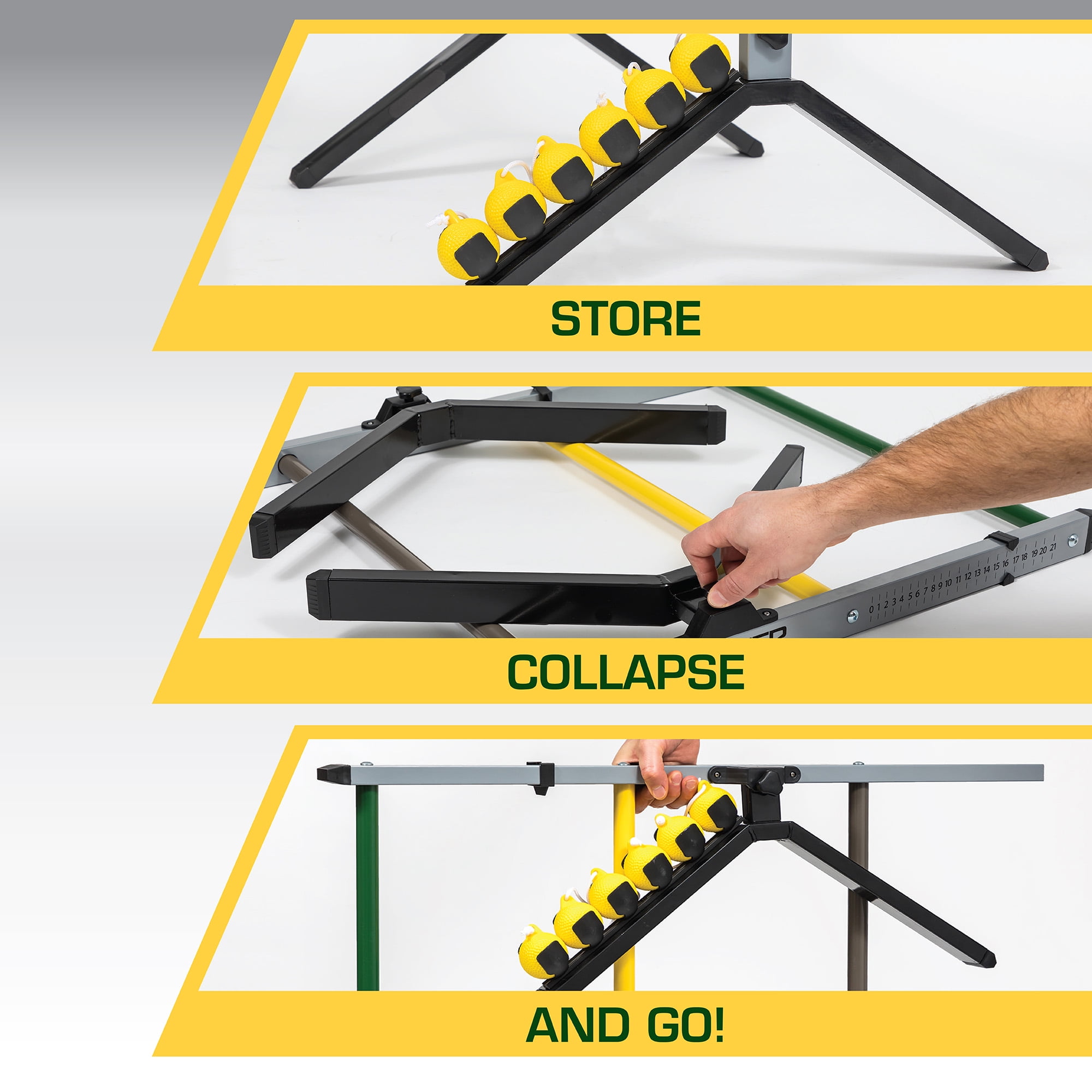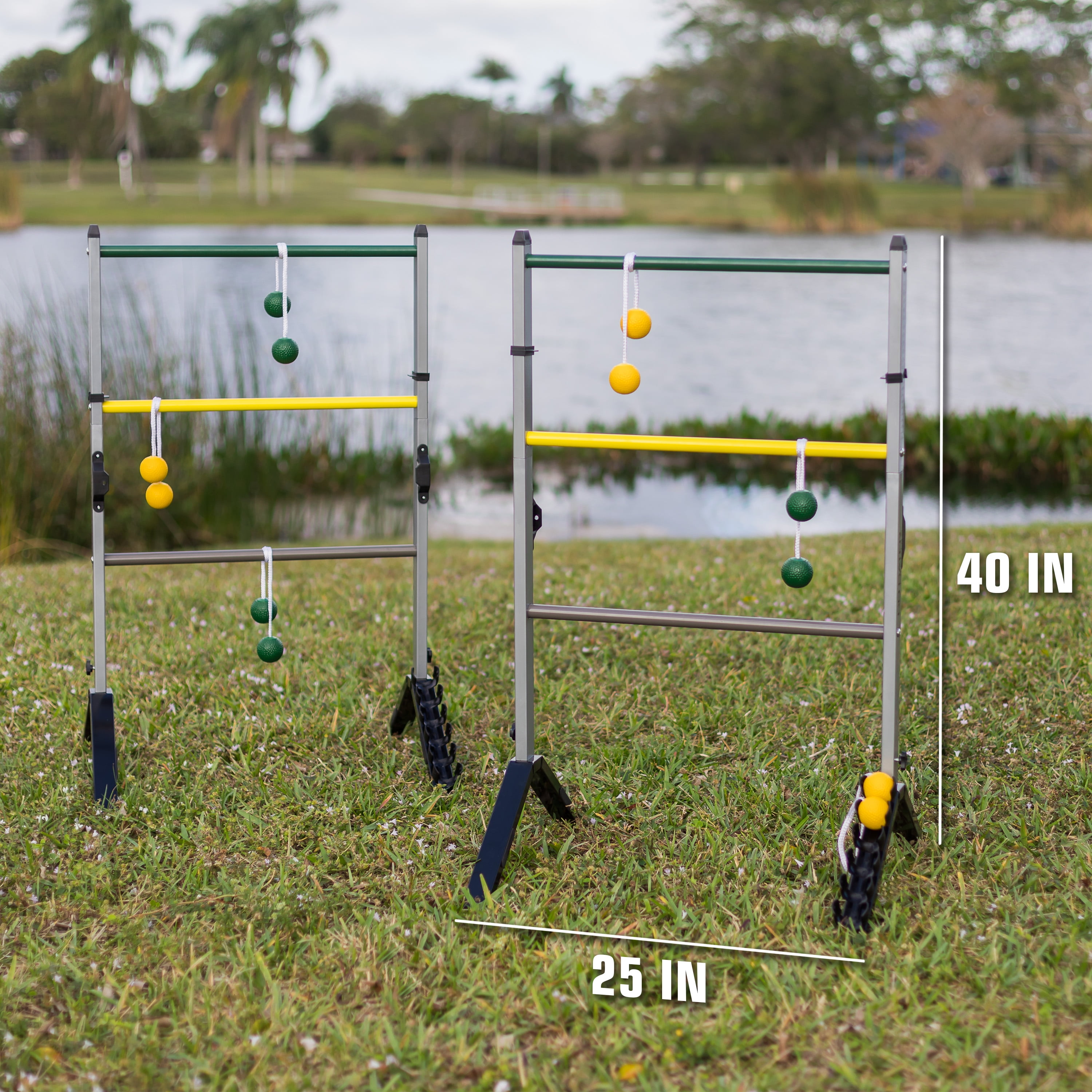 COMPLETE SET: (2) Study steel construction ladder targets, (6) soft-touch weighted bolos in 2 team colors and (1) game rules handbook. H TOUGH AS TOOLS: Sturdy steel construction keeps the targets still while you play. SCORING SYSTEM: Built-in scoring helps keep track of the action. Great for all ages! EASY PORTABILITY AND STORAGE: Assembly is simple and quick. Great for on-the-go and stores away easily. ASSEMBLED DIMENSIONS: 24.25 inches Wide x 40 inches High
