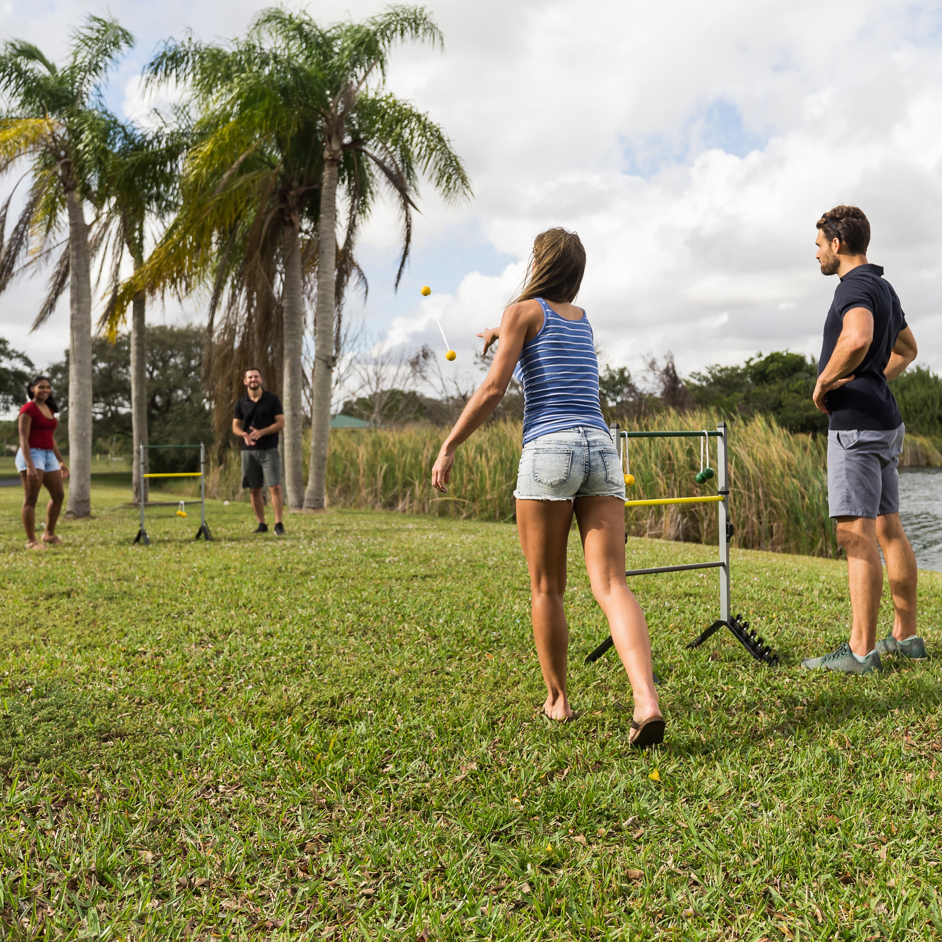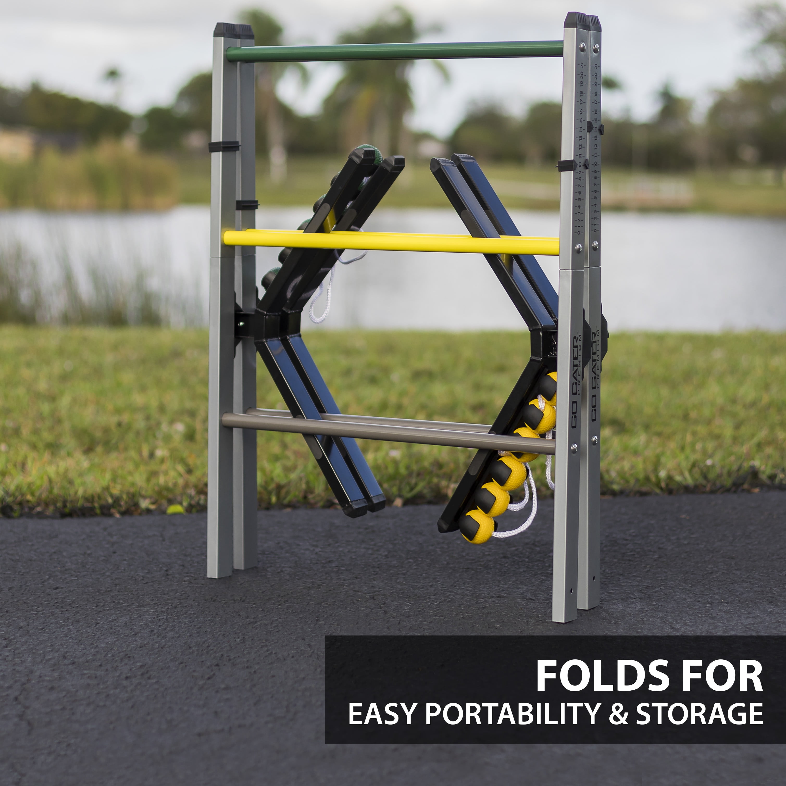 Tired of those cheap old plastic Ladderball sets and want a set with some muscle? Then the EastPoint Sports Steel Ladderball set is for you! Enjoy endless hours of fun with precision engineered Ladders and Soft Touch Bolos. Keep track of the action with the new Deluxe Scoring built right in! Always on the move? Take it with you; just attach the legs to the ladder, Lock & Go! Tough as tools and built to last a lifetime, this rugged Ladderball set is the next great addition to your backyard party or tailgate fun. Fun for all ages! Comes complete with (2) Study steel construction ladder targets, (6) soft-touch weighted bolos in 2 team colors (yellow and green), and a rulebook.