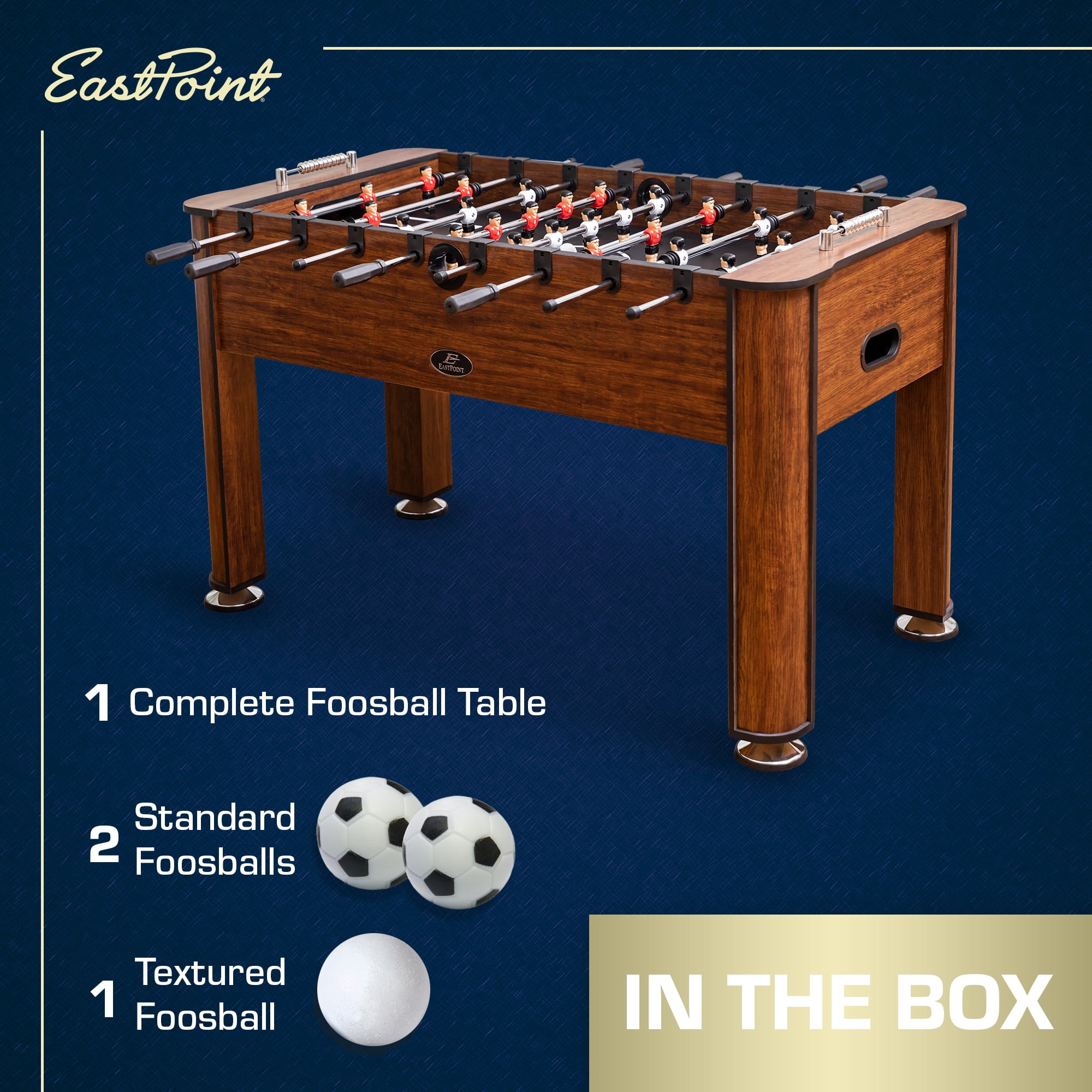 The Torino 56.3″ Official Competition Size Foosball Table with bead-style scoring is a must-have game room addition for any family! Get the match going in minutes with easy setup design. The hollow player rods come pre-assembled and lock into place in one quick snap. The comfortable handles offer a relaxing and controlled grip. Create the perfect opportunity to strike the small ball into the back of your opponent’s goal! The perfect indoor game for all ages and skill sets. Complete with two soccer foosball’s and one textured foosball for added control. EastPoint Sports is a sport industry in fun outdoor games for teens and young adults, indoor table games for family, multi-player bar games, and portable tailgate products.