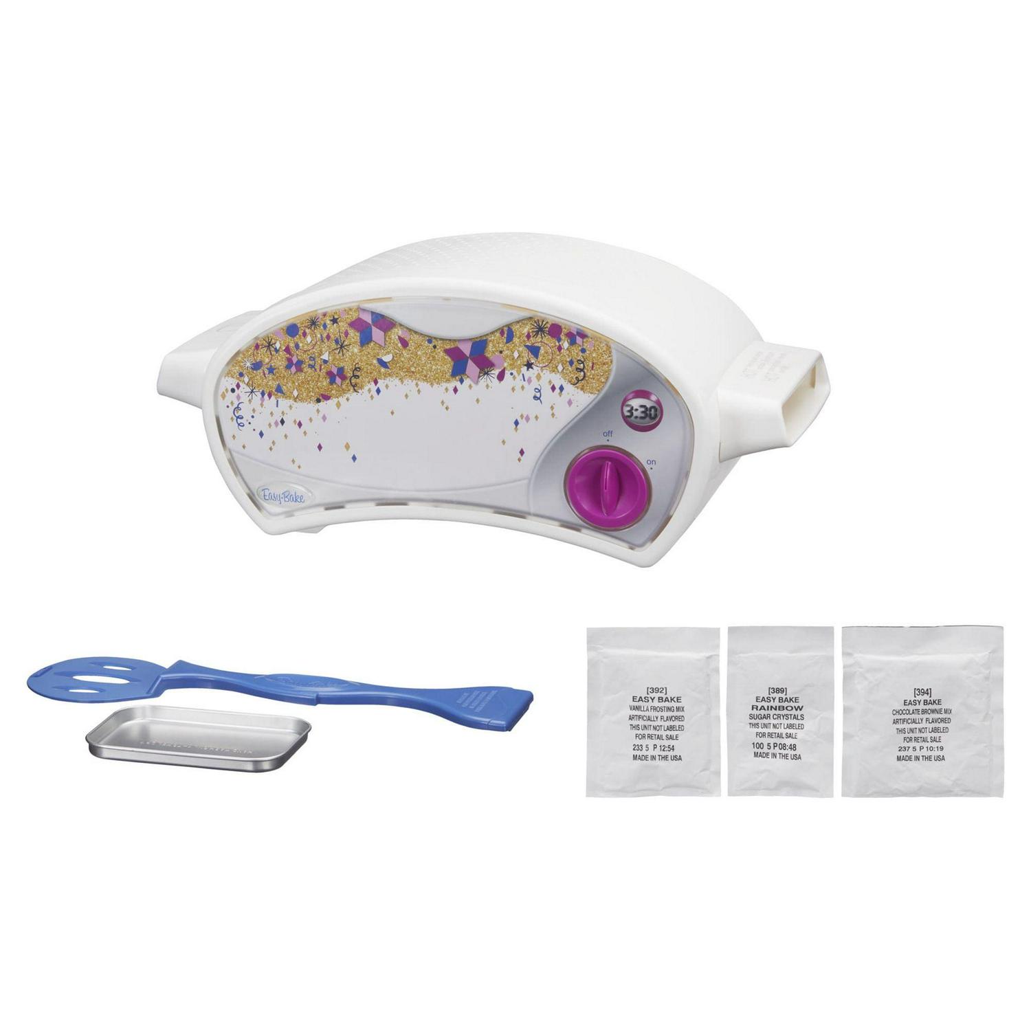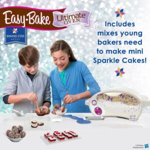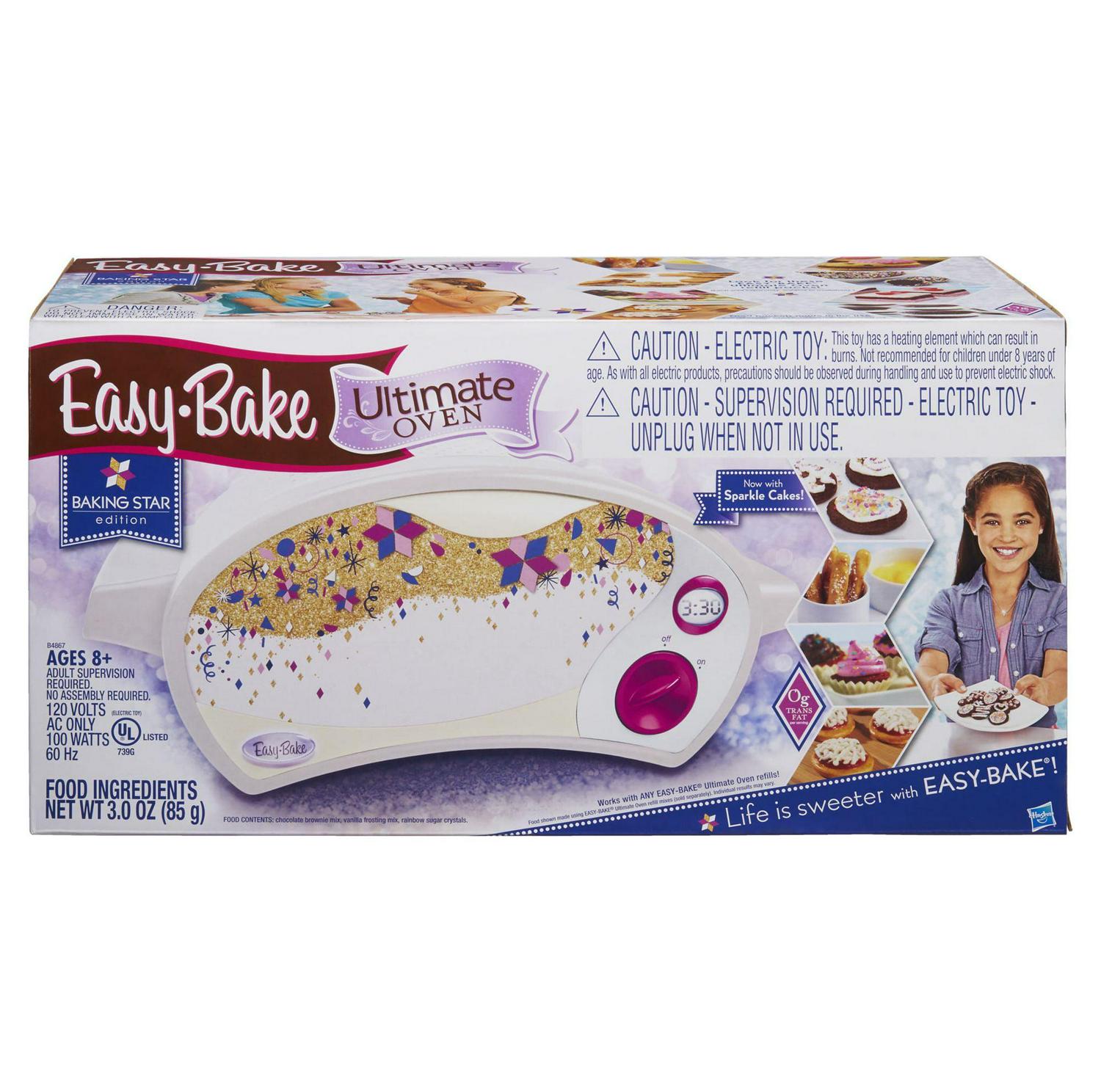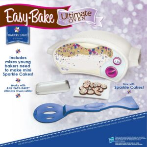– The Easy-Bake Ultimate Oven Baking Star Edition allows kids to feel like baking stars when they make delectable treats. This version is updated with a modern sleek white look featuring sparkly gold, purple, pink and periwinkle accents. The oven comes with everything your kids need to make sparkle cakes, including baking pan, pan tool chocolate brownie mix, vanilla frosting and rainbow sugar crystals.