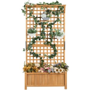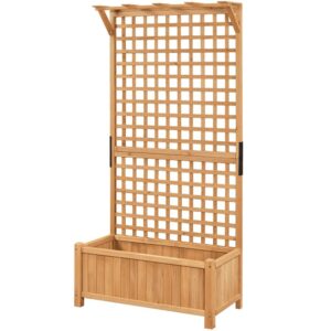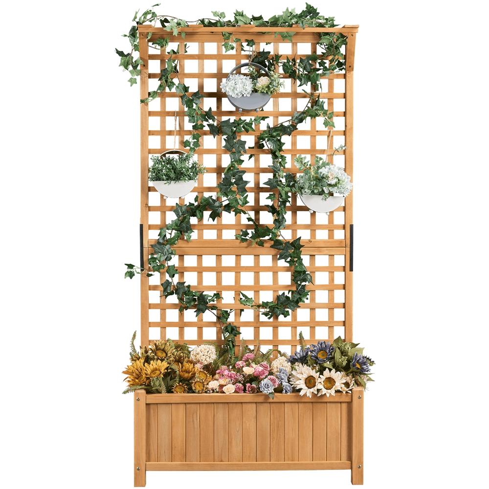 The raised planter box with trellis is constructed of certified sustainable fir wood. The sturdy fir wood framing of this raised garden bed is unpainted and renowned for its strength and stability and for revealing a pleasant woodsy aroma. Wood knots are a typical feature on the surface, which occurs naturally as the wood grows.The bottom box can be securely fastened with screws, and the built-in vertical trellis has a sturdy frame. This free-standing raised planter box, featuring a built-in fence and a light brown color, will add a touch of charm to outdoor space. The bottom board (flat) can hold up to 220 lb, greatly supporting creeping and vine plants. The square lattice is ideal for growing climbing plants of various sizes, such as morning glory, clematis, Virginia creeper, honeysuckle, and others.