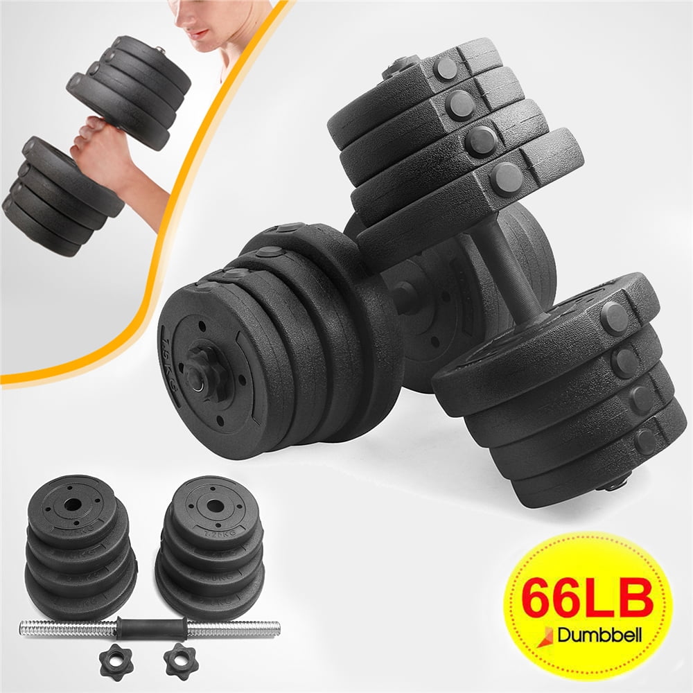 Easyfashion 66LB Adjustable Dumbbell Set for Home Training, Black Material: plastic, cement, electroplated iron Weight plate size (Dia.xThickness): 2.50 Kg (5.5 lbs): 8.1×1.6” 2 Kg (4.4 lbs): 7.5×1.5’’ 1.50 Kg (3.3 lbs): 7×1.3’’ 1.25 Kg (2.8 lbs): 6.7×1.2’’ Dumbbell bar size : 18.5×1’’ (LxDia.) Handle length: 5.4’’ Weight Plate Quantity: 4pcs 5.5 lb weight plates =22 lb 4pcs 4.4 lb weight plates =17.6 lb 4pcs 3.3 lb weight plates = 13.2 lb 4pcs 2.8 lb weight plates = 11 lb G.W.: 66.4lb Color: black