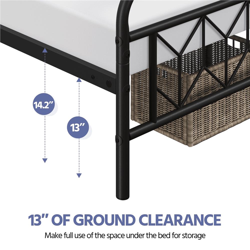 This metal bed base features strong side and center rails, along with multiple support legs for excellent load-bearing capacity. 12 inserted metal slats offer dependable support for your mattress without requiring a heavy box spring. It is designed with rounded edges on the head and footboard to ensure that your family members are protected from any accidental bumps or injuries. The details down to the water-resistant powder-coated surface and non-slip foot caps aim to provide you with maximum comfort and safety. The 12-slat support system removes the need to purchase an additional box spring, so once you’ve found a suitable mattress, you’re ready to go, saving you money and time. The slats are spaced 5.3-5.5” apart. It’s the perfect choice for apartments, condos, studios, dorms, and more.
