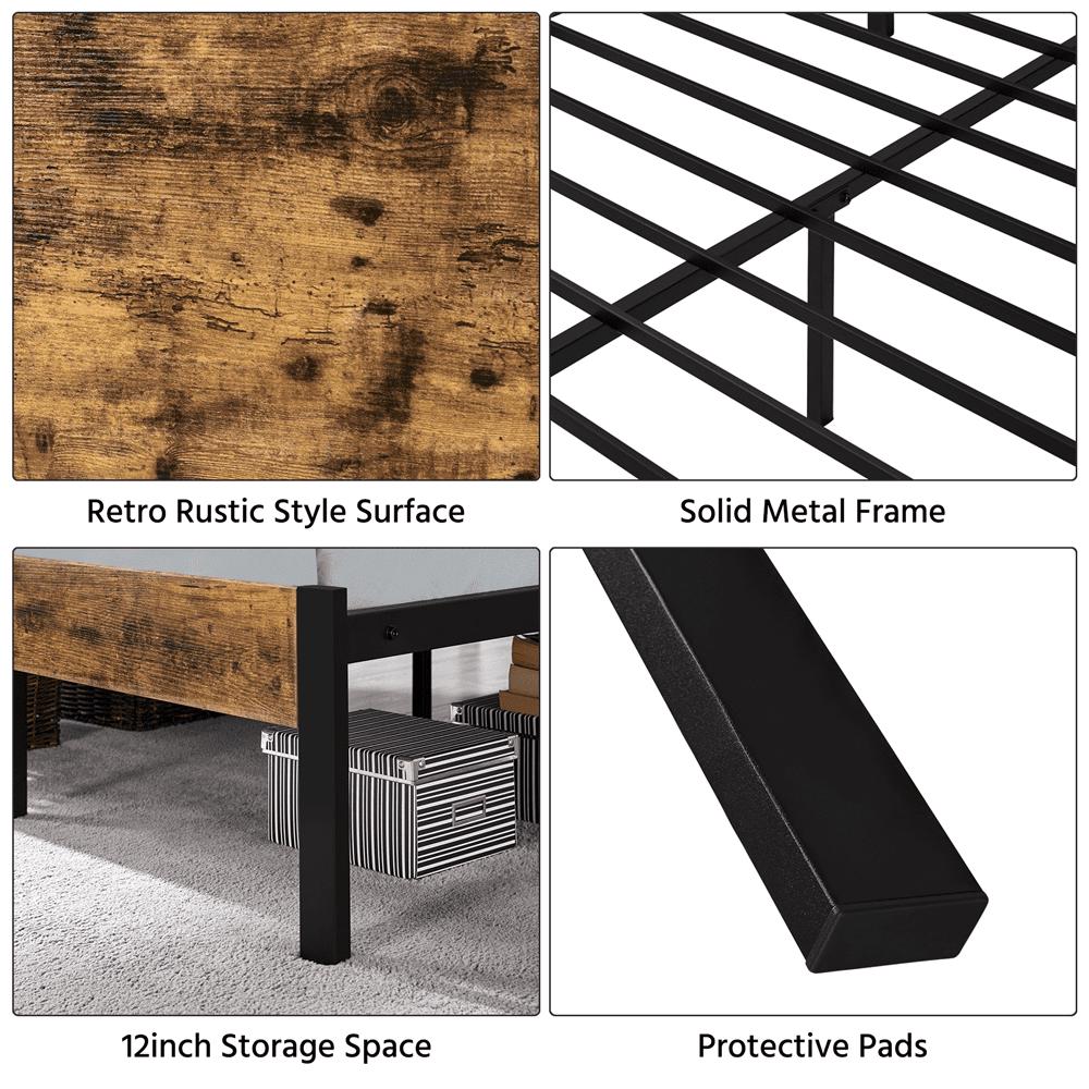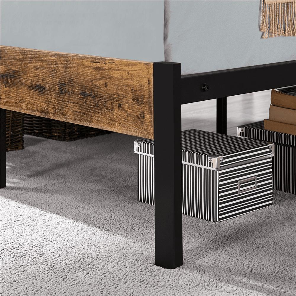 Easyfashion Metal Bed Frame with Wooden Headboard, Rustic Brown, Queen