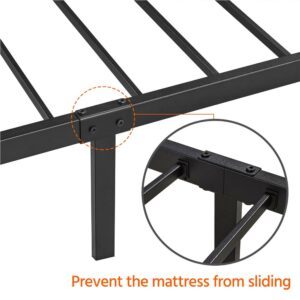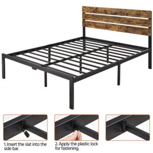 Crafted from premium iron in a black finish, this bed frame takes a clean silhouette and decorated with the open horizontal-bar headboard. The combination of metal slats and wooden headboard brings your home with a sleek but warm accent. Constructed with a slatted structure, this bed base is capable of holding up 240kg/529.1lb. The headboard is made of CARB P2-compliant MDF boards for your families healthy. A spacious room under the bed helps you enlarge the limited storage space of your bedroom. With 2 optional sizes (Full/Queen), this bed frame will perfectly fit the bedroom, guest room, children or teenagers room, apartment, and B&B. After assembly, the dimensions are 82.5″L x 63″W x 39.5″H.