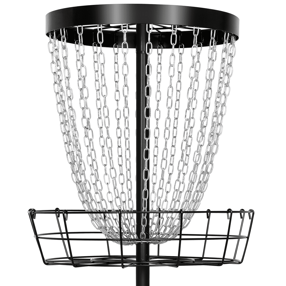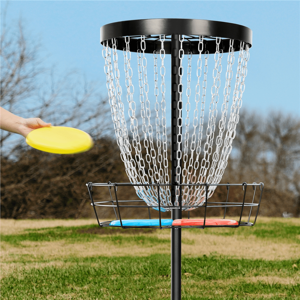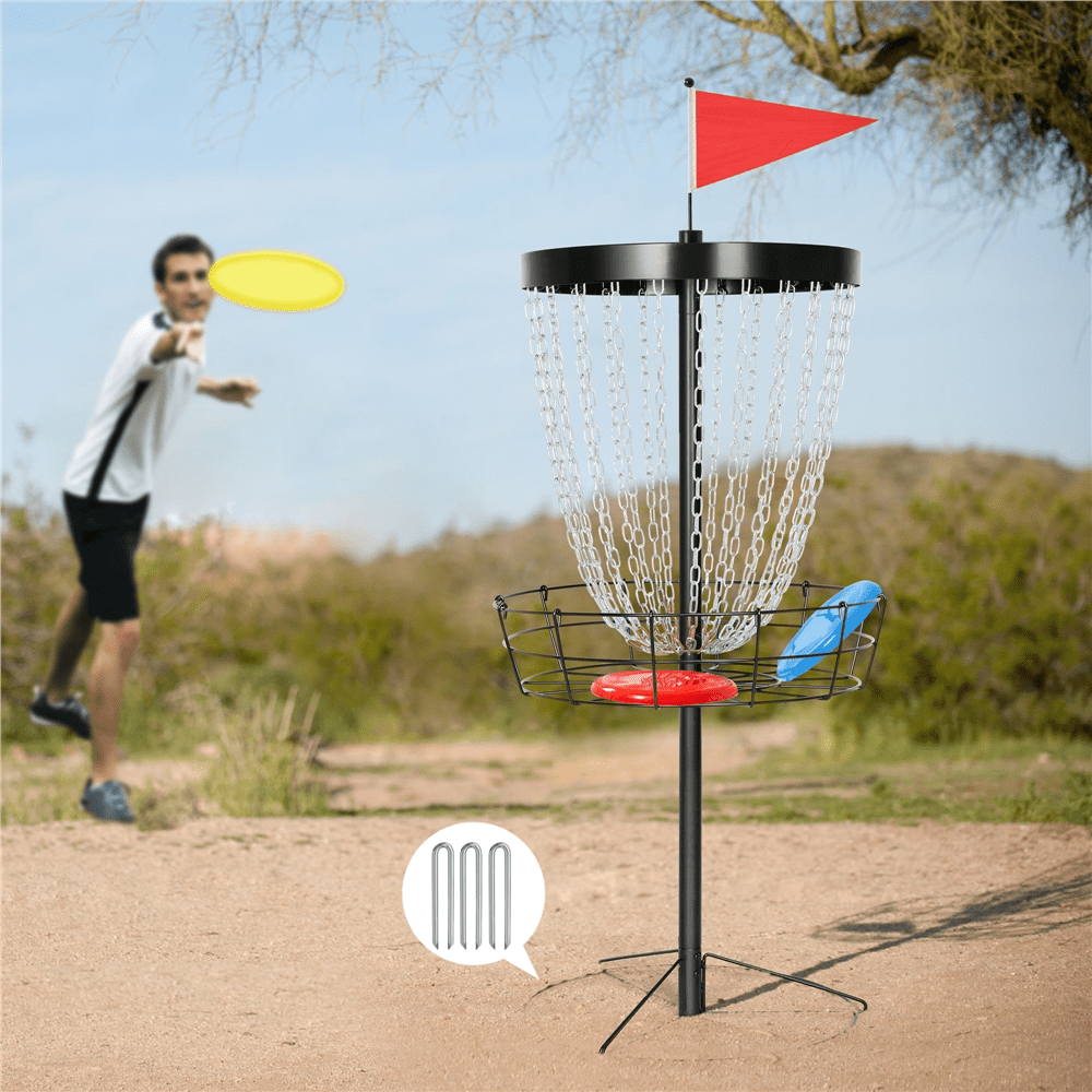Easyfashion Portable 24-Chain Metal Golf Goals Baskets Target & Accessories, Black Color: black Material: steel frame, galvanized steel chains, 600D oxford fabric storage bag Package content: 1 disc golf basket, 1 carrying bag, 3 discs (1 red, 1 blue, 1 yellow), 3 ground stakes, accessory kit Overall dimensions (flag not included): 25.5” L x 25.5” W x 53” H Basket size: 25.5” Dia. x 7’’ H Base diameter: 22’’ Ground clearance: 24’’ N.W.: 26.4 lb G.W.: 31.6 lbPlease allow a 0.5” measurement tolerance.