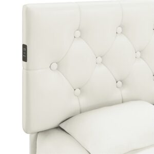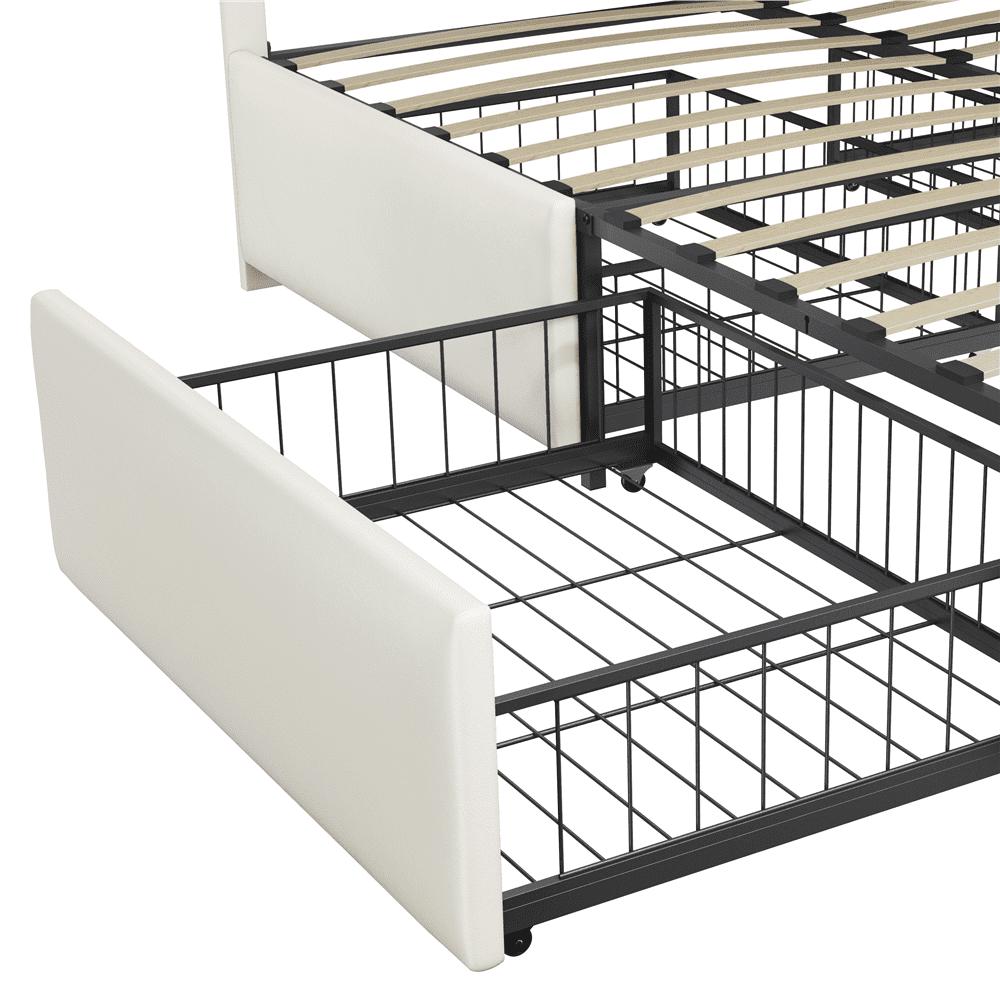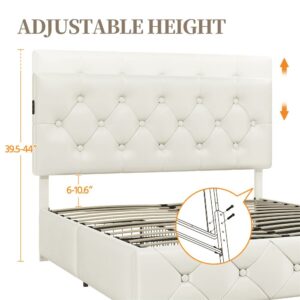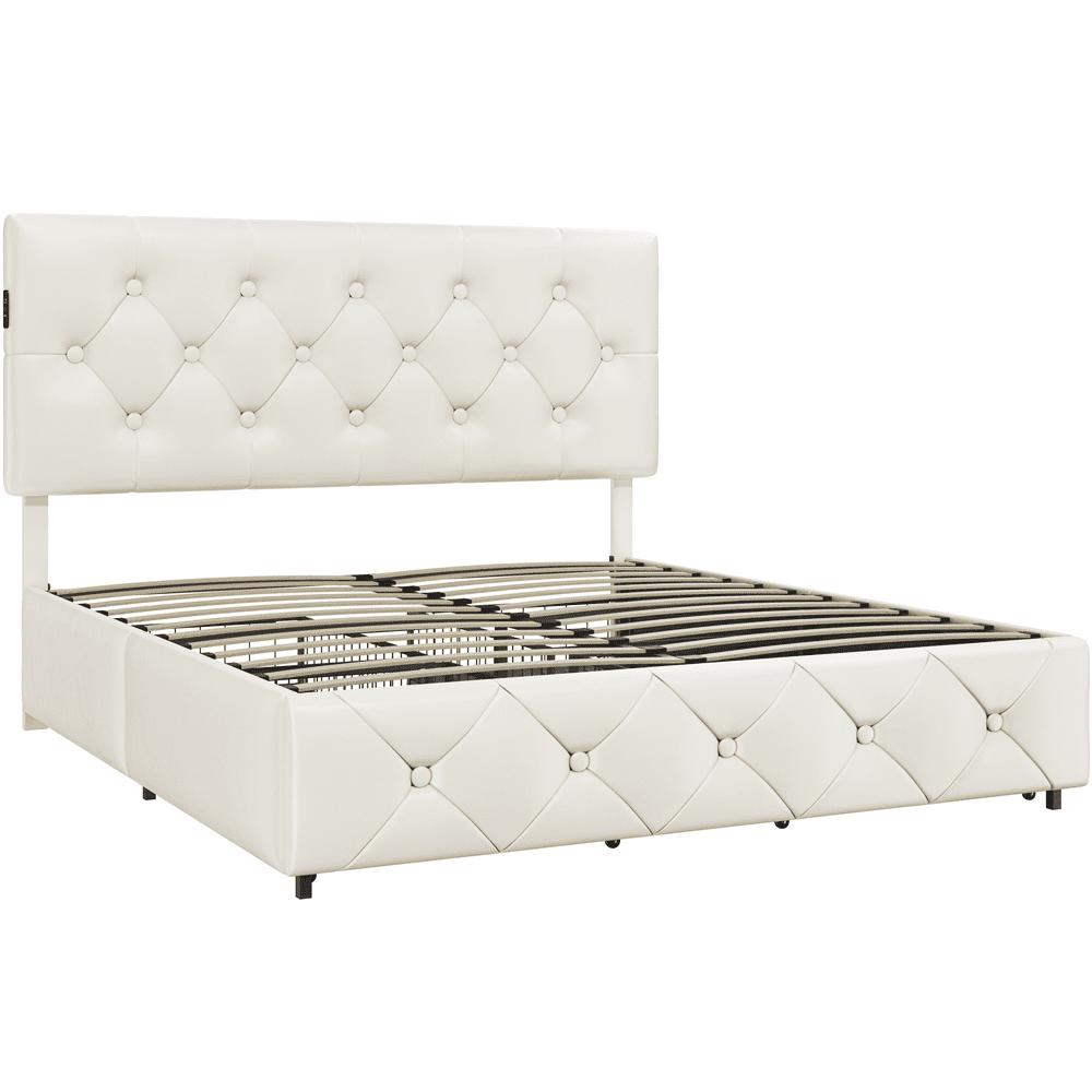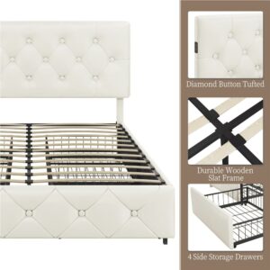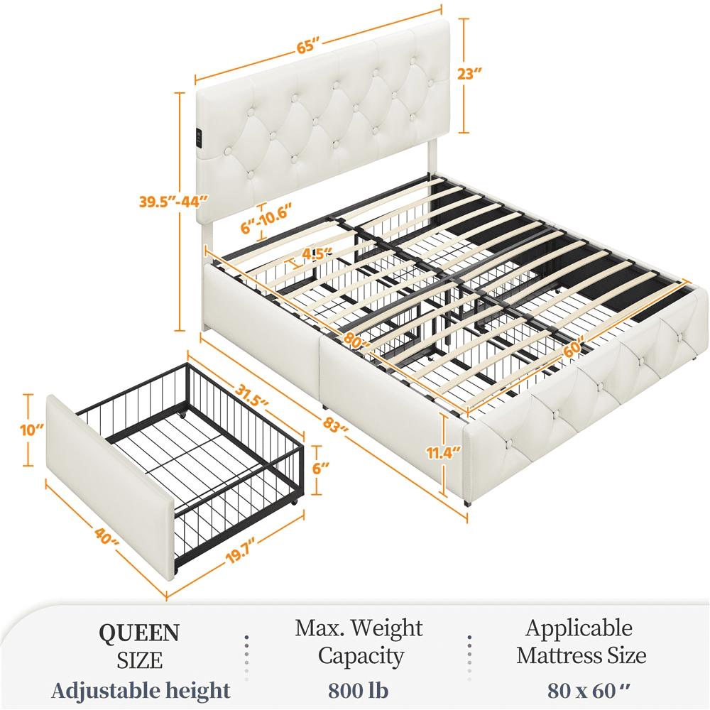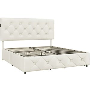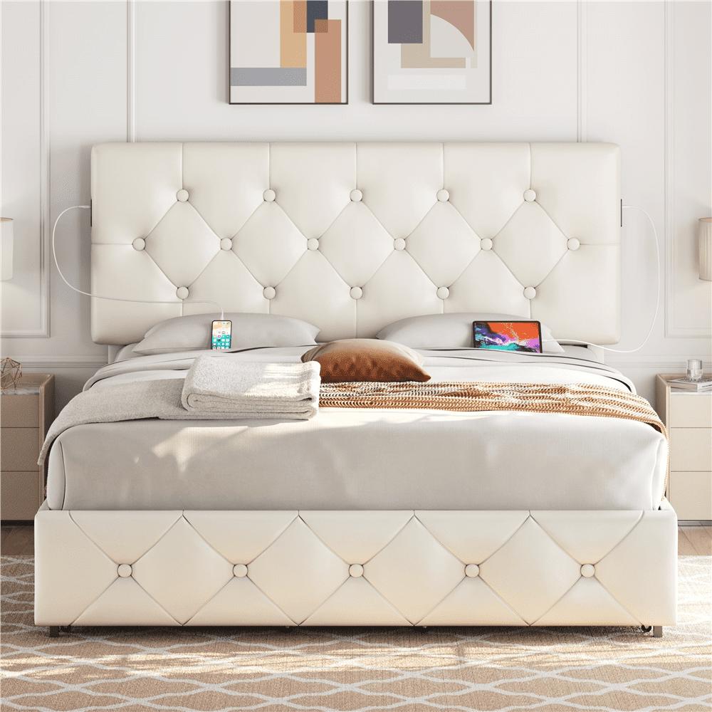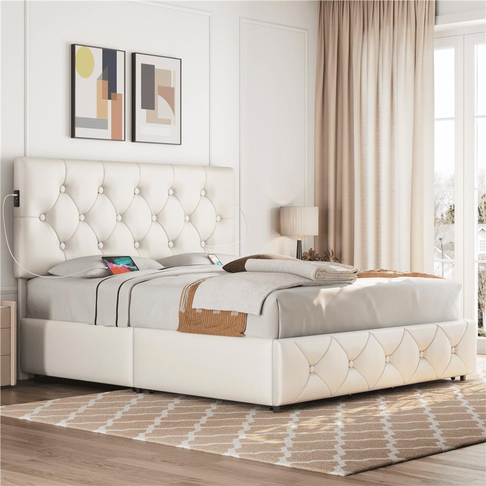 – Easyfashion Faux Leather Upholstered Bed with 4 Storage Drawers and USB Ports,Queen,Beige: