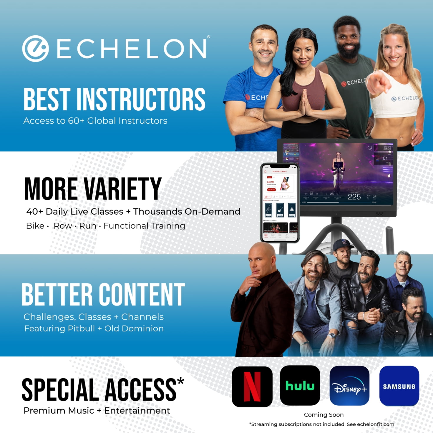 The Echelon row sport features smooth-glide engineering and an easy-fold design for effective workouts in any size space. Quickly boost or minimize the intensity of your workout with 32 levels of resistance. Access live and on-demand rowing classes or scenic waterway workouts directly from your smartphone or tablet with a built-in device holder that fits screens up to 12.9 inches. If you’re not in the mood to row, take part in a variety of off-equipment workouts like HIIT, Kickboxing, Yoga, Pilates, and more, all led by world-class Echelon instructors and available through the Echelon Fit app. Sync your Row with the Echelon Fit app via Bluetooth® to track performance stats like Leaderboard ranking, distance, speed, calorie burn, and total output for every workout. The sliding comfort seat and durable foot platform are designed to support proper hip and spine alignment, as well as optimal rowing form and performance, for every user. Enjoy a free 90-day trial of the Echelon Premier Membership with access to more than 3,000 live and on-demand connected fitness classes led by the world’s best instructors through the Echelon Fit App. Enjoy exclusive content, class playlists, and better music from top record labels, including your favorite hits from artists like Pitbull, Old Dominion, Lady Gaga, Jessie J., Daddy Yankee, and more. Classes range from 5 to 45 minutes and are designed for everyone from beginner to pro athletes. Explore classes like Cycling, Rowing, Running, HIIT, Kickboxing, Strength Training, Yoga, Pilates, and more. One membership allows up to five users, so you your friends and family can enjoy the Echelon experience together. How to Activate Your 90-Day Membership Trial: 1. Go to member.echelonfit.com and follow the prompts to create a member account with Echelon. 2. Select the Echelon Premier Membership to claim your 90-day FREE trial. Note: You will be required to enter billing information, but you will not be charged until your free trial expires. 3. Check your inbox for the confirmation email. 4. Access thousands of live and on-demand fitness classes.