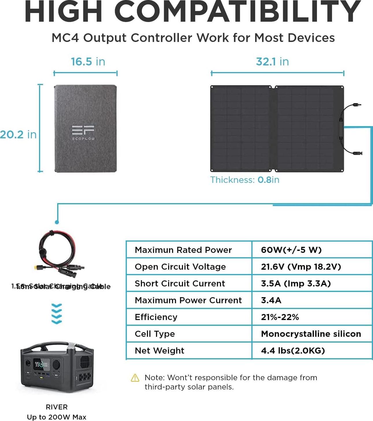 The EcoFlow 60W Solar Panel is designed to produce maximum power at any time of the day when paired with an EcoFlow power station. The solar panel has a high conversion efficiency of 21-22%, and the EcoFlow MPPT power station algorithm delivers improved performance in cold and cloudy environments within the operation range. The EcoFlow 60W Solar Panel is fully waterproof due to a seamless, one-piece design, making it ideal for outdoor activities like camping and hiking. An ETFE film provides extra protection against ultraviolet light, prolonging the lifespan of the product.