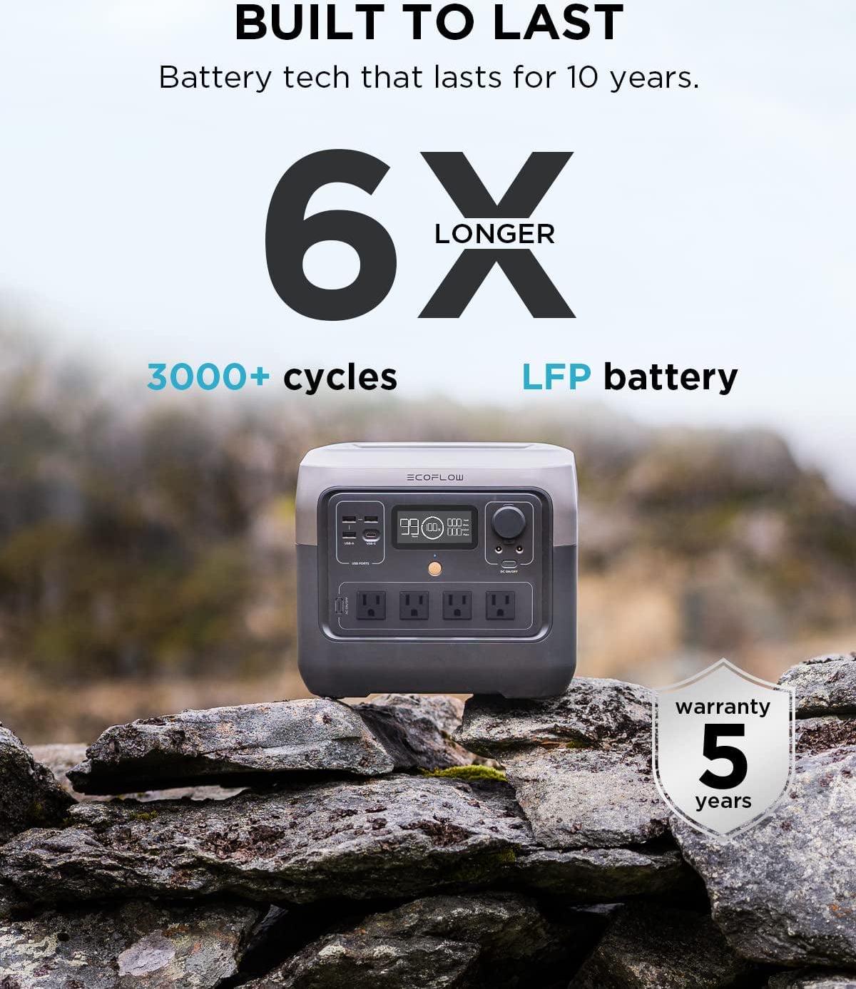 Using LFP battery cells, use and recharge RIVER 2 Pro more than 3000 times before hitting 80%. That s almost 10 years of regular use. RIVER 2 Pro includes advanced BMS protection, monitoring voltage, current, and temperature to keep your LFP battery running for years.