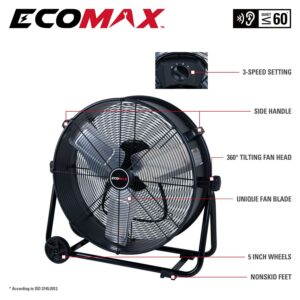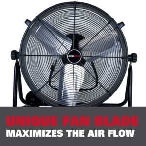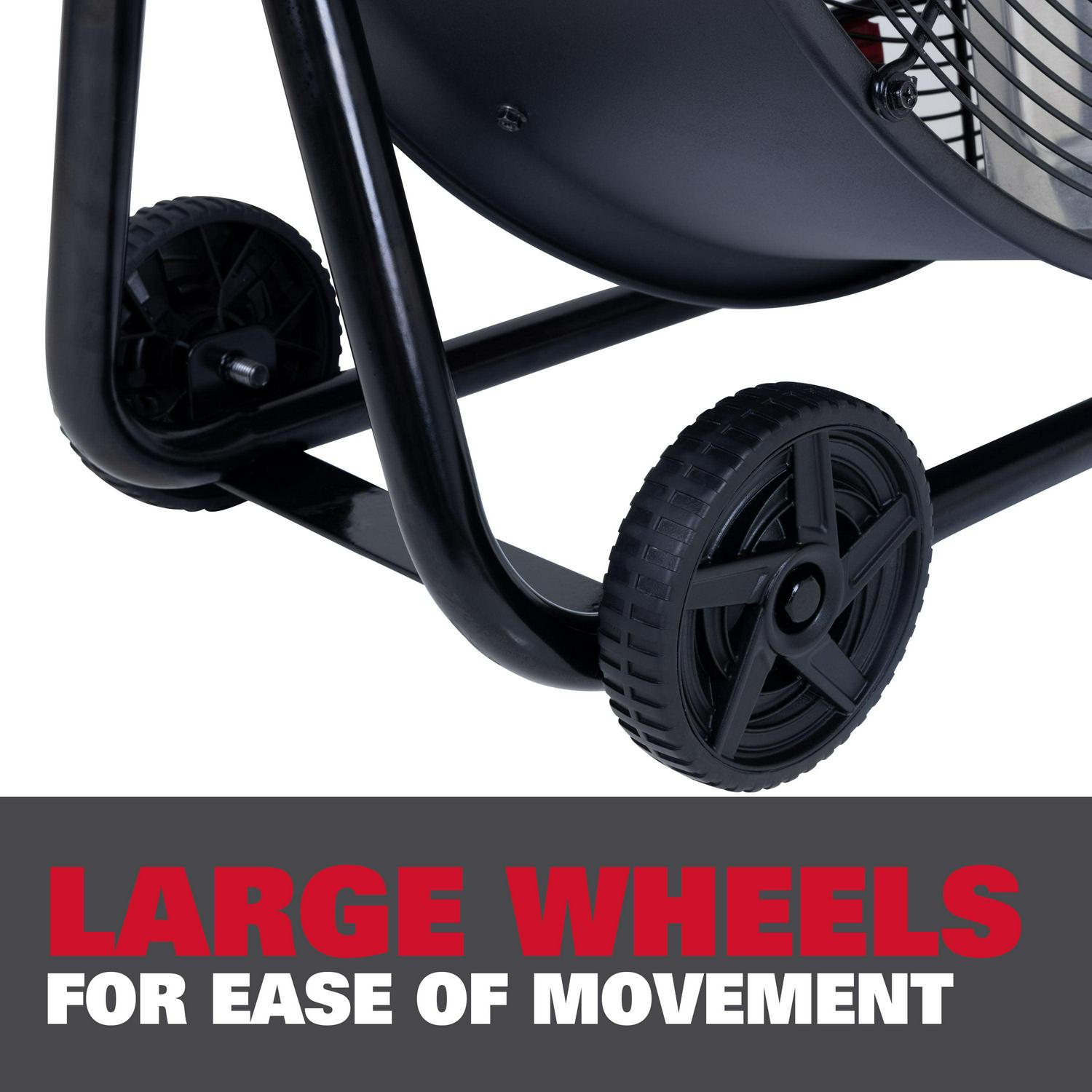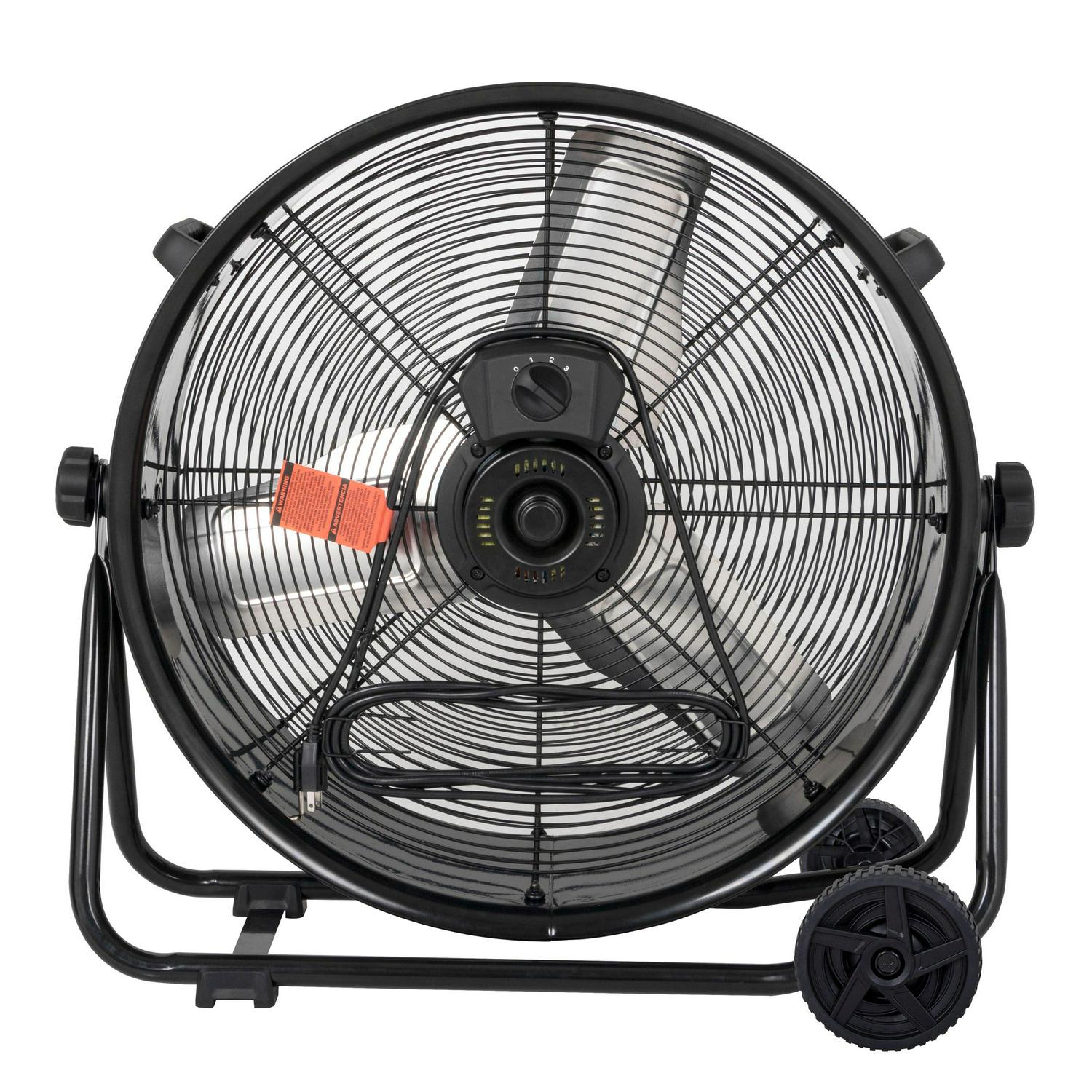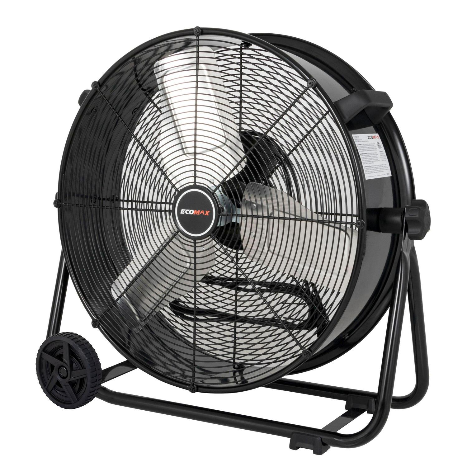 This Ecomax 24-inch roll-around drum fan is perfect for a variety of locations including garages, basements, covered patios, workshops, warehouses, and factory stations. It has the capability to tilt 360° for a variety of positions. The sturdy handles and 5 inch rubber wheels make it easy to move the fan from one workspace or location to another. The 3-speed setting on this high-velocity fan enables you to adjust the airflow to your preference, offering ventilation for larger areas.