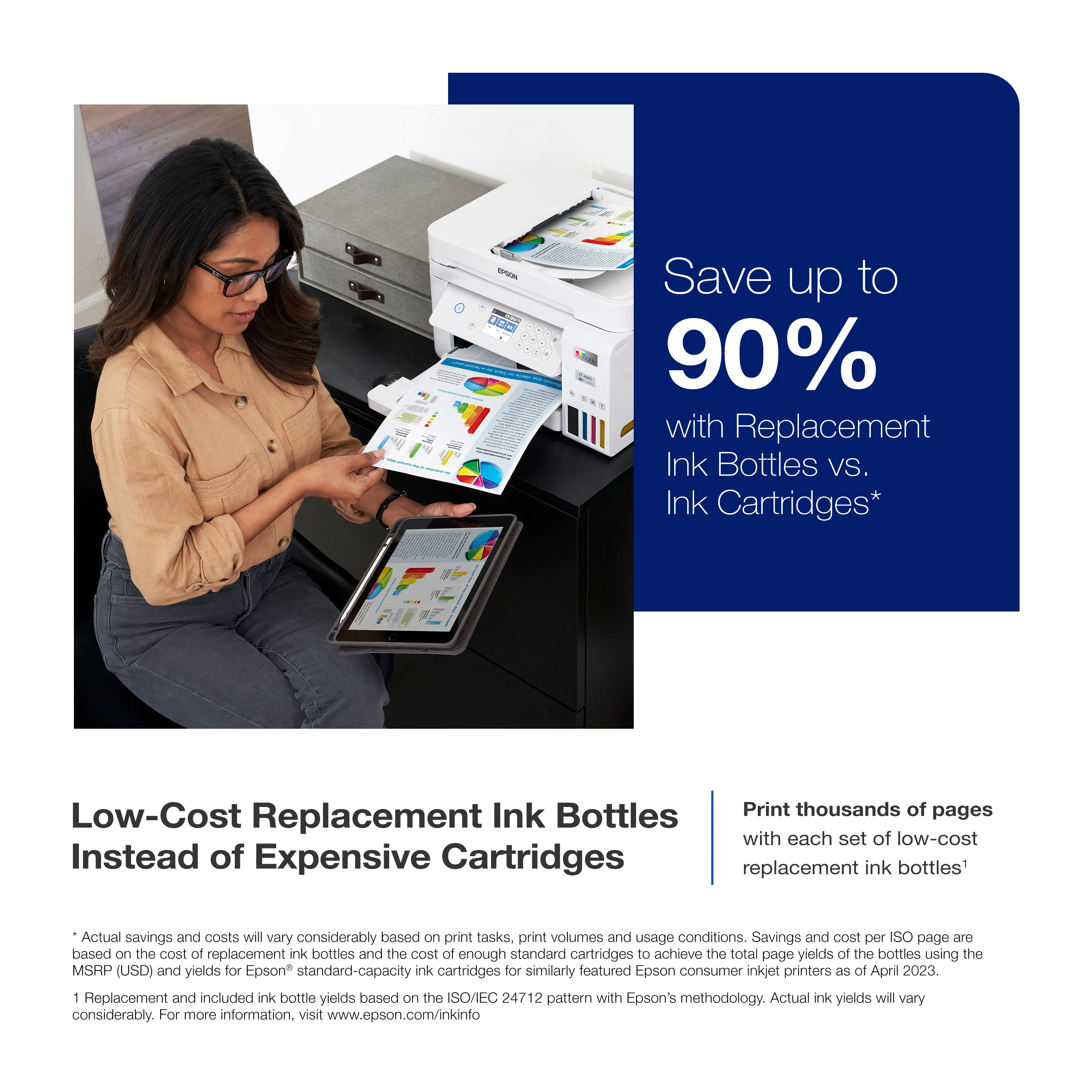 Innovative Cartridge-Free Printing ― High-capacity ink tanks mean no more tiny, expensive ink cartridges; Epson’s exclusive EcoFit ink bottles make filling easy and worry-free Dramatic Savings on Replacement Ink ― Save up to 90% with replacement ink bottles vs. ink cartridges– that’s enough to print up to 7,500 pages black/6,000 color, equivalent to about 90 individual ink cartridges Stress-Free Printing — Up to 2 years of ink in the box – and with every replacement ink set – for fewer out of ink frustrations Zero Cartridge Waste – By using an EcoTank printer, you can help reduce the amount of cartridge waste ending up in landfills Impressive Print Quality ― Unique Precision Core Heat-Free Technology and pigment black ink produce extremely sharp text – plus impressive color photos and graphics – on virtually any paper type Robust Paper Handling ― Auto Document Feeder, paper-saving auto 2-sided printing, and a 250-sheet paper tray for high productivity Built-in Scanner & Copier ― High-resolution flatbed scanner and a 2.4″ color touchscreen for easy document copying and navigation Modern Connectivity ― Features Ethernet and wireless, plus hands-free voice-activated printing. Easily print from your smart device with the intuitive Epson Smart Panel App