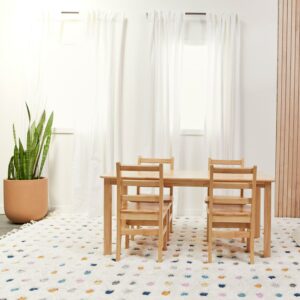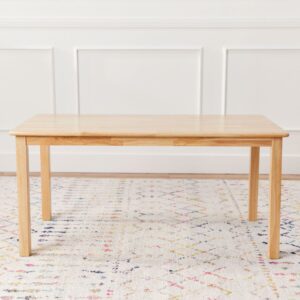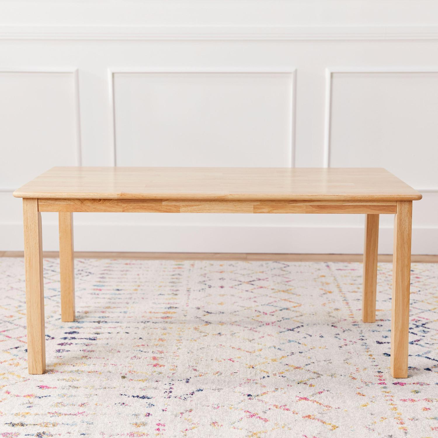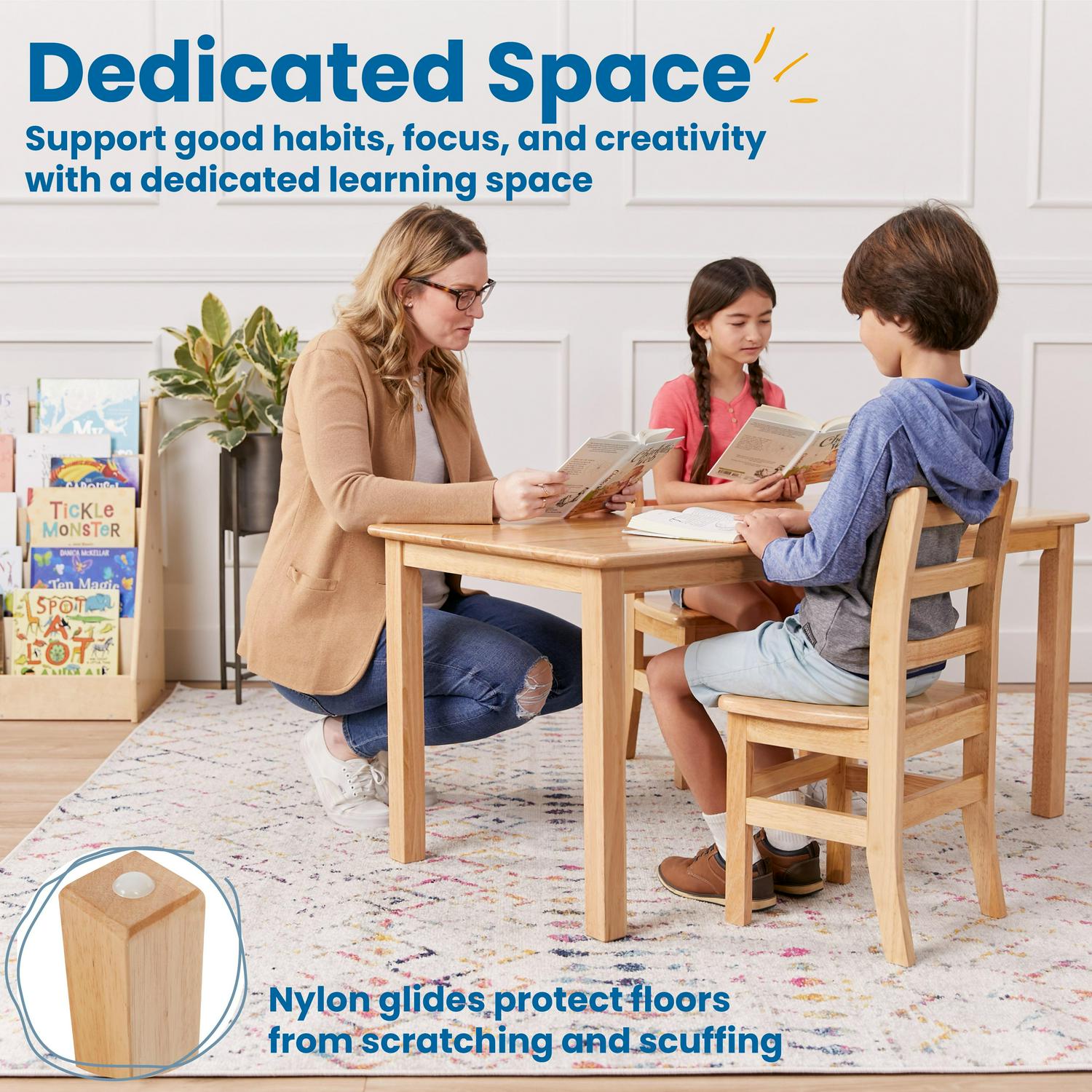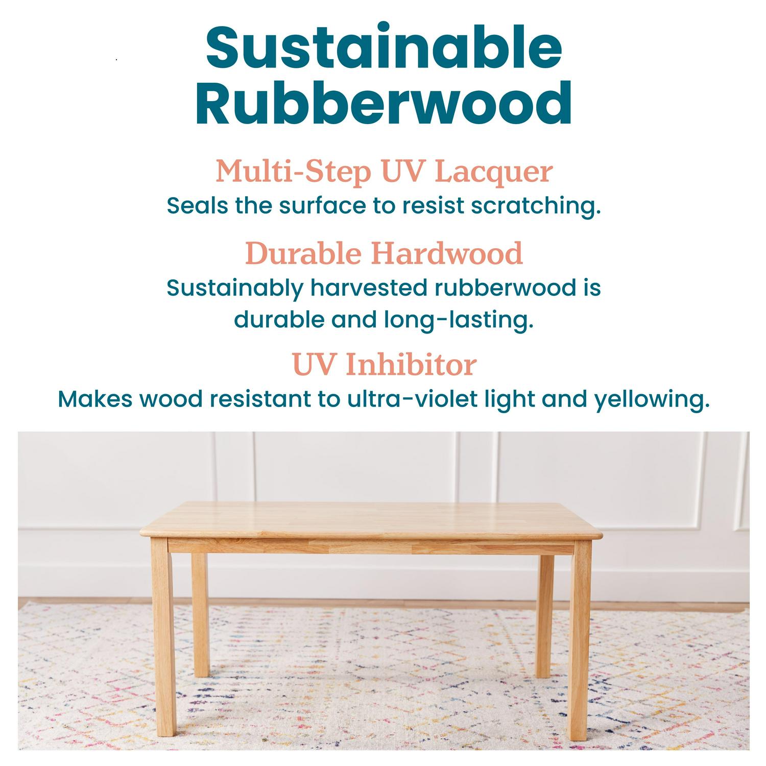Hardwood Tables are the perfect workspace addition for classrooms, playrooms, or daycares. The child-sized tables promote student confidence and independence, and a dedicated workspace for learning encourages kids to focus and develop good work habits. Little ones take ownership of their learning as they navigate a kid-sized environment; kids activity tables that are sized just right allow kids to enjoy a book, snack, or seated rest while feeling comfortable and confident in their bodies. The kids tables are constructed from durable rubberwood with a tough UV lacquer that seals the wood surface and resists scratching. A UV inhibitor makes furniture resistant to ultraviolet light and yellowing. Natural rubberwood is extremely durable and will hold up to everyday use in school, home, and early childhood environments. Table legs feature nylon glides to protect floors from scratching and scuffing. Pair with ECR4Kids Ladderback Chairs and Birch Classroom Furniture to complete the set; sold separately.