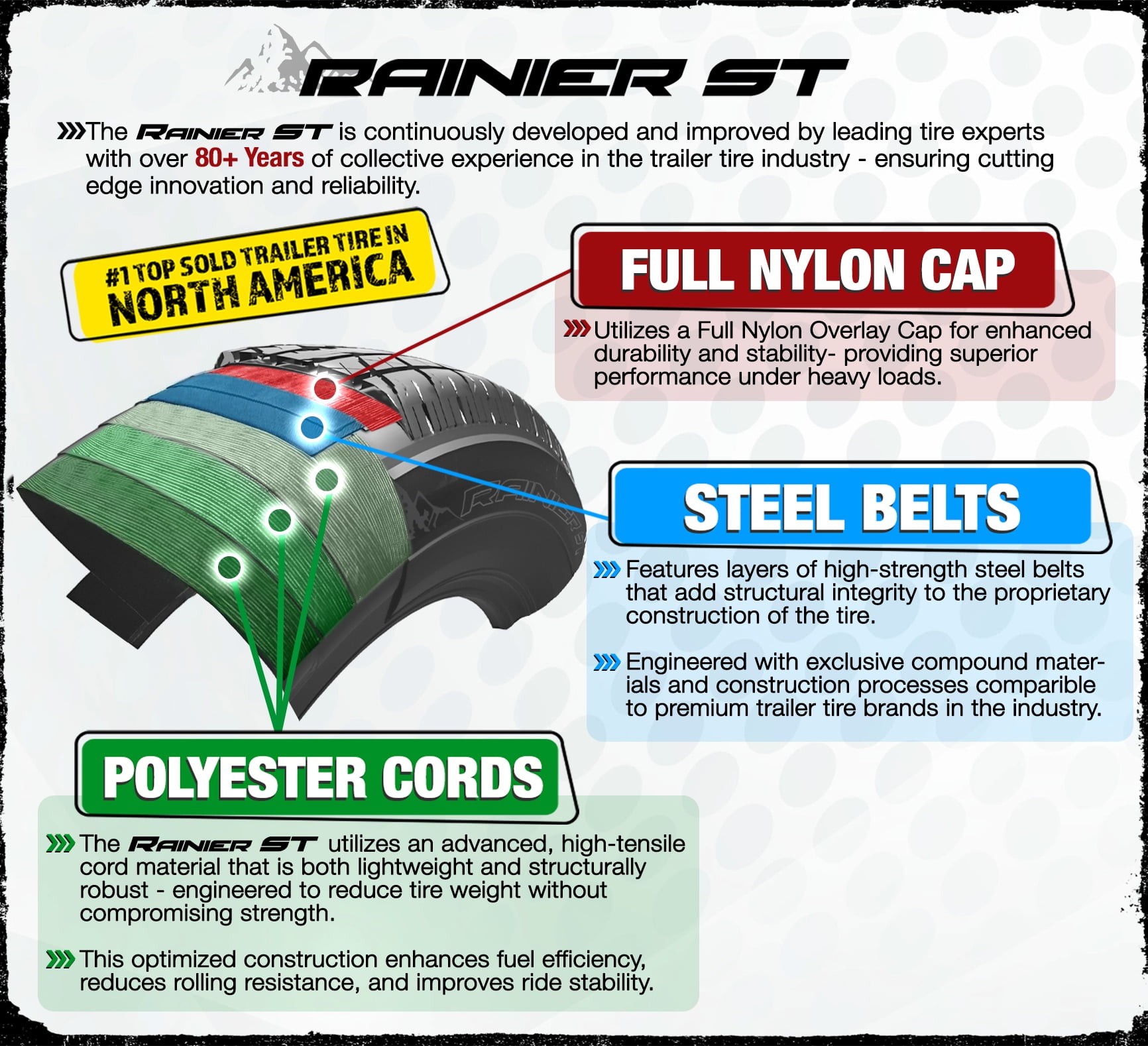 Tire Size: 225/75R15 Load Range: D Tire Weight Rating: 2540 Lbs. Max. Pressure: 65 PSI Bolt Configuration: 6 Lug 5.5″ Center – See diagram for fitment Best Quality Tire – 6 Year Limited Warranty With Free Roadside Assistance Proprietary Scuff Guard Design: Features a uniquely engineered sidewall with a built-in scuff guard – designed to protect against curb and road damage where it matters the most – on the outside of the tire Extra Thick Rubber: Incorporates more rubber in the sidewall than standard trailer tires to achieve its bold visual profile and added durability Construction: Utilizes a full nylon overlay cap for enhanced durability and stability – providing superior performance under heavy loads Steel Belts: High strength steel belts add structural integrity to the proprietary tire construction Polyester Cords: An advanced, high-tensile cord material is lightweight and robust to reduce tire weight without compromising strength. This enhances fuel efficiency, reduces rolling resistance and improves ride stability Tread Depth: The 8/32″ tread is optimized for trailer stability, tread wear, heat dissipation, fuel efficiency, load performance and tread longevity