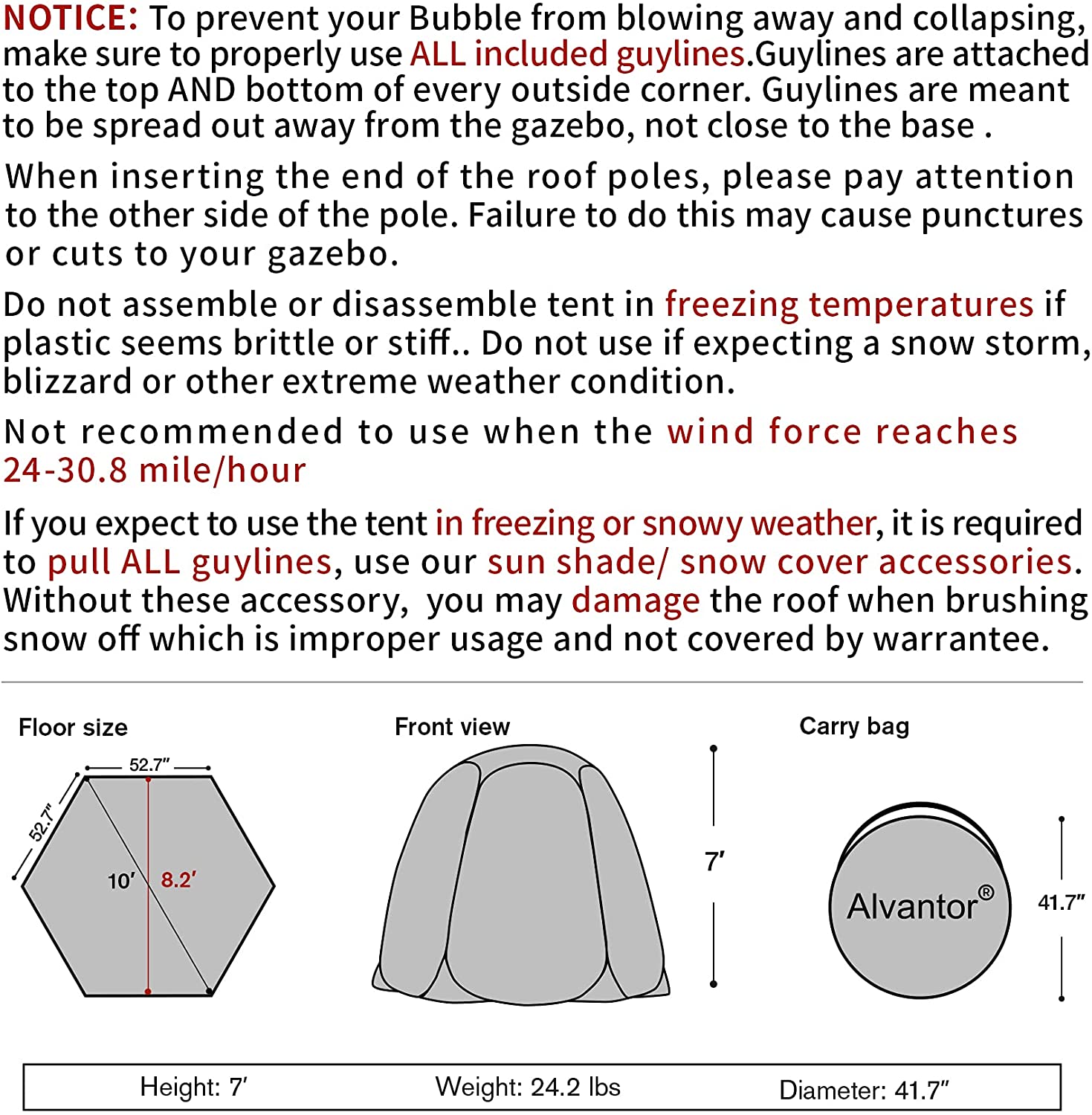 - PROTECTED ALVANTOR DESIGN: This winter screen house measures at (Width: 10’, Depth: 10’, Height: 7’) and comes with a compact carry bag. Weighing just 24 lbs, this pop up igloo tent has an innovative folding technique making it easy to fold down and store back in the carry bag. Ready to go in minutes!