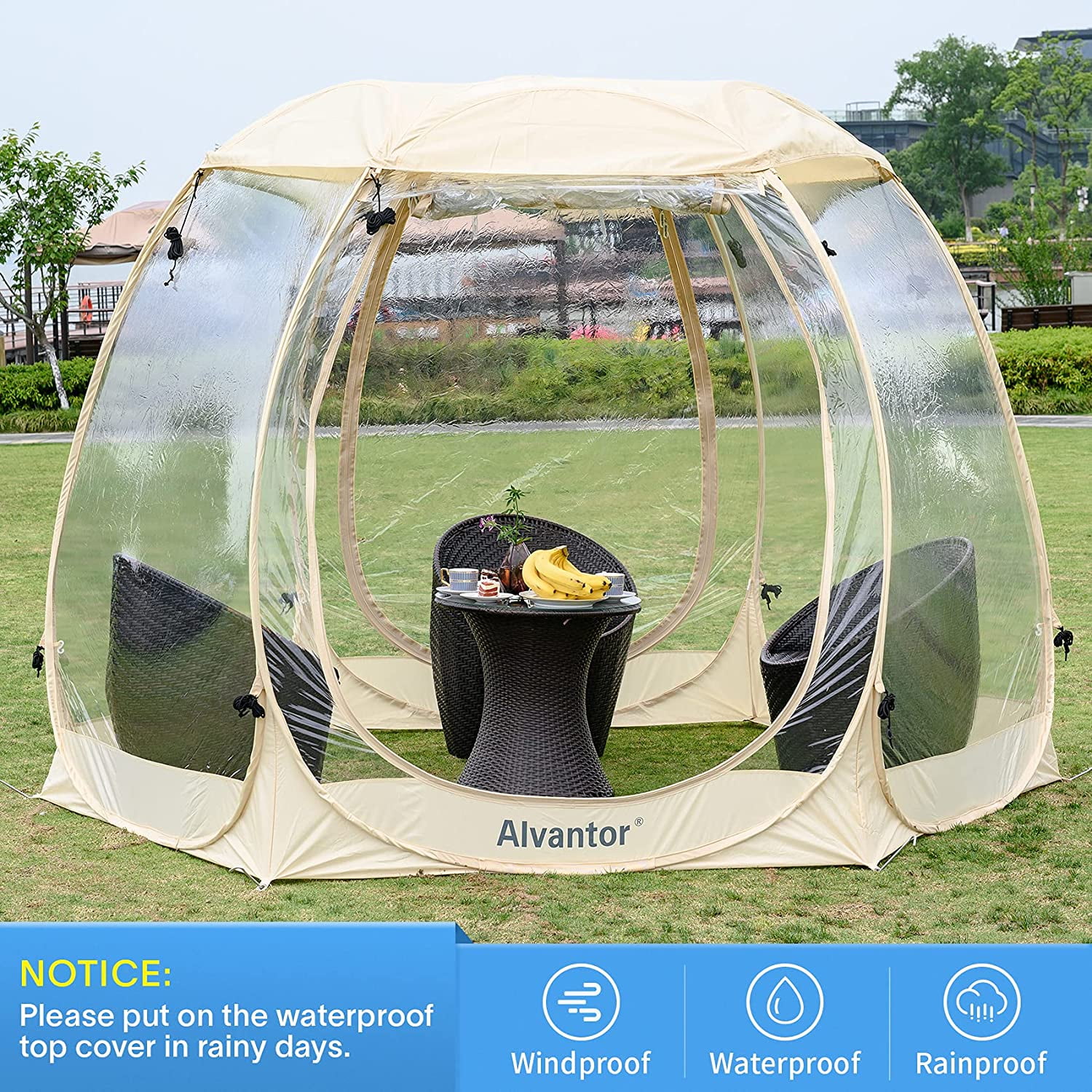 - SPACIOUS AND WARM: Alvantor big clear bubble gazebo provides a spacious interior shelter that comfortably fits between four and six adults. Enough room to place various pieces of furniture so you can give your bubble tent on clearance a homely feeling. The six, transparent PVC windows provide 360° view of your surroundings, whilst the inside of your bubble tent stays warm thanks to the excellent heat retention.