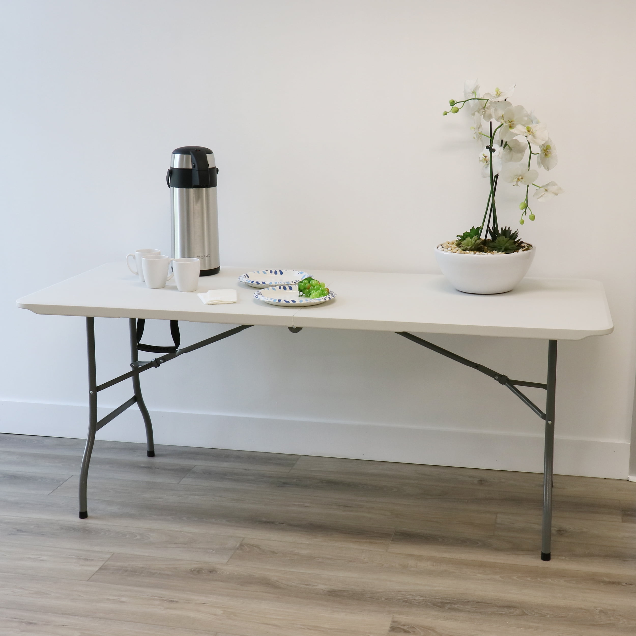 Be ready for any occasion with this Elama 6 Foot Plastic Folding Table in White. Pop out this table at anytime, easily fold it out for quick use. Nonslip feet won’t scratch your floors or patio while keeping the table in place. The plastic material with full metal frame is a breeze to clean up, perfect for serving food and using outside. When you’re done, simply pull the ring located on the inside leg and fold it flat to store it away for next time. Invite friends and family over for a nice lunch or dinner party, or break out some board games for a fun game night!